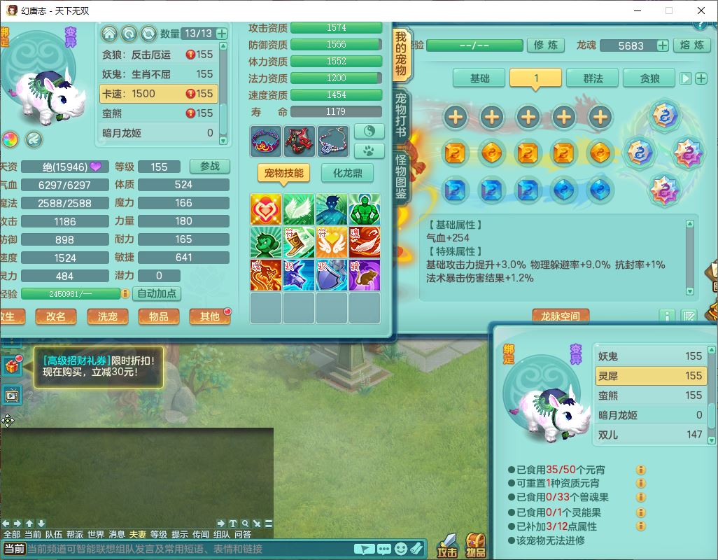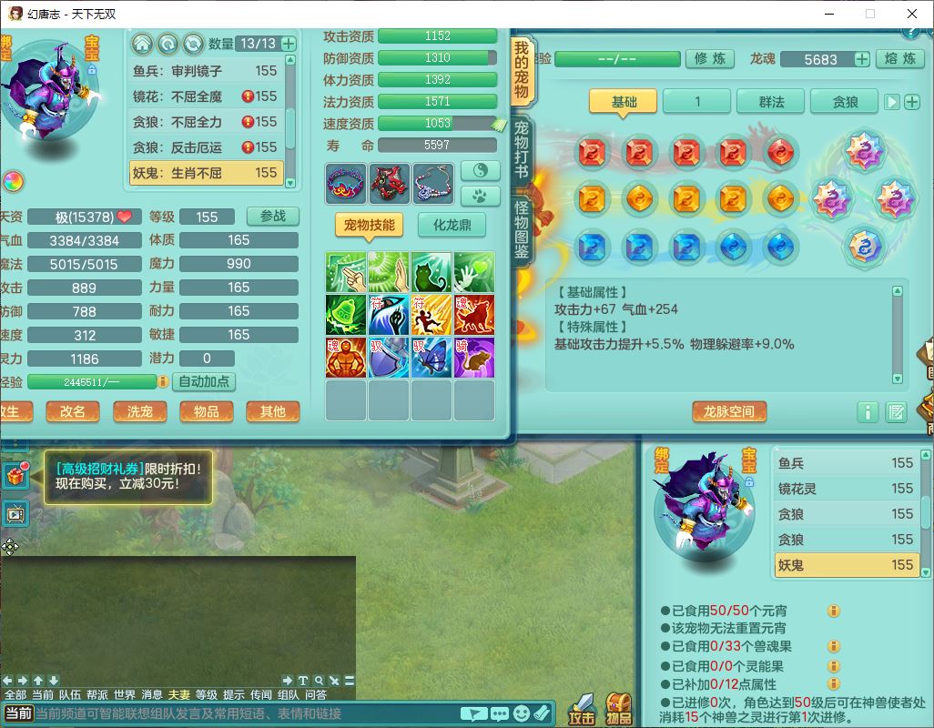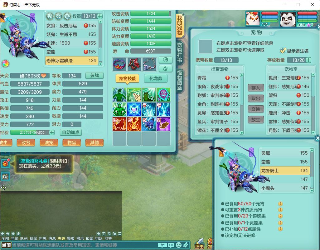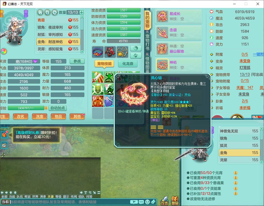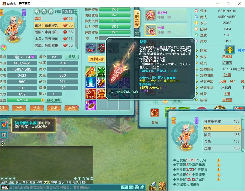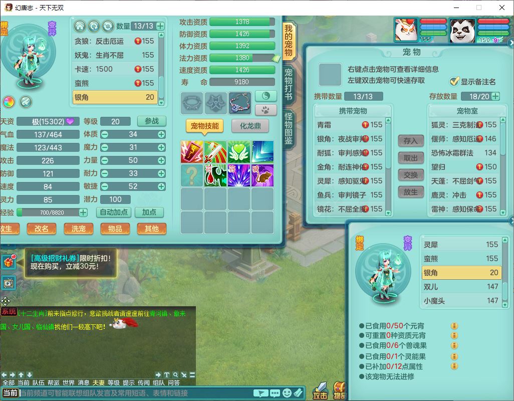 tx10528天下无双159男万兽精灵歌,1神兽(无内)1六技能镜花鱼兵1镜花,宝宝种类齐全,综合6只满果子,装备齐全,击退武器,崩山衣服,神佑项链,狂暴慈航武器,封印精通帽子,鼎5.5,2套符石,250多w神武币,33个内丹碎片,1霜鹿坐骑