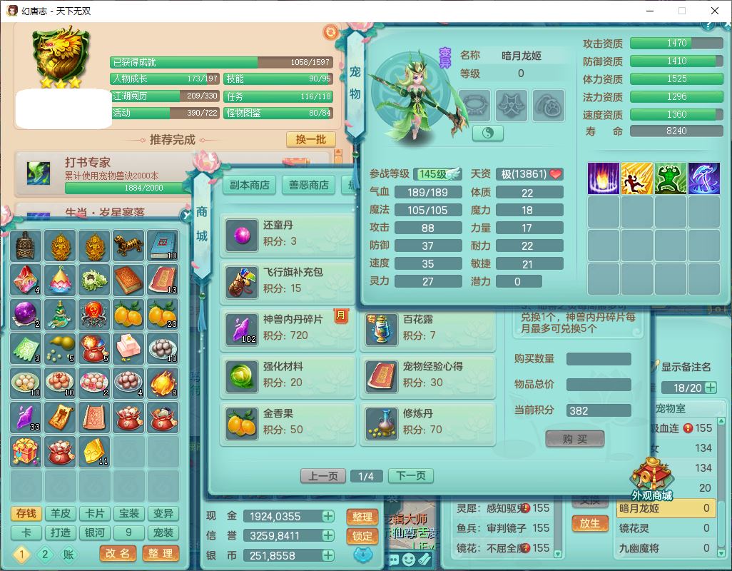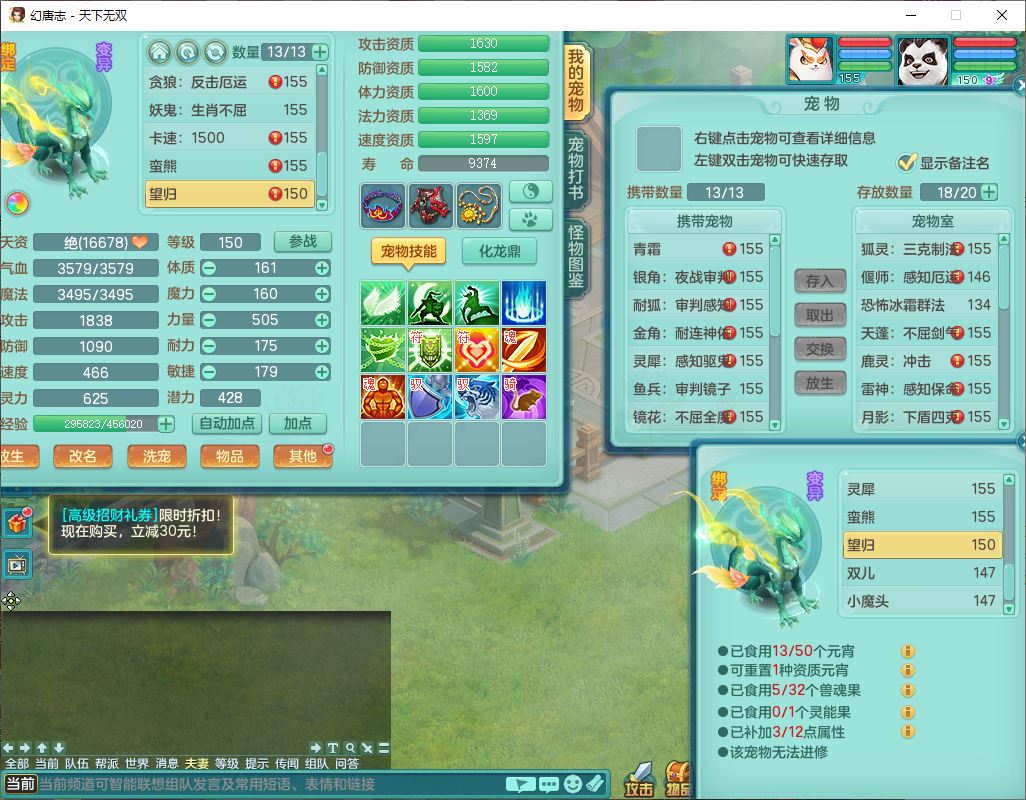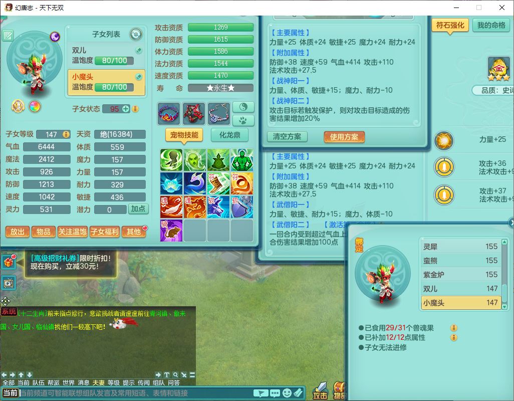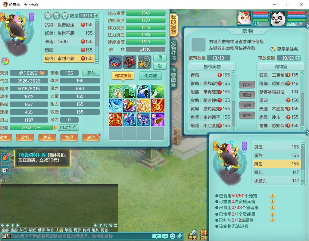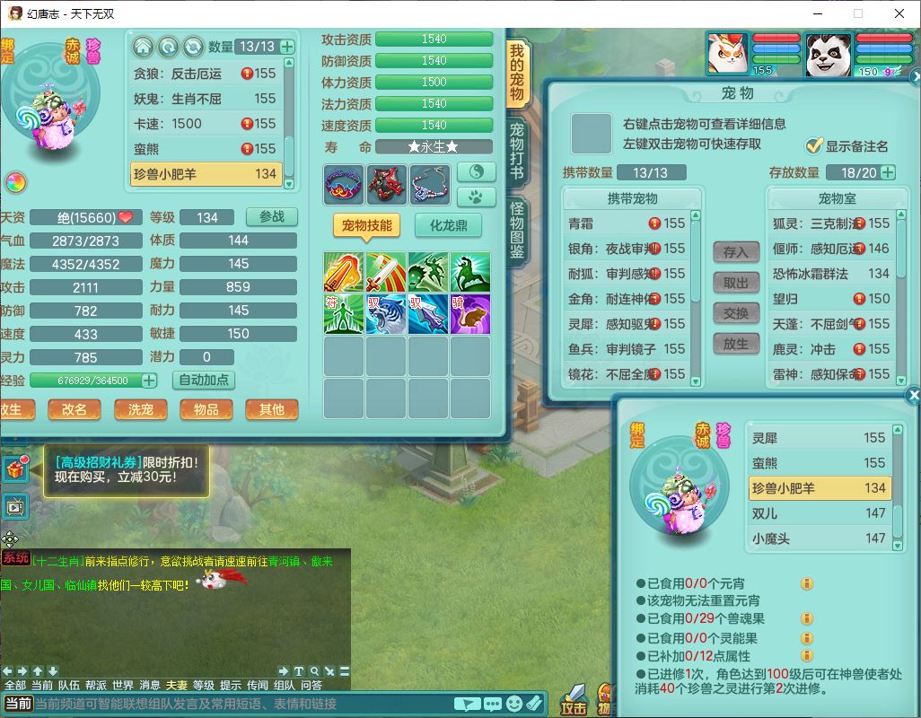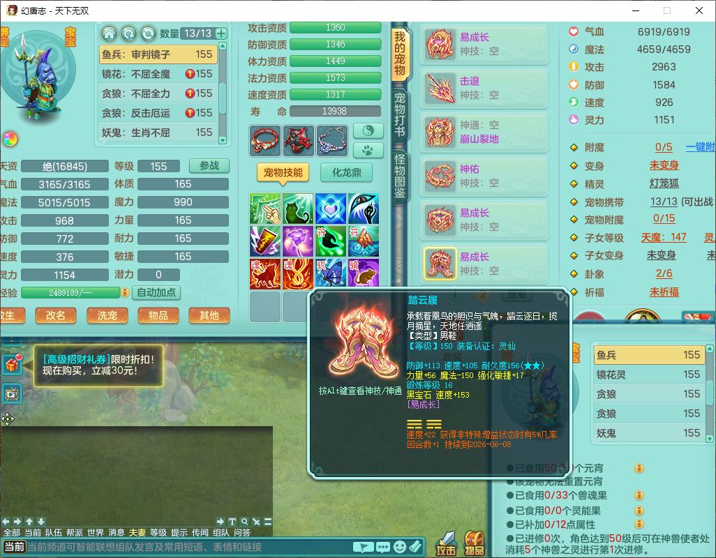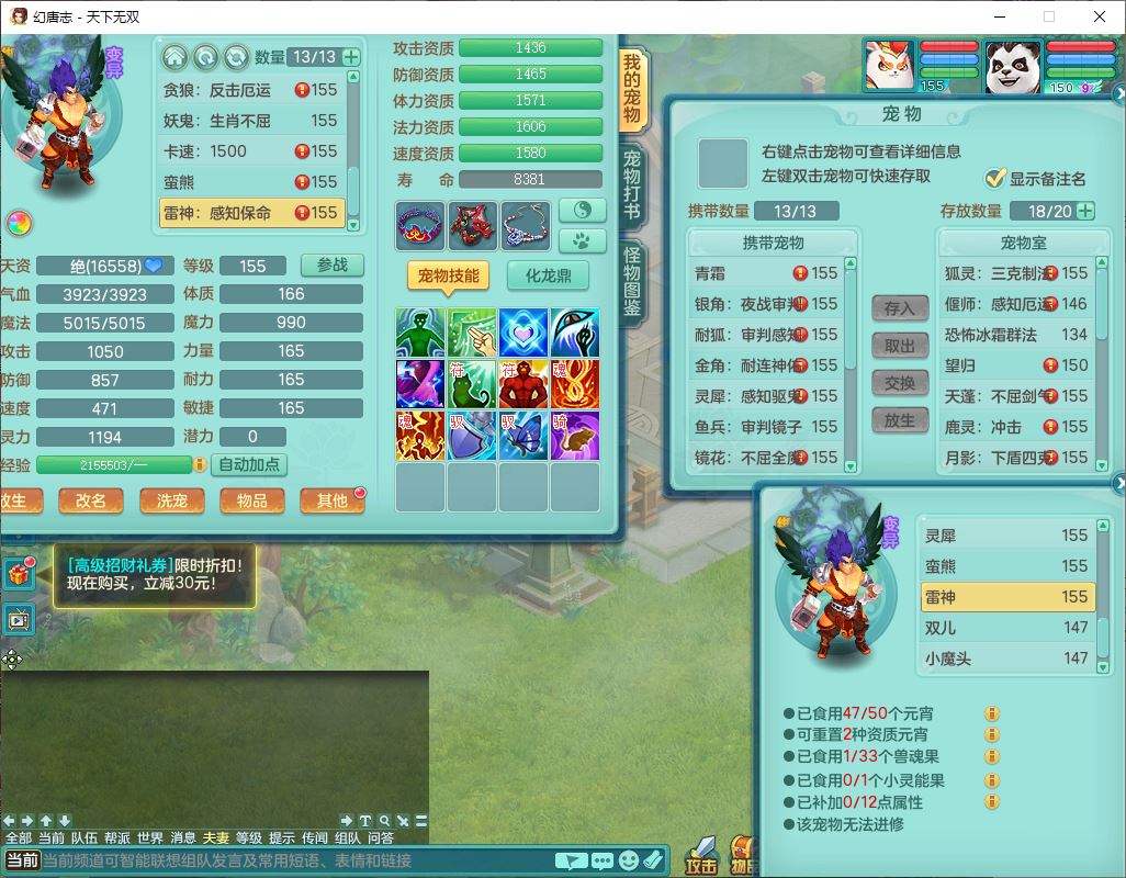 tx10528天下无双159男万兽精灵歌,1神兽(无内)1六技能镜花鱼兵1镜花,宝宝种类齐全,综合6只满果子,装备齐全,击退武器,崩山衣服,神佑项链,狂暴慈航武器,封印精通帽子,鼎5.5,2套符石,250多w神武币,33个内丹碎片,1霜鹿坐骑