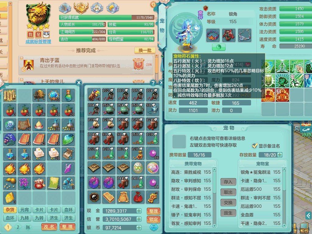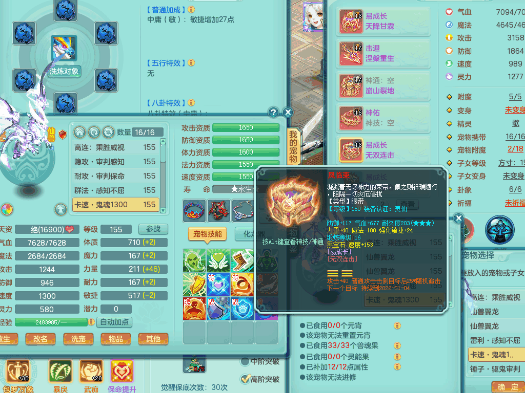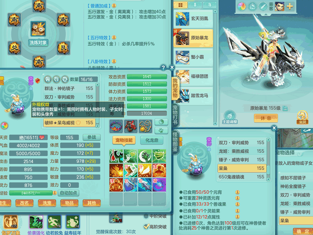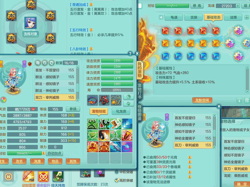 lt8105 【潜龙在渊】浪淘沙159男五庄,精灵歌,5内胆龙,2内胆神+1神兽内胆,【10只觉醒,已潜龙】,8位靓号,6宠皮,3只六技能镜花灵,1只六技能龙姬,2特殊(双星,青霜),神佑单加50项链,易成长晶清单加53鞋子,2套装备,封印慈航单加55头,5.5基础鼎+70攻+280血,15个格子,8个纯六字,5个五字,22只满果子,宠排在榜,经验修炼成就在榜,原始暴龙泰坦+洪荒+西瓜冰武器,带161天月卡。2980邮箱