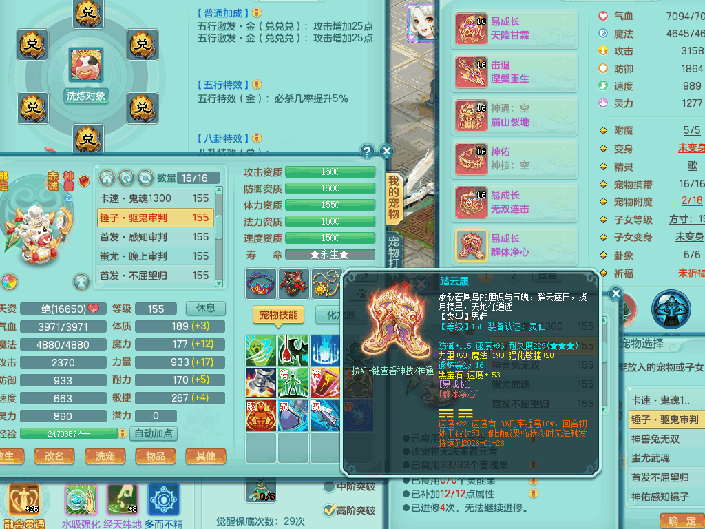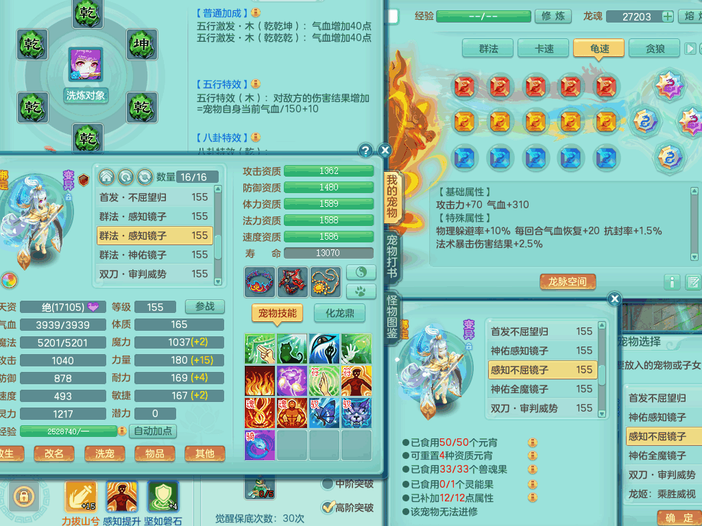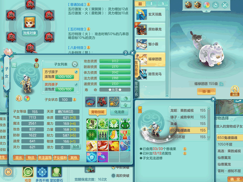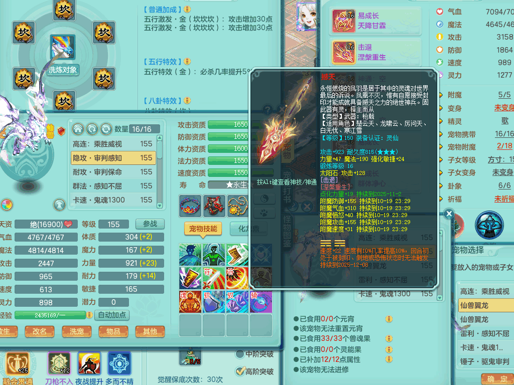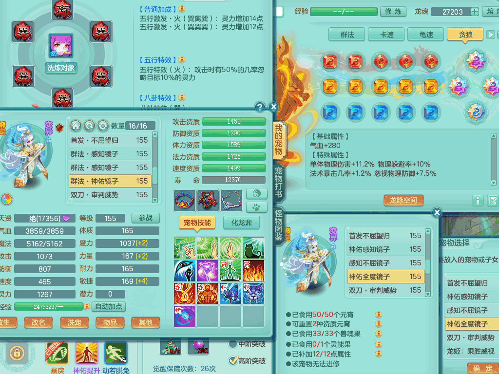 lt8105 【潜龙在渊】浪淘沙159男五庄,精灵歌,5内胆龙,2内胆神+1神兽内胆,【10只觉醒,已潜龙】,8位靓号,6宠皮,3只六技能镜花灵,1只六技能龙姬,2特殊(双星,青霜),神佑单加50项链,易成长晶清单加53鞋子,2套装备,封印慈航单加55头,5.5基础鼎+70攻+280血,15个格子,8个纯六字,5个五字,22只满果子,宠排在榜,经验修炼成就在榜,原始暴龙泰坦+洪荒+西瓜冰武器,带161天月卡。2980邮箱