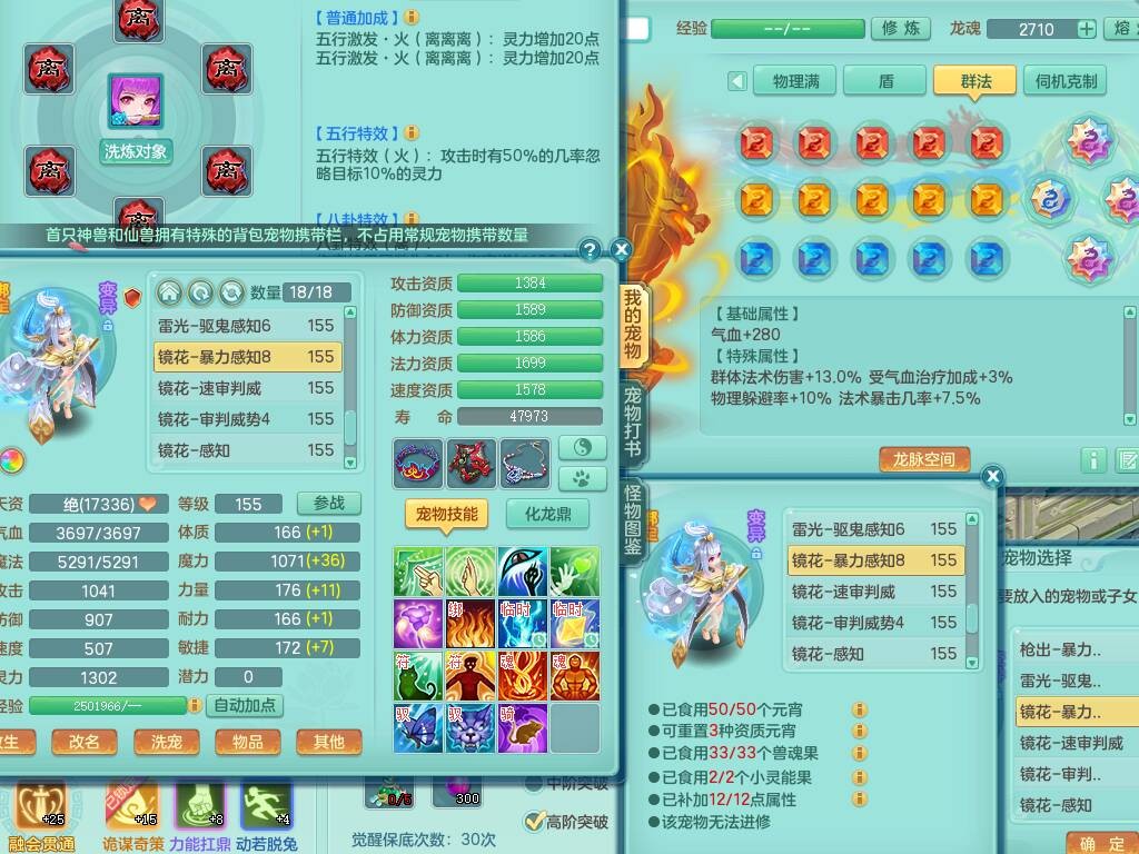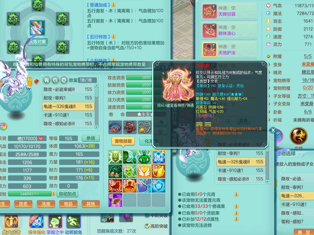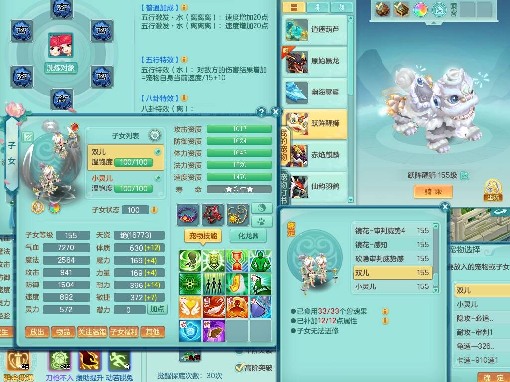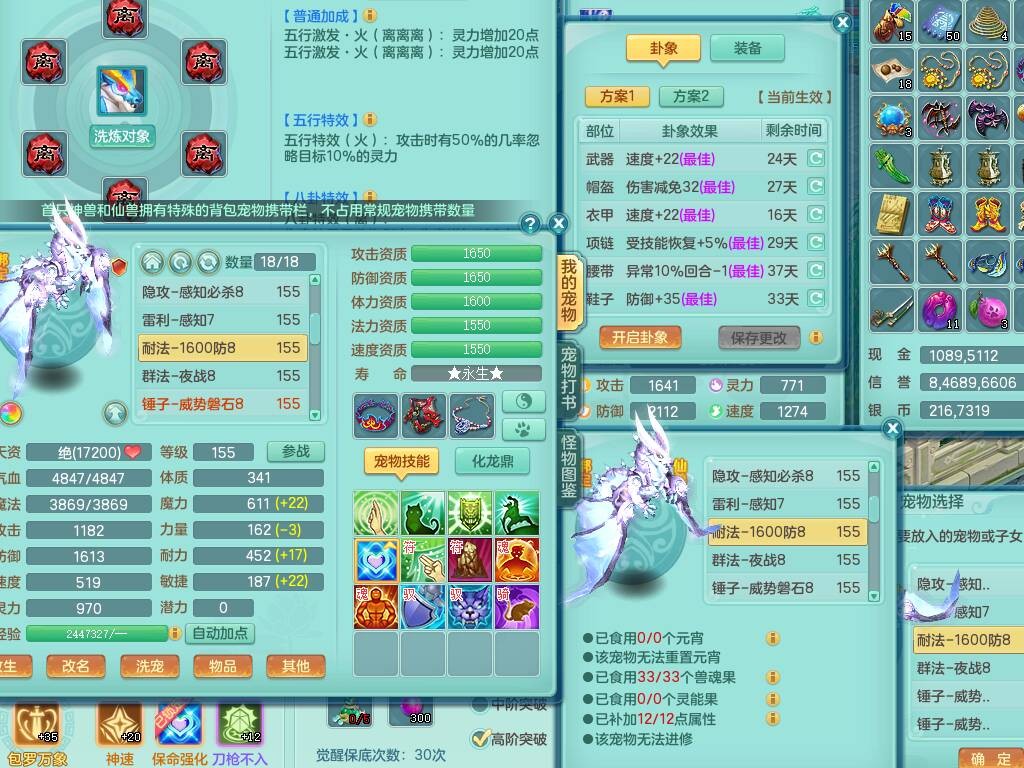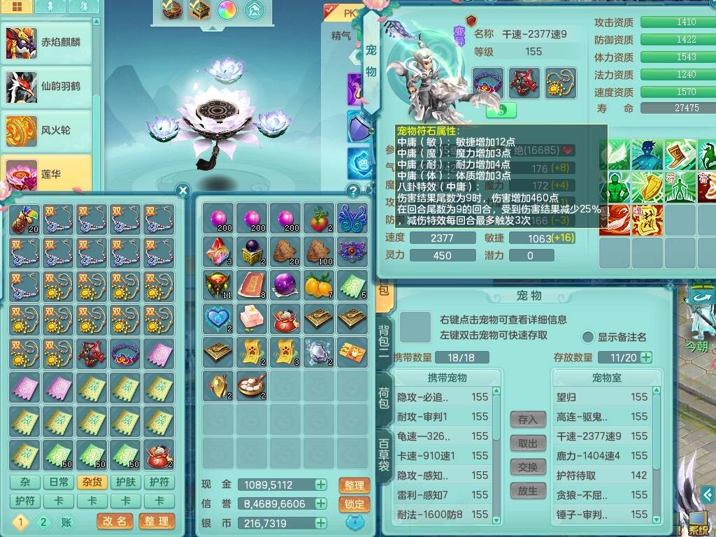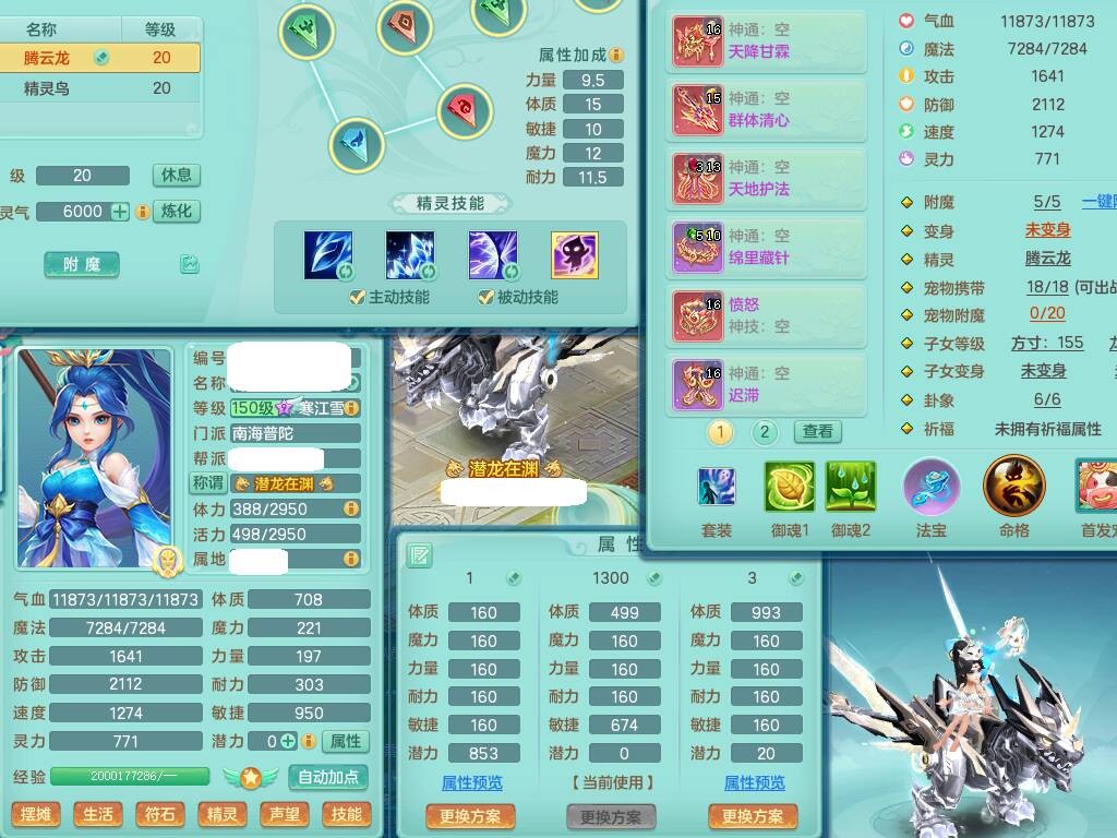 sn8757 【潜龙在渊】 少年游159女普陀,精灵舞,8龙1龙皮,4内胆神,2破镜,【13只觉醒,已潜龙】,4位靓号不含4,3宠皮,5只六技能镜花灵,2特殊(雷光,怒破),愤怒五特,5.5基础鼎+70攻+280血,15个格子,26个纯六字,27只满果子,宠排经验修炼成就都前排,永久称谓,9个坐骑,暴龙泰坦+西瓜冰,冰晶庭院,带134天月卡,3.2万金币,216万神武币。带3个150奶粉。 2980邮箱