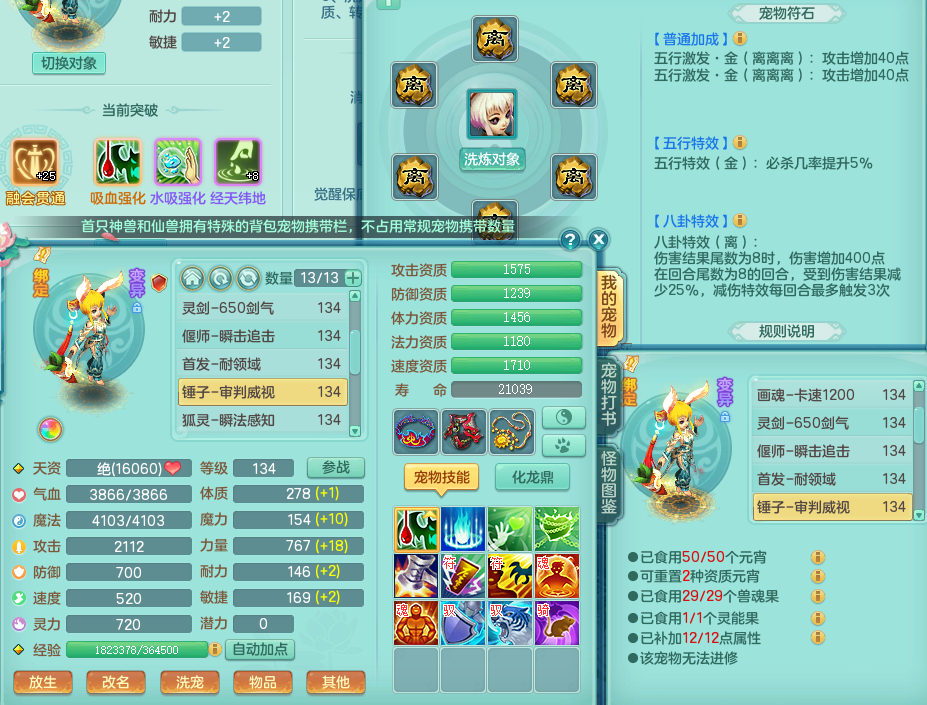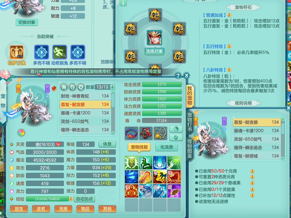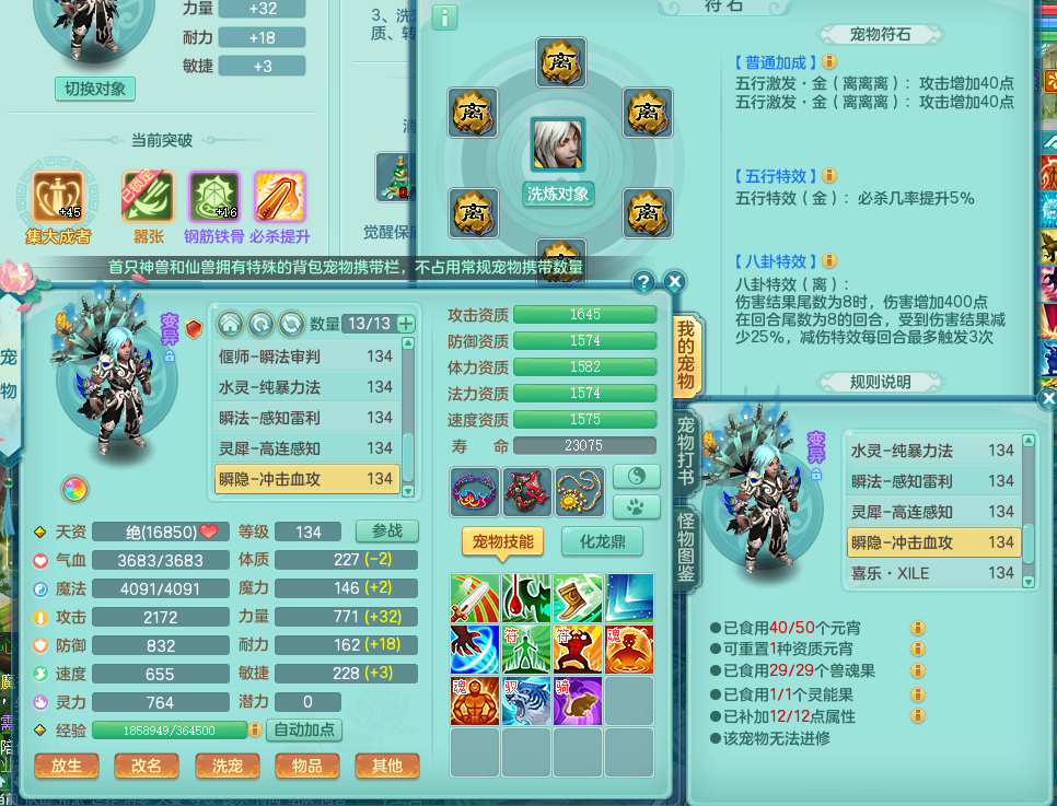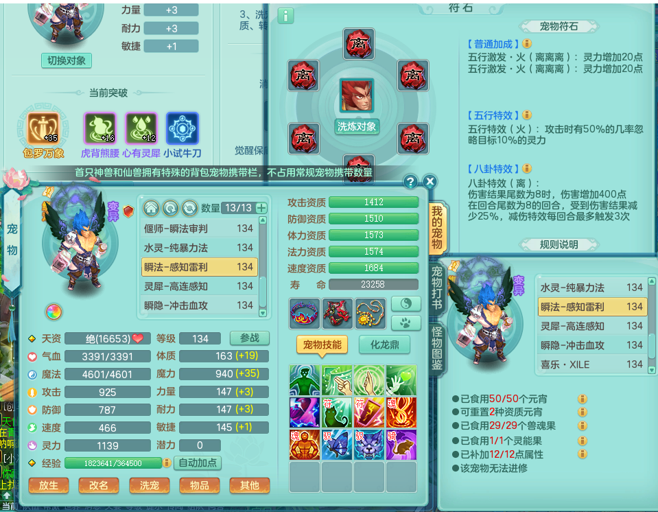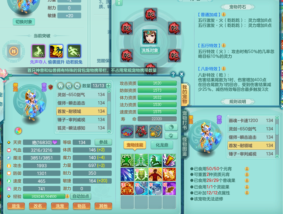 jx8854 【潜龙在渊】锦绣河山 129万兽 双人坐骑 精灵歌 满星穹 。鼎4.0基础。7.5法爆 1龙无内 1内神 13个纯6字,全部离坎,就一个法师是兑。10觉醒。身上毕业辅助装备。有效双红。 QQ邮箱