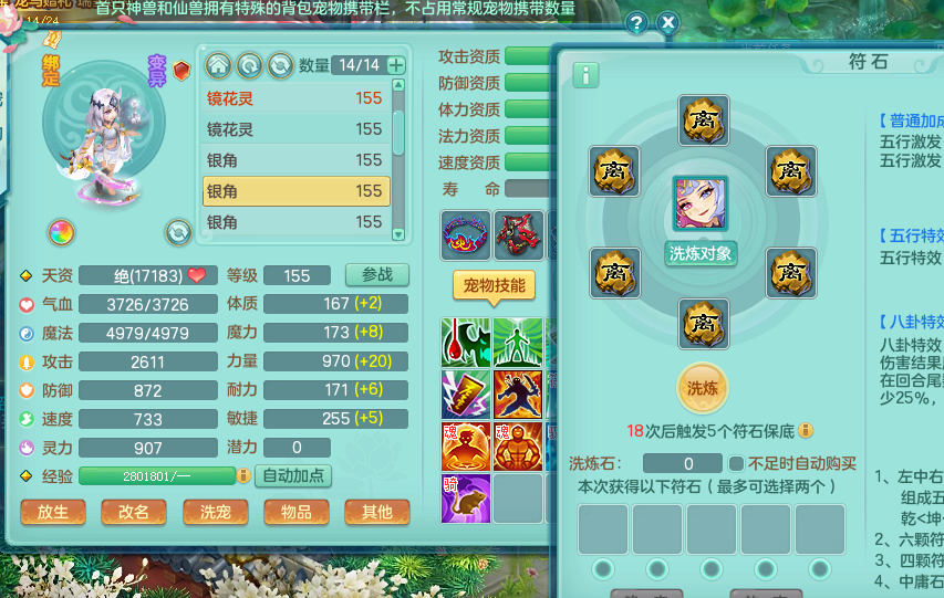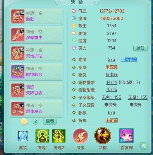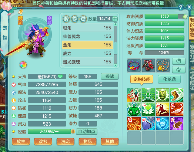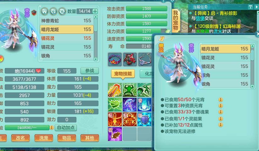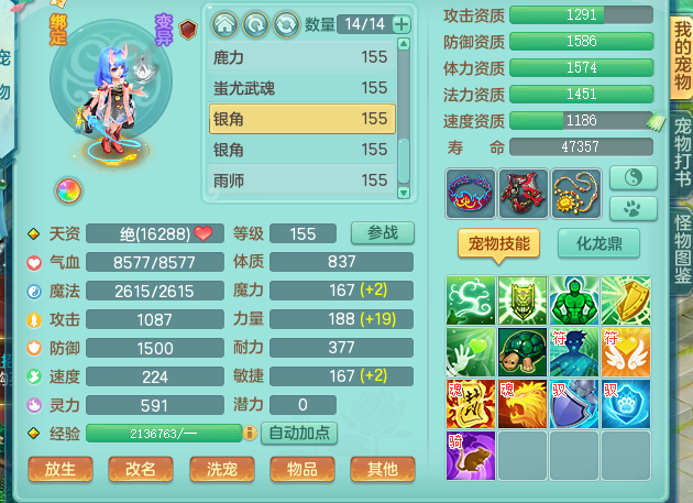 zw8870 【潜龙在渊】 战无不胜159男天宫,精灵舞,2龙1内胆神,7觉醒,6宠皮,7特殊(2锤子,舍身,翻江,善恶,雷厉,坠天),2只6技能镜花灵,1只六级能龙姬,6.0基础鼎+70攻,280血,物理躲避10%,7个纯六字,4个5字,12只满果子,修炼在榜,背包54仙兽蛋,2只双人坐骑,1只新坐骑原始暴龙,月卡还有95天。带2个150奶粉。 qq邮箱