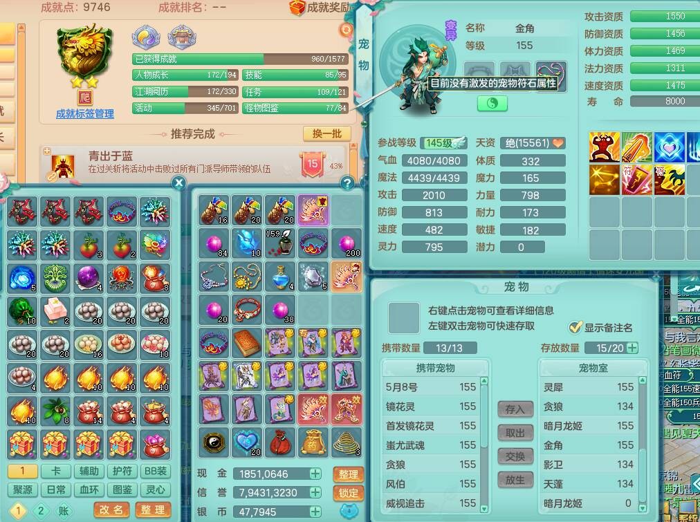 jt8881 【潜龙在渊】九天揽月159男天魔,精灵歌+舞,7龙1龙皮,4内胆神,【7只觉醒,已潜龙】,4位靓号不含4,4宠皮,1只六技能龙姬,5只六技能镜花灵,1特殊(止戈),三红幸运8封锁迟滞武器,愤怒五特,5.5基础鼎+70攻+280血,9个纯六字,1个五字,综合20只满果子,宠排在榜,8个坐骑,原始暴龙泰坦+西瓜冰,带87天月卡。➕159男盘丝,精灵舞,1内胆神,1只觉醒,2只六技能镜花灵,5.0基础鼎,2个双人坐骑。 qq邮箱