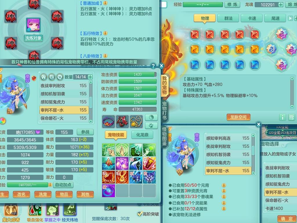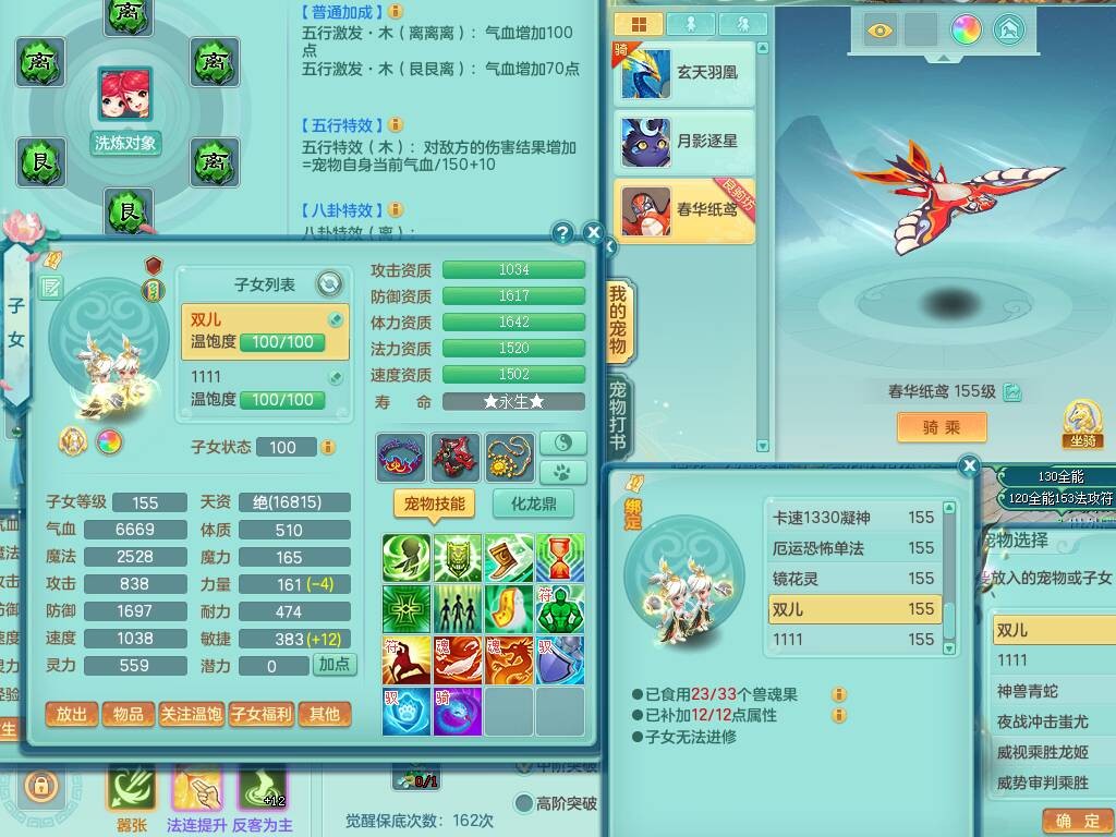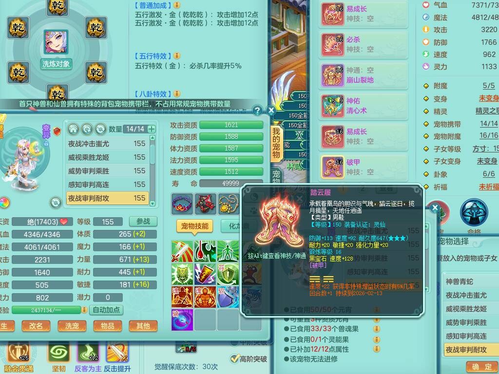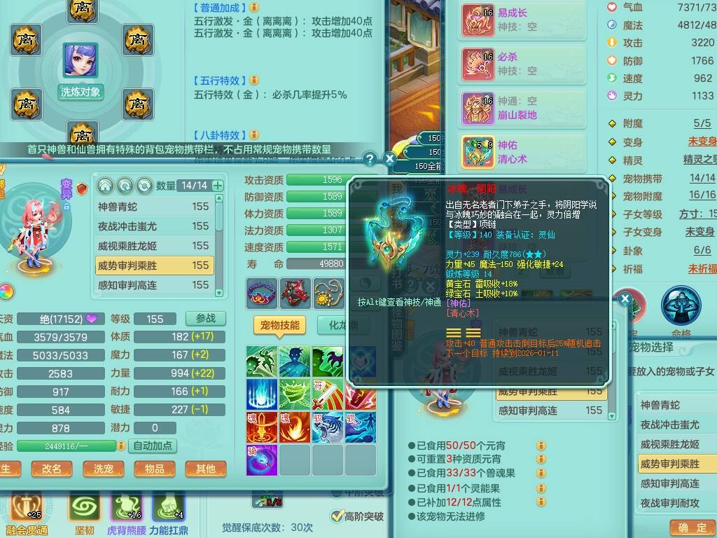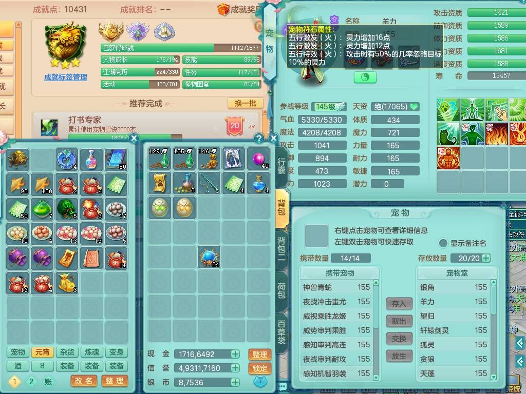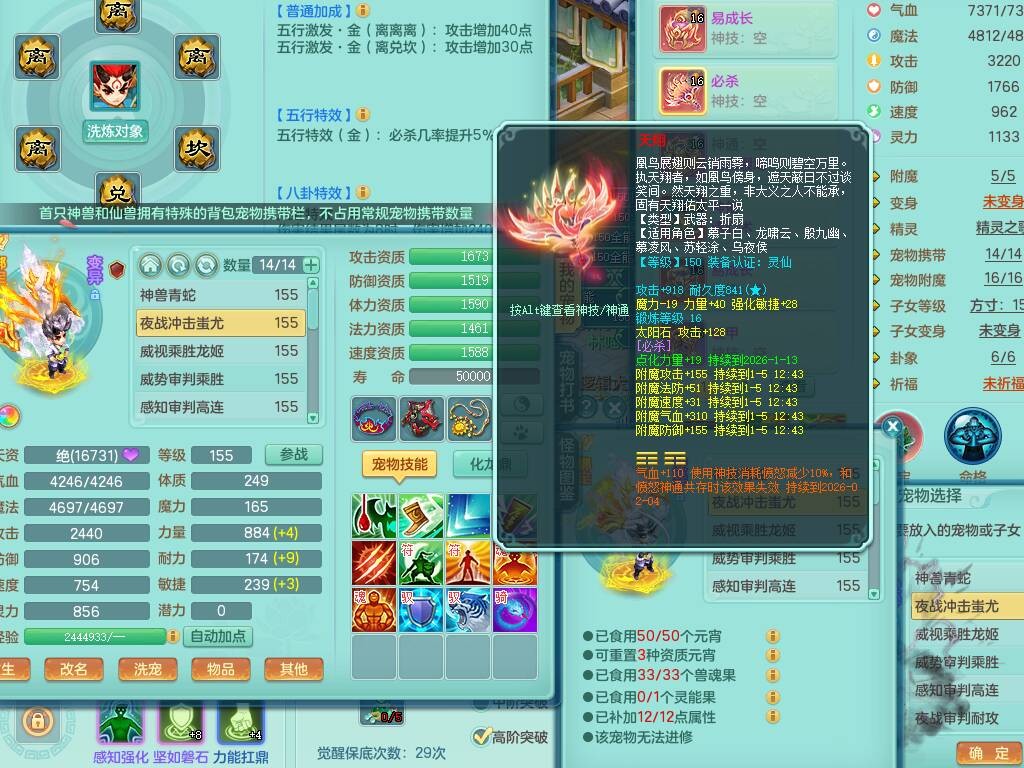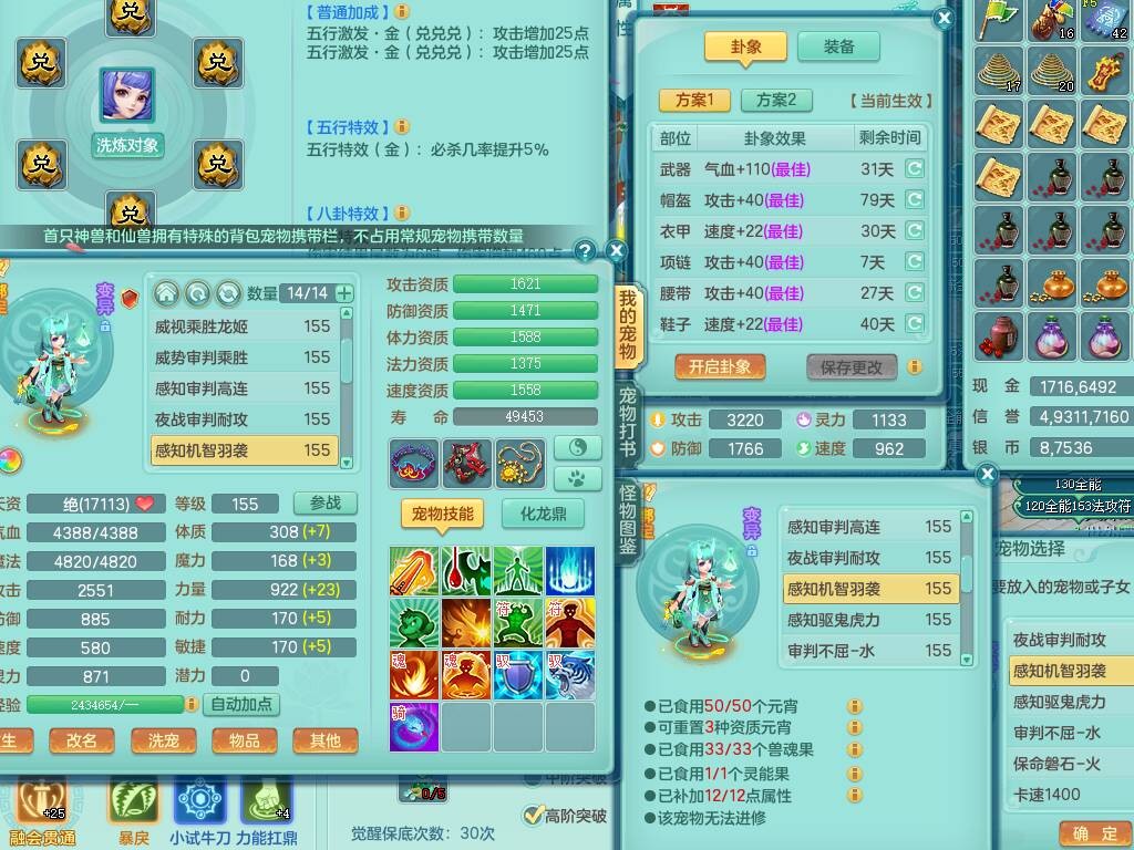 fc8971 风驰电掣159男万兽,精灵歌,1内胆神,1破镜,【8只觉醒,已潜龙】,2宠皮,3特殊(羽袭,藕断,禁锢),3只6技能镜花灵,1只6技能龙姬,918必杀单加武器,崩山单加衣服,神佑清心术单加链子,破甲鞋子,5.5基础鼎+70攻,280血,物理躲避10%,7个纯六字,综合16只满果子,双人坐骑,月卡还有91天。2980邮箱