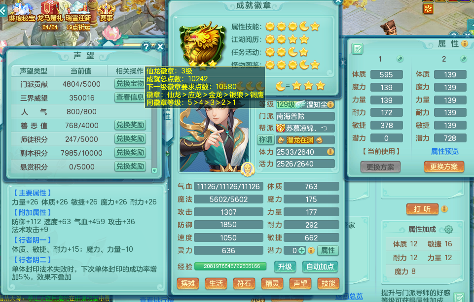 jt9002 【潜龙在渊】 九天揽月 129 男 普陀 愤怒6特 回春双红 愤怒止戈腰带 迅捷天地鞋子 4位靓号 4.0化龙鼎毕业 5内龙 2内神 5皮肤 7觉醒 7个真6字 15+满果子 双人坐骑 精灵舞+歌 满星穹 163邮箱
