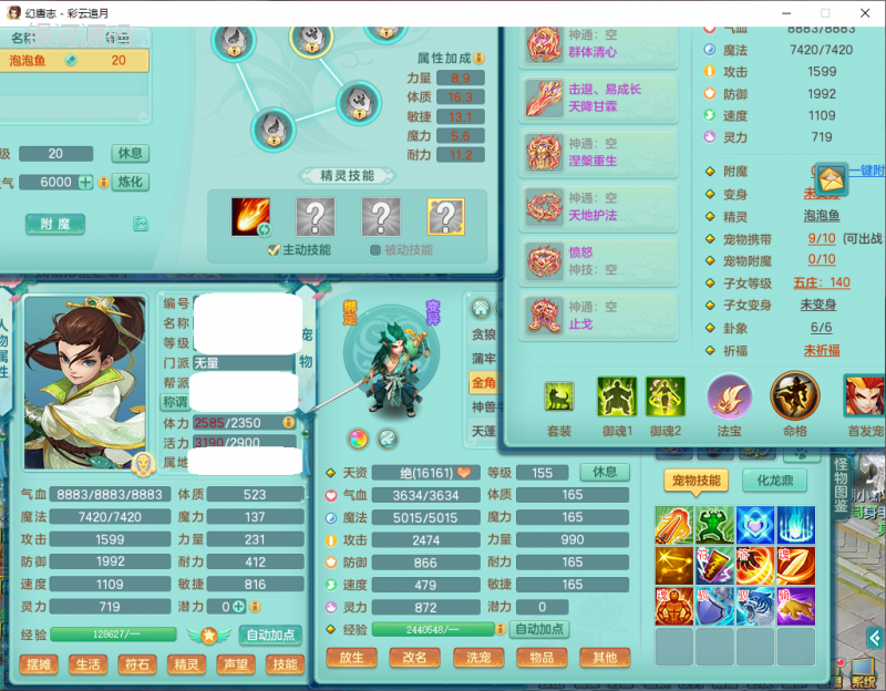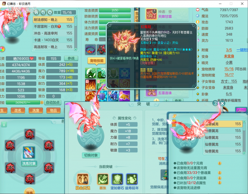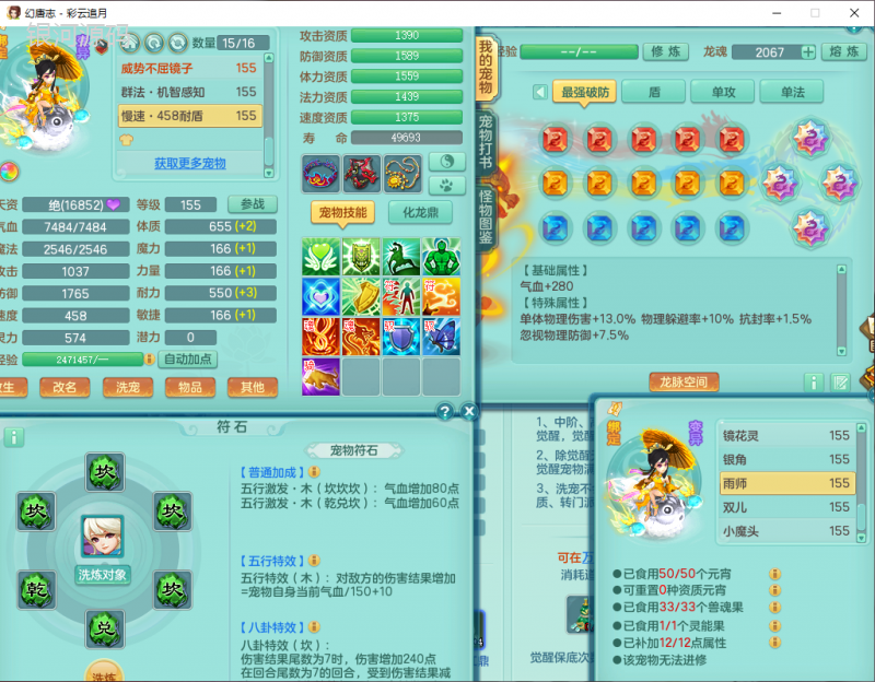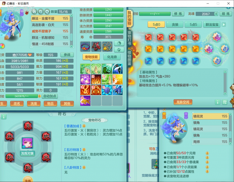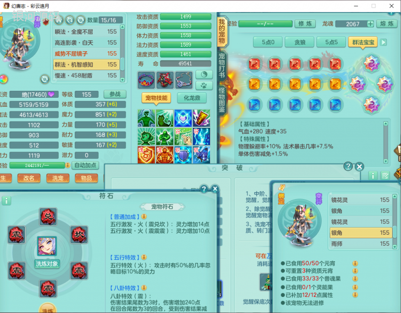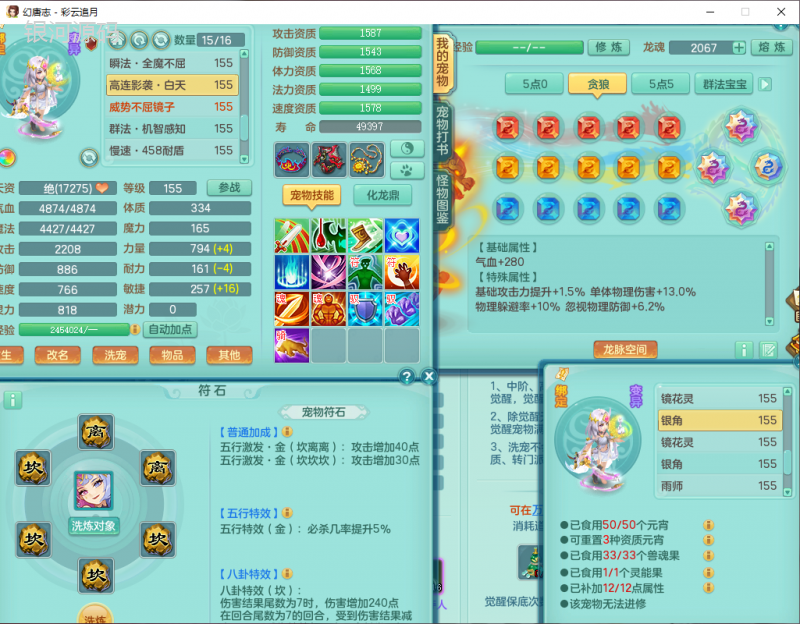 cy9040 【潜龙在渊】 彩云追月159女魔王【潜龙号】精灵舞,4位靓号,5龙(换)4内7特殊(怒破、影袭,祈雨、风卷、剑胆、月光、以战兽决)3六技能镜花(1胚子),9觉醒5宠皮,7六字1五字13四字24只满果子,16格子,全单加装备,269Y项链,五雷鞋子,有物理装,坚毅群体迟滞项链,破甲鞋子,鼎5.5+70+280,3套符石,2传说1精良法宝,40天月卡,庭院152房屋183,永久外观饰物、精灵皮肤, 3双人坐骑(1飞行),带3个150奶粉 2980邮箱