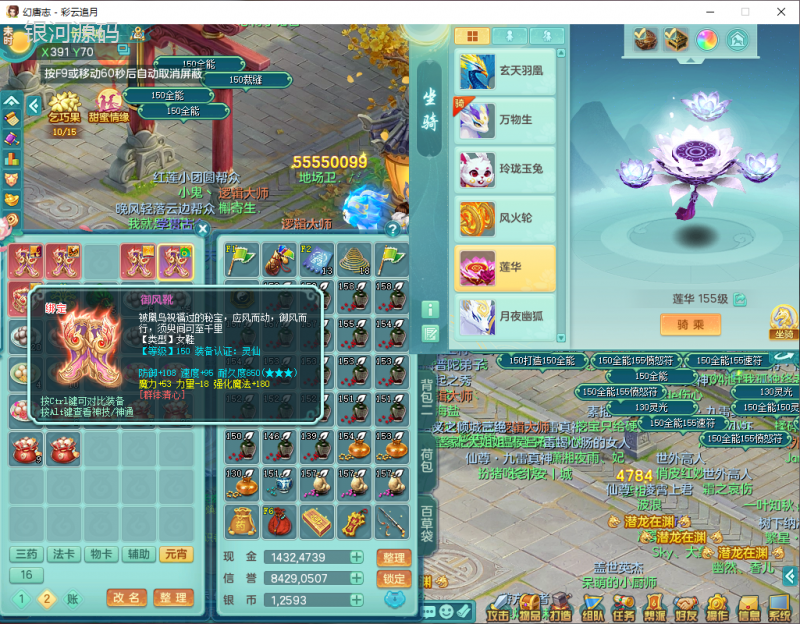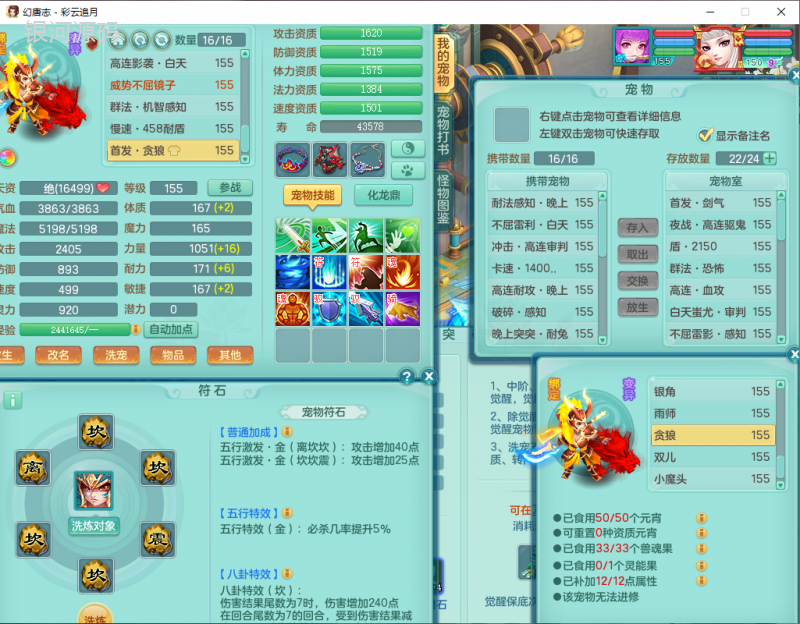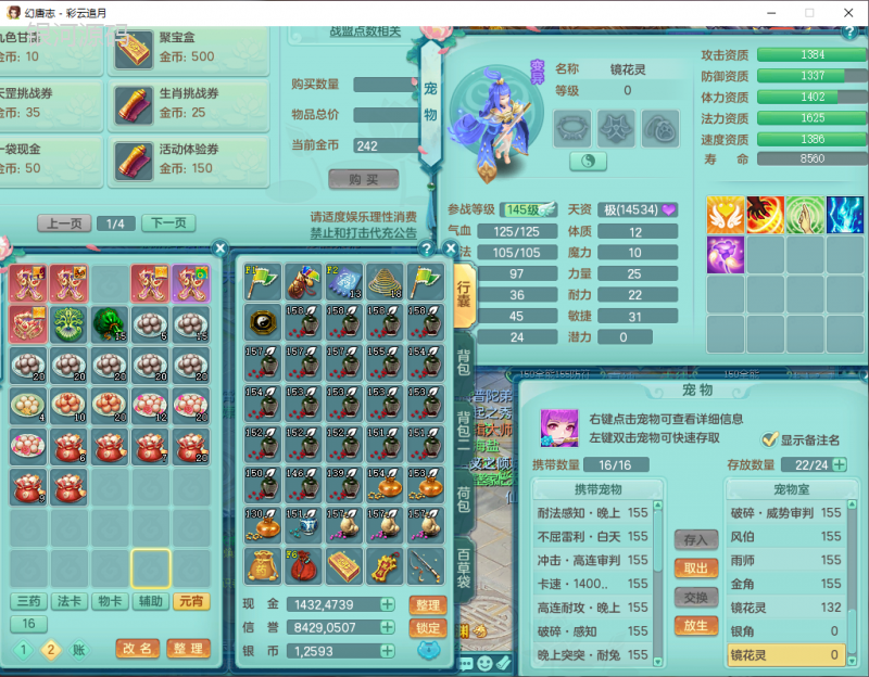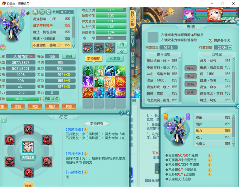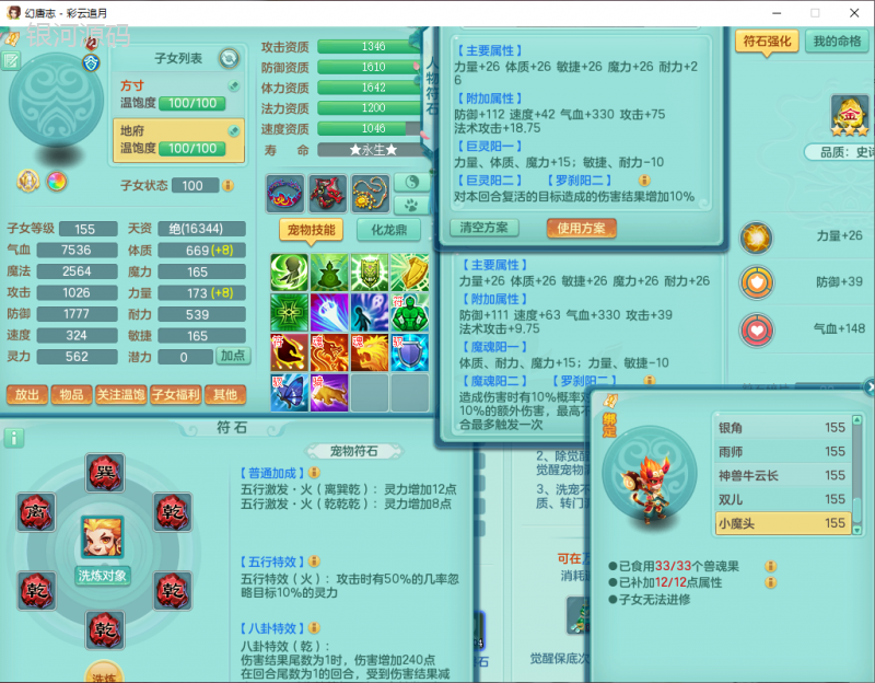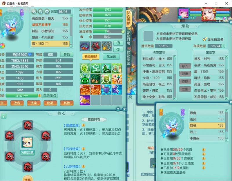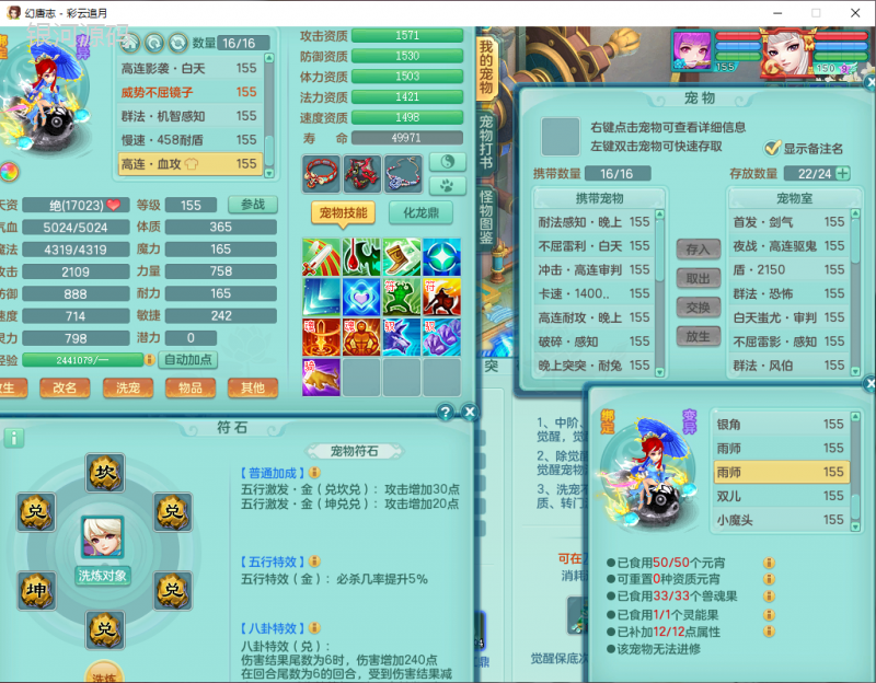 cy9040 【潜龙在渊】 彩云追月159女魔王【潜龙号】精灵舞,4位靓号,5龙(换)4内7特殊(怒破、影袭,祈雨、风卷、剑胆、月光、以战兽决)3六技能镜花(1胚子),9觉醒5宠皮,7六字1五字13四字24只满果子,16格子,全单加装备,269Y项链,五雷鞋子,有物理装,坚毅群体迟滞项链,破甲鞋子,鼎5.5+70+280,3套符石,2传说1精良法宝,40天月卡,庭院152房屋183,永久外观饰物、精灵皮肤, 3双人坐骑(1飞行),带3个150奶粉 2980邮箱