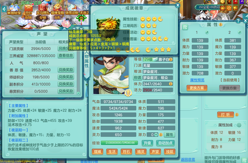 jt9127 九天揽月 129 男 无量 化龙鼎 1内神 1宠物皮肤 3觉醒 1个真6字 5+满果子 双人坐骑 精灵歌 2980邮箱 带一个129 盘丝 2980邮箱