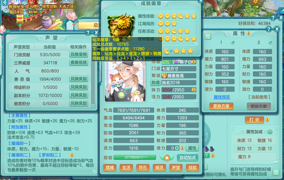 zw9166 战无不胜 159 魔FC 永久称谓 4字靓号(不带4 )2龙(全拍)1内 5特殊(破碎之锤、噬风斩、善恶、月光、灵傀逐影) 8觉醒 7六字 15个格子 3镜子1红心龙姬 距离潜龙只差3个主属性和1个附加,2000多金币 十几个满果子宝宝 宠排在榜 三开号,带俩个159成品奶粉 163邮箱