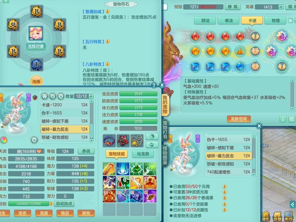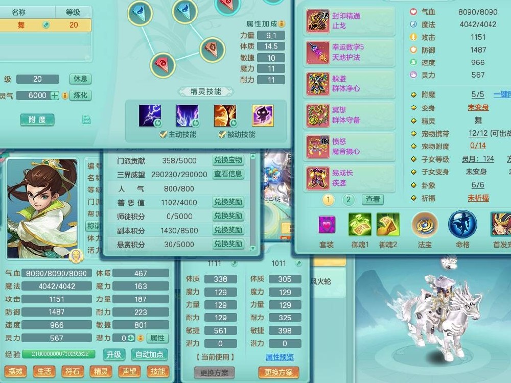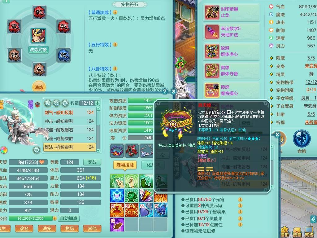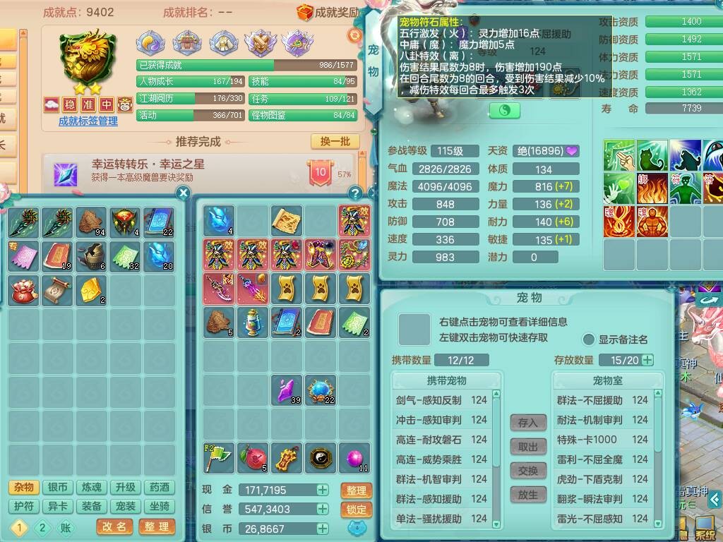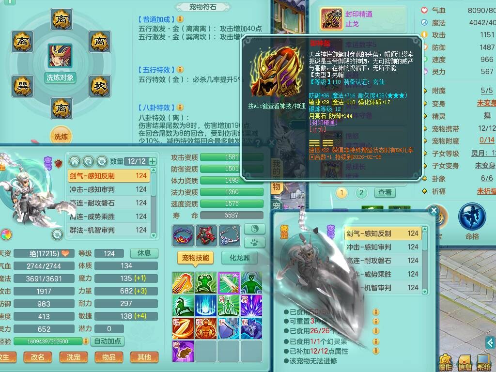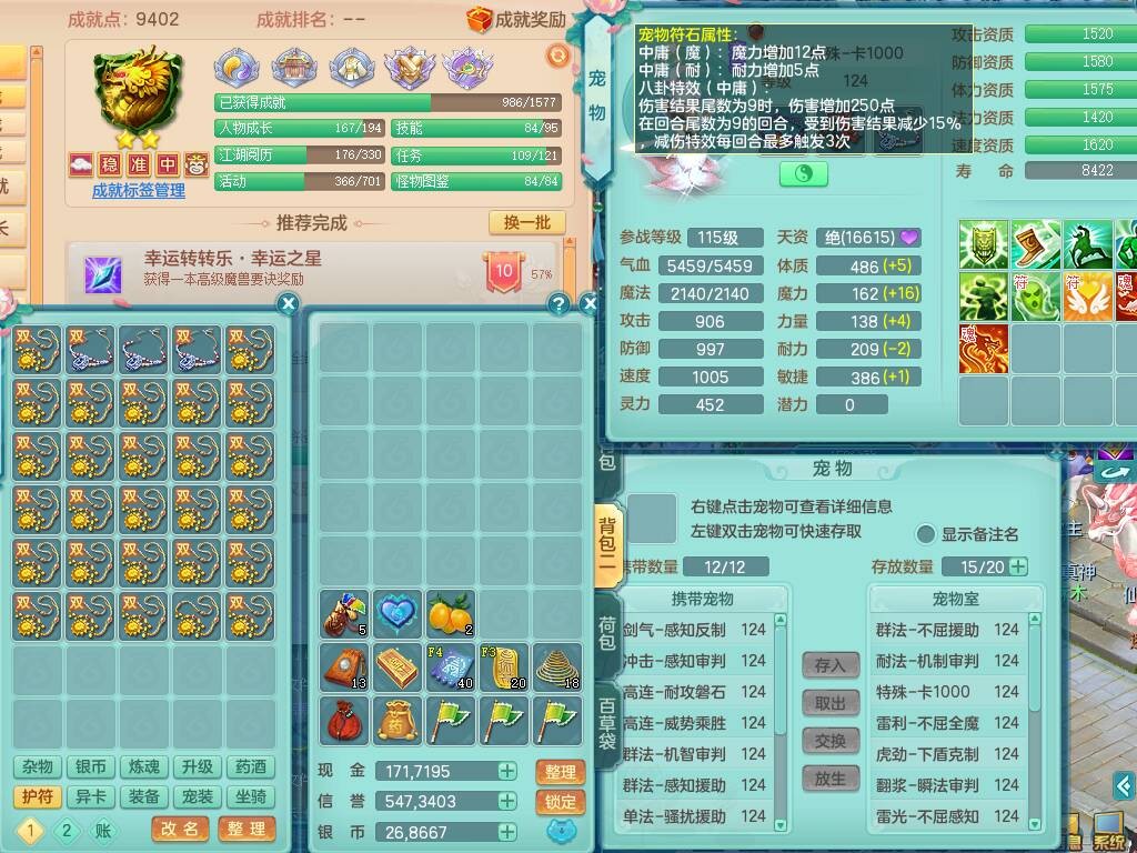 p20719少年游119男方寸,精灵舞,1神兽+背包39神兽内丹碎片,带22仙兽灵,13纯白宠皮,星辰之拥,封印精通止戈单加头,愤怒6特,双红迅捷单加鞋子,3.5基础鼎,5只满果子,宠排在榜,双人坐骑,月卡还有191天。