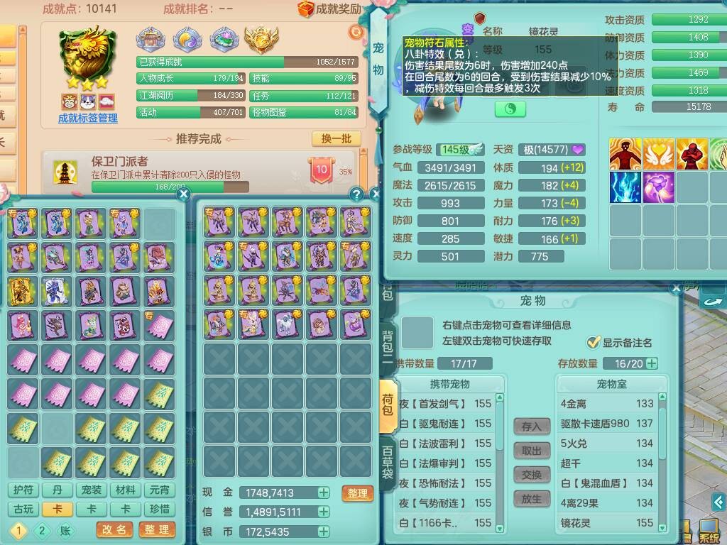 C20721少年游158男魔王,精灵怒,7龙3龙皮,3内胆神,【14只觉醒,已潜龙】,4位靓号ABAA,5宠皮+2幻灵果,3只六技能镜花灵,法爆慈航武器,268易成长回生之术单加56项链,易成长群体疾速单加56衣服,6.0基础鼎+70攻+280血,15个格子,11个纯六字,综合19只满果子,宠排在榜,永久称谓,57个仙兽灵,2个双人坐骑,有安全证书,可随时配合,介意勿扰。