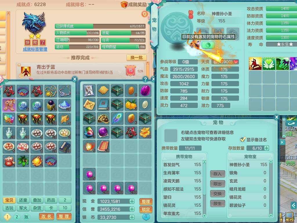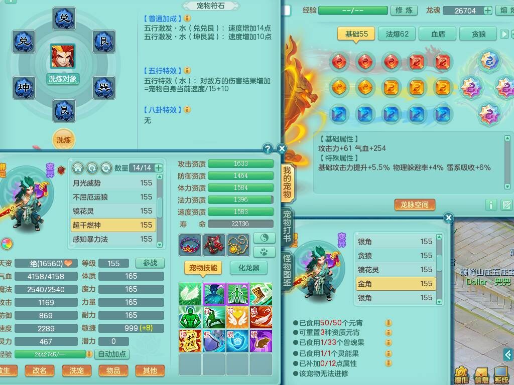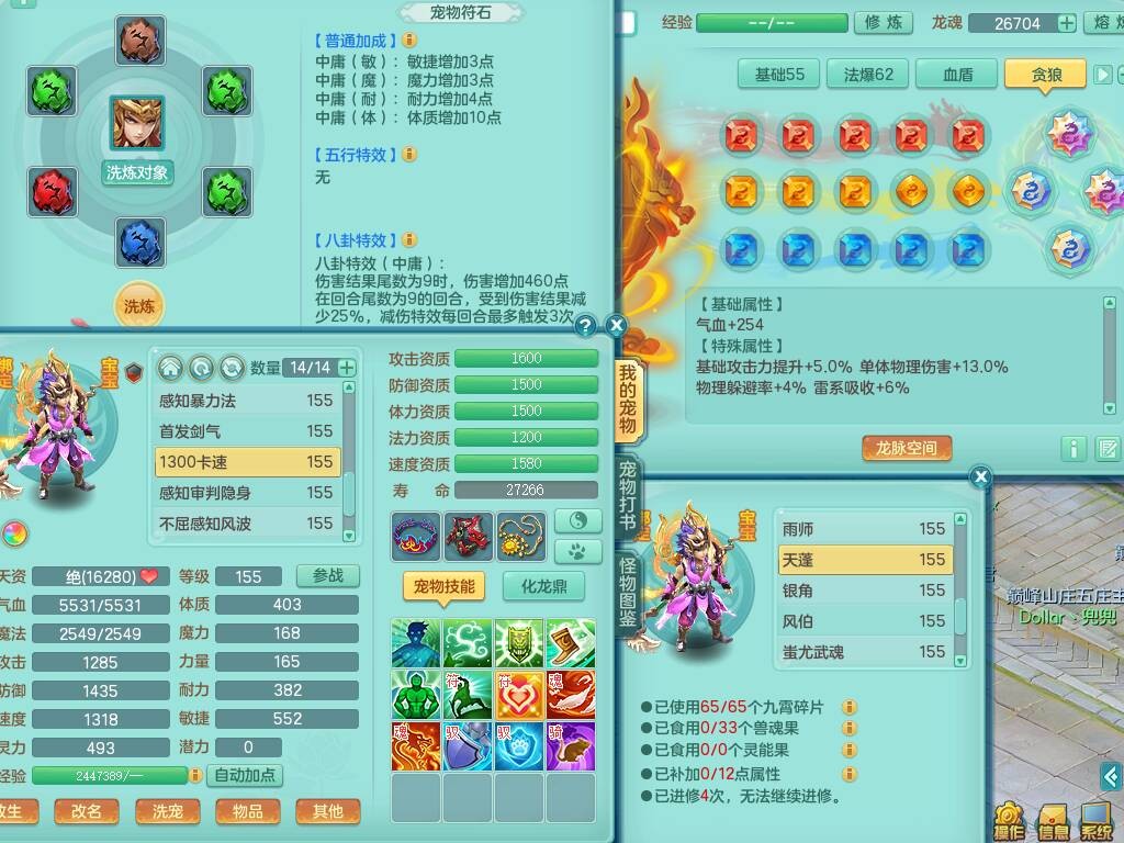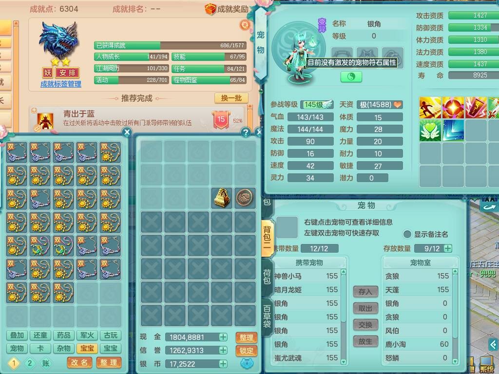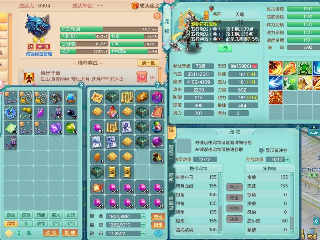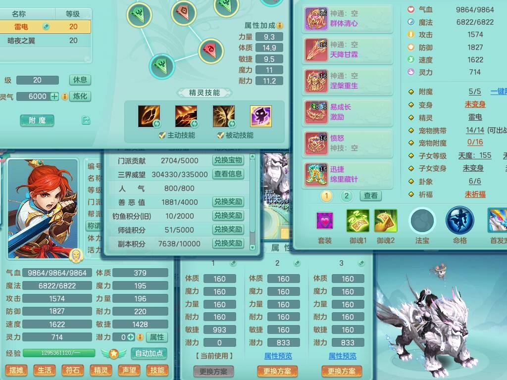 S20735江山如画四开号,159男方寸,精灵舞,1龙2内胆神,2只觉醒,2宠皮,2特殊(月光,守护),1只六技能镜花灵,愤怒5特,5.5基础鼎,2个纯六字,3个五字,8只满果子,成就在榜,双人坐骑。➕159男无量,精灵舞,2特殊(舍身,焚心),2只六技能镜花灵,回春武器,5.0基础鼎。➕159女天策,精灵舞,1只觉醒,1特殊(荒古),4.5基础鼎。➕159男万兽,精灵歌,1只觉醒,1只六技能镜花灵,5.5基础鼎。