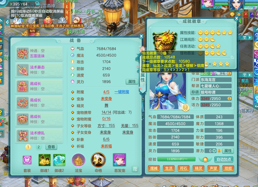 jt9311九天揽月 159女龙宫 法系装备毕业 5.0化龙鼎 精灵歌 四字靓号不带4 7内龙 7六字 3内神 5觉醒 多个永久外观 多个完美染色坐骑 细节多多