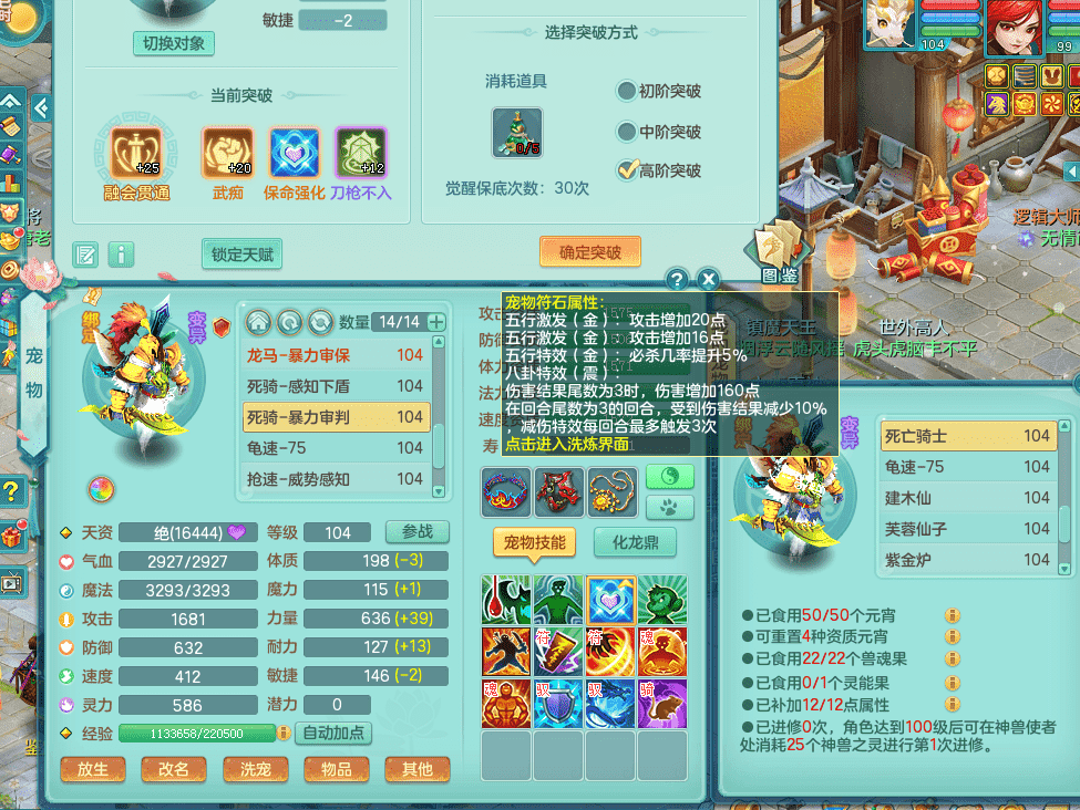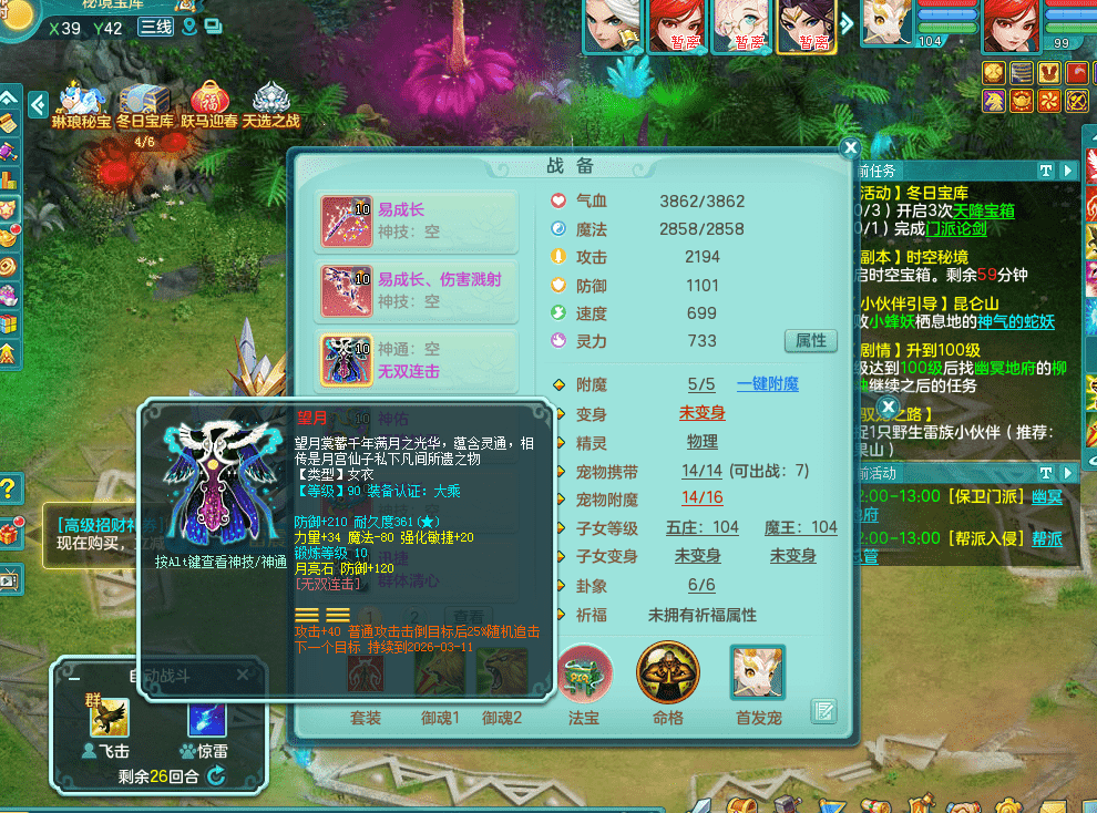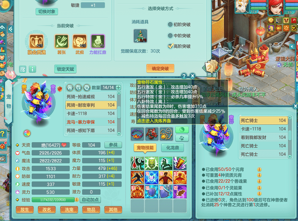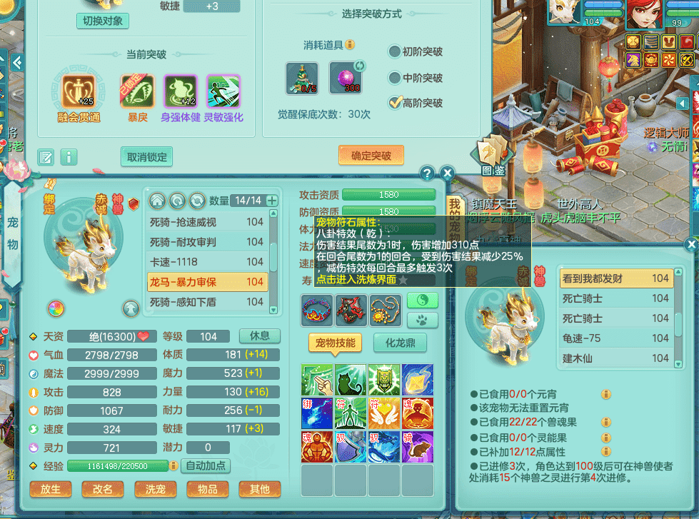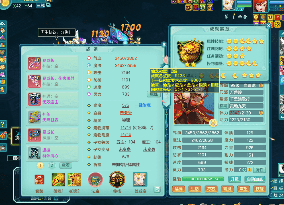 tx9326天下无双 99女万兽,双飞坐骑,2.5基础+42攻击化龙鼎 天上人间庭院,1龙无内,1内神(龙马),8觉醒5真6字13+满果子,三精灵(物,法,辅)有配套装备 可玩三系