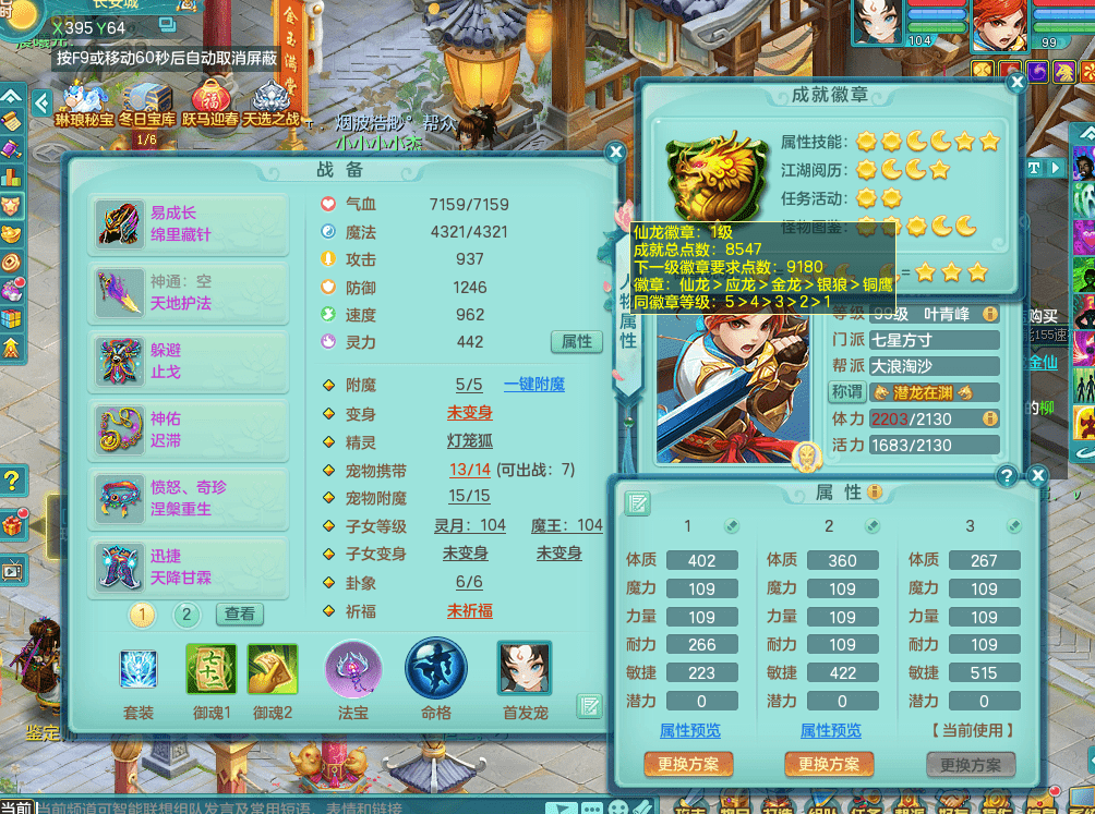fc9353风驰电挚【潜龙在渊】99男方寸 3.0化龙鼎 3套属性 3个精灵 6龙5内 3内神2蛇1锤 7觉醒 7六字 15个以上满果子 Y笑里头 躲避放下衣服 神佑迟滞项链 愤怒奇珍慈航三红腰带 迅捷四海鞋子 一线封系装备毕业 还有多件特技装备可切换 多只完美染色坐骑!!!