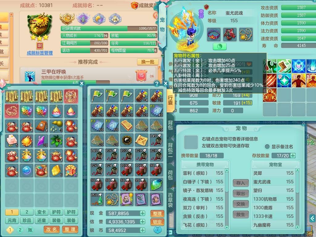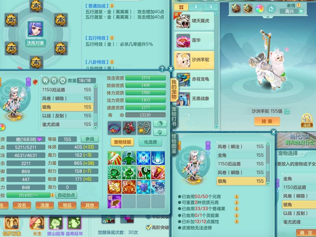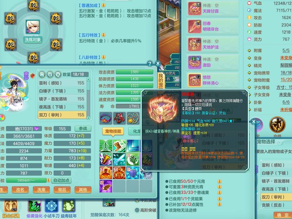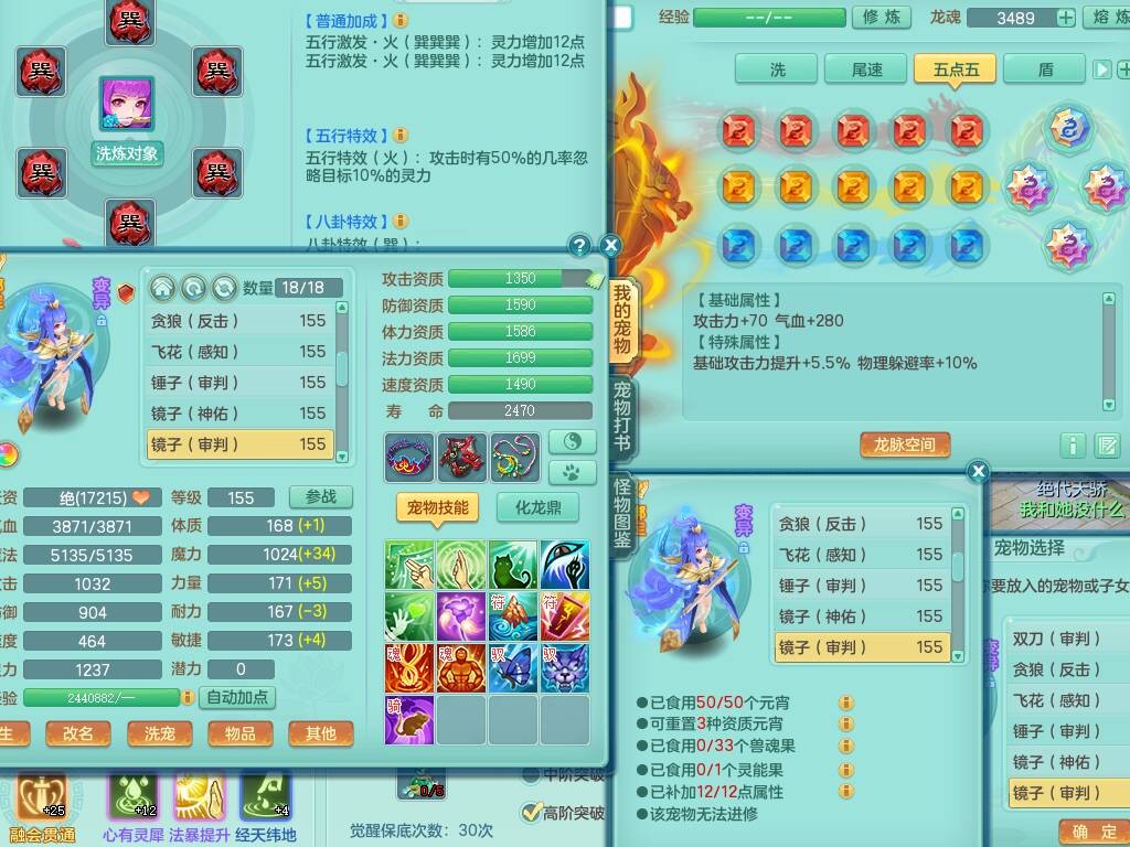 fc9370风驰电掣159男无量,精灵舞,1龙1内胆神,2破镜,【9只觉醒,已潜龙】,1宠皮,3只六技能镜花灵,1只6技能龙姬,8特殊(青霜,锤子,舍身,噬风,飞花,以战,号角,守护),回春愤怒6特,5.5基础鼎+70攻、280血,物理躲避10%,15个格子,13个纯六字,4个五字,23只满果子,宠排在榜,经验修炼在榜,黑白老虎,月卡还有34天