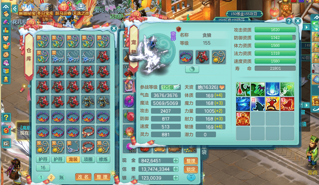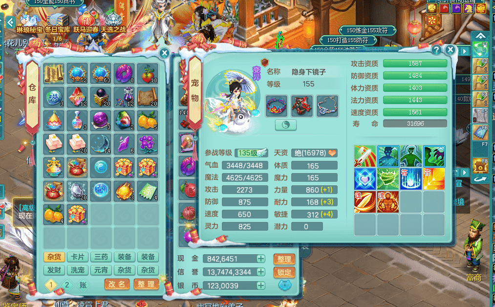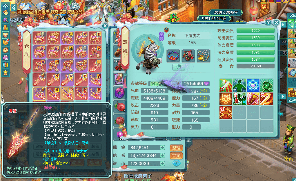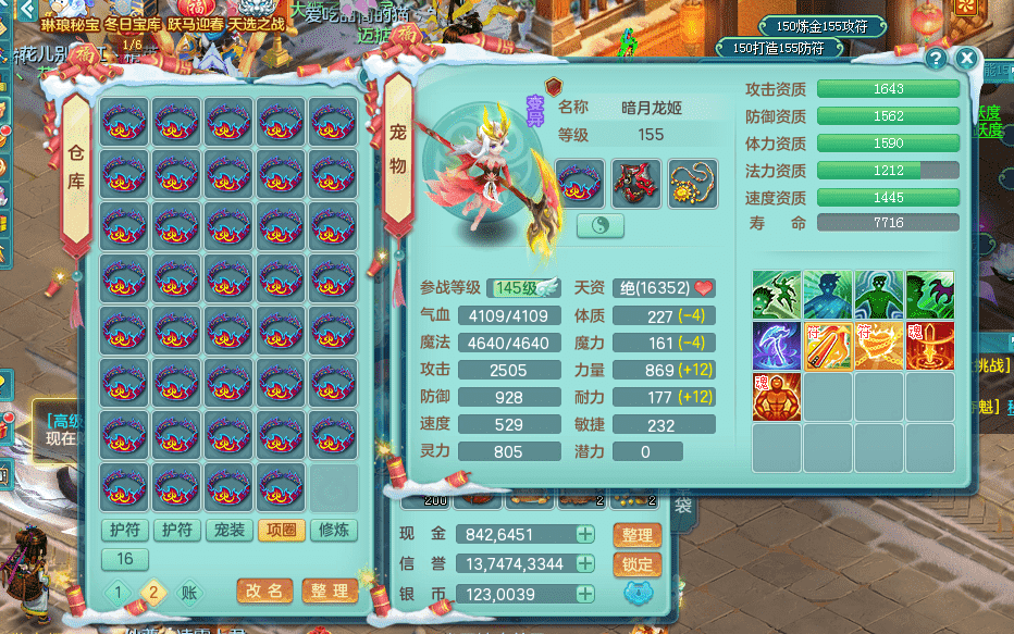 tx9391天下无双159五庄 精灵歌 云麾铁骑双飞葫芦 有双红回春武器可以转辅助 满星穹 5.0化龙鼎 64仙兽灵 1内神蛇 2镜花1龙姬 1金角皮肤 特殊(雷利,影袭,噬风斩,勇猛,夺命) 6觉醒 10左右满果子 2980邮箱