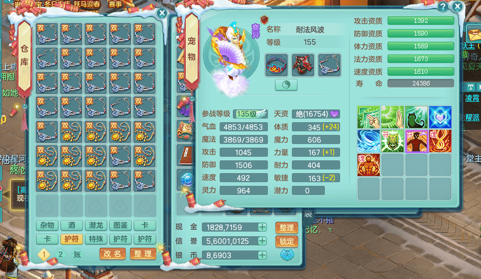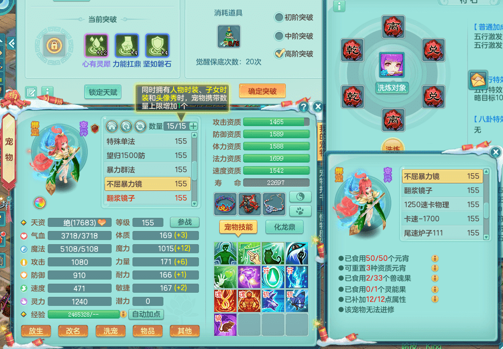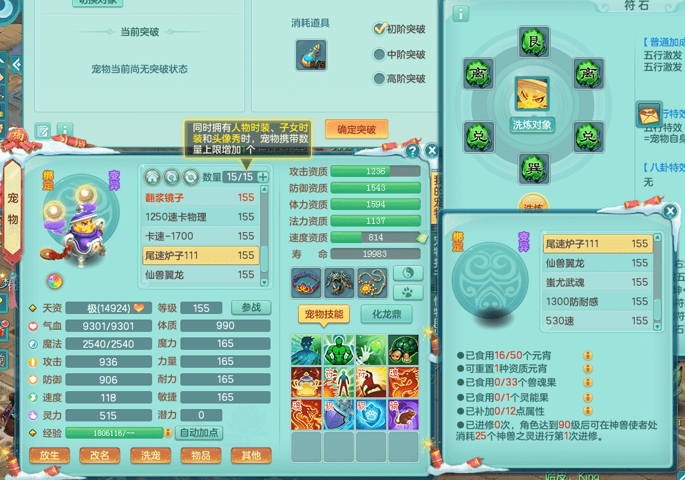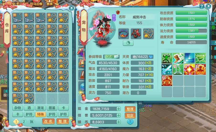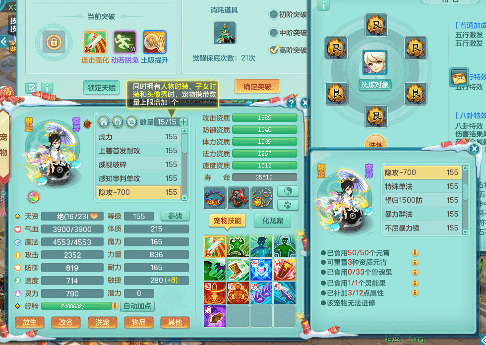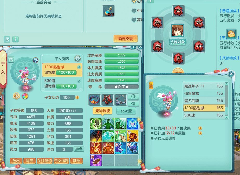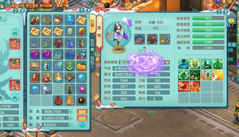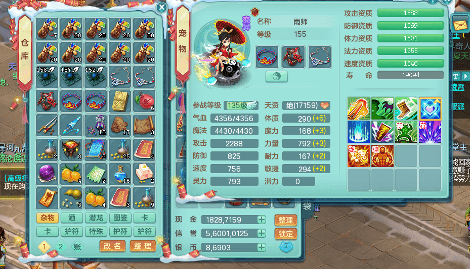 jt9403九天揽月 159女方寸 5.0化龙鼎(70攻击,280气血)精灵舞 神佑魔音项链 迅捷慈航鞋子 一线装备毕业 1内神 1龙无内 5觉醒 10个左右满果子 1宠皮还有1源生 宠物孩子齐全 3只坐骑 粉色豪宅 154庭院