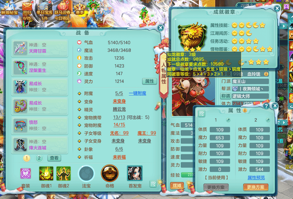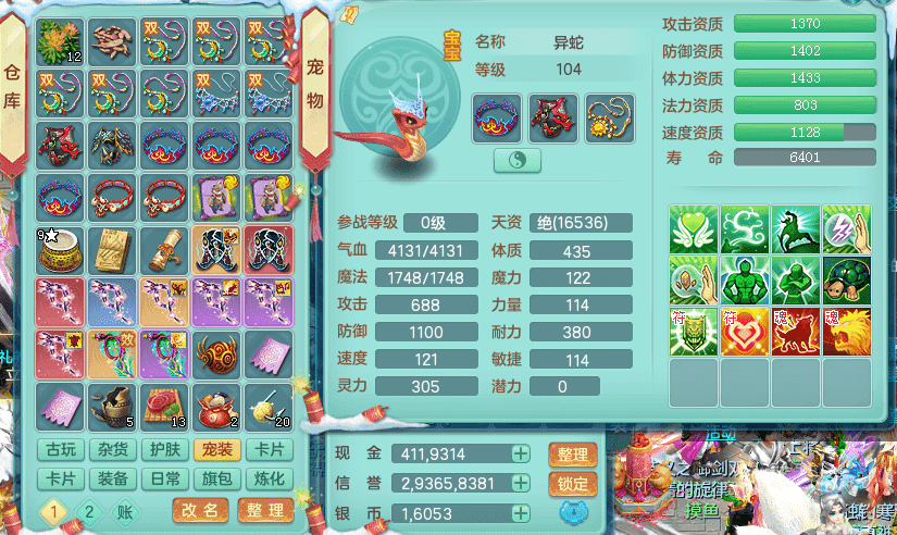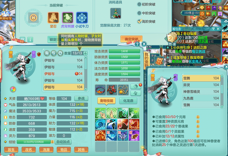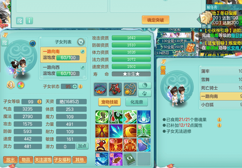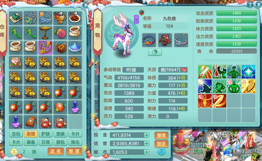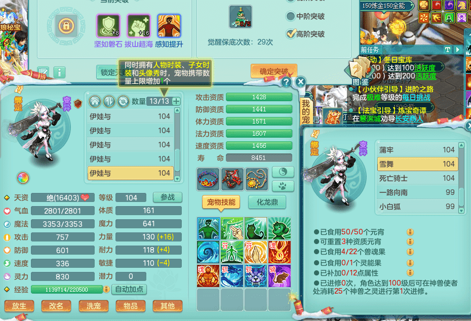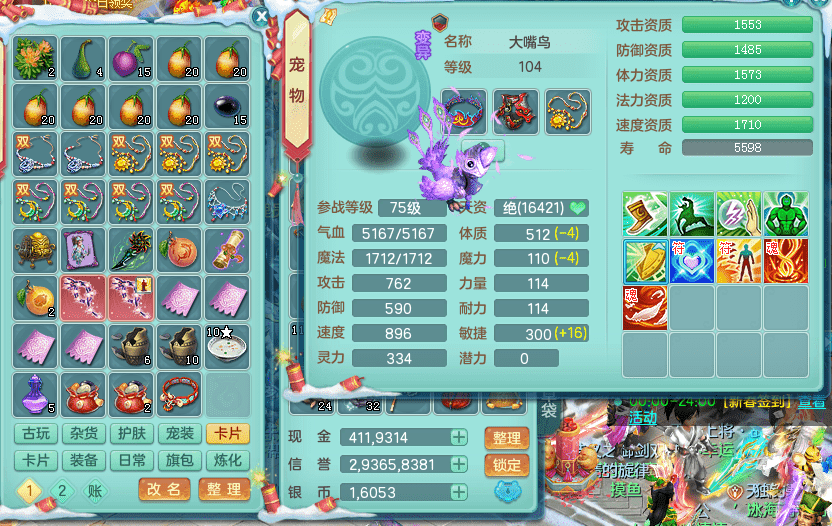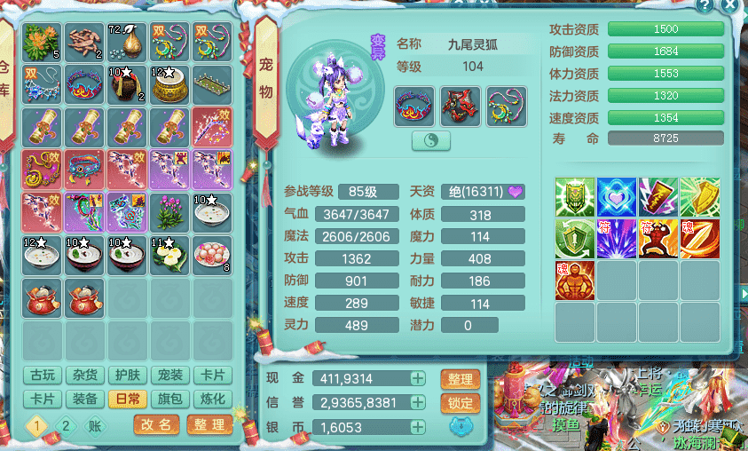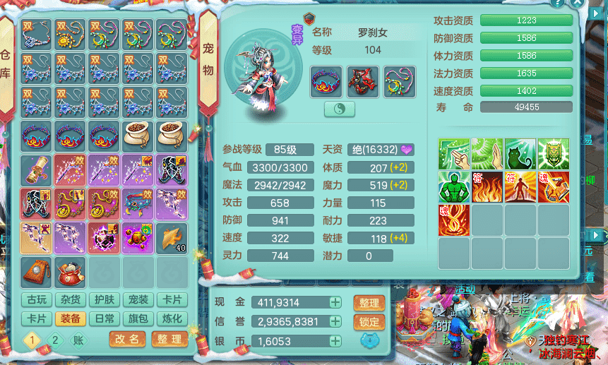 yc9412阳春白雪 99女魔王 3.0基础化龙鼎(42攻击,168气血) 白色大老虎坐骑 染色皮肤精灵 1内神锤子 1觉醒 15+满果子 有几只炼妖宠物 装备兼顾辅助 宠物齐全 154美观庭院 113海洋豪宅