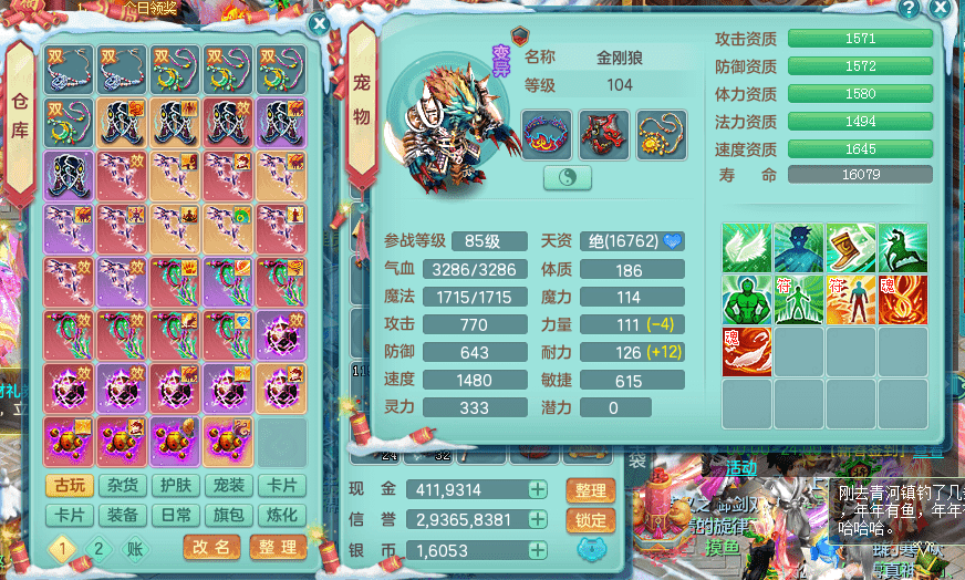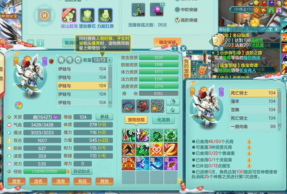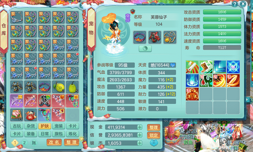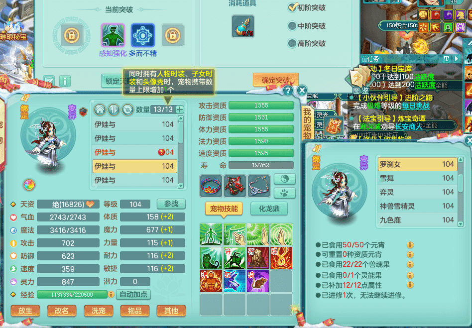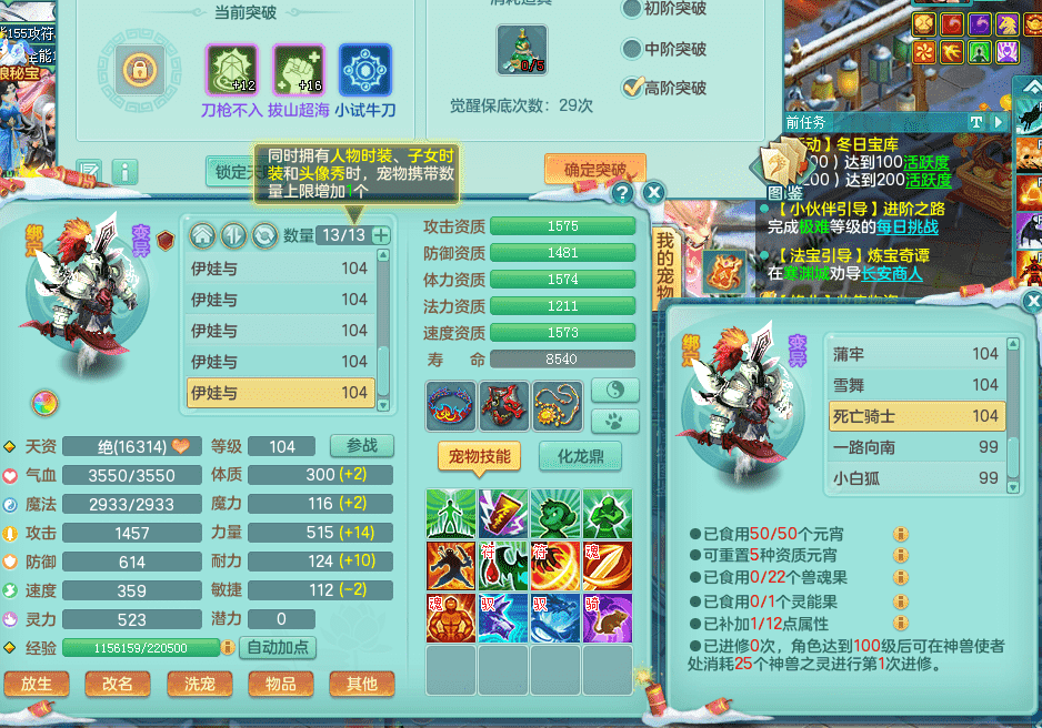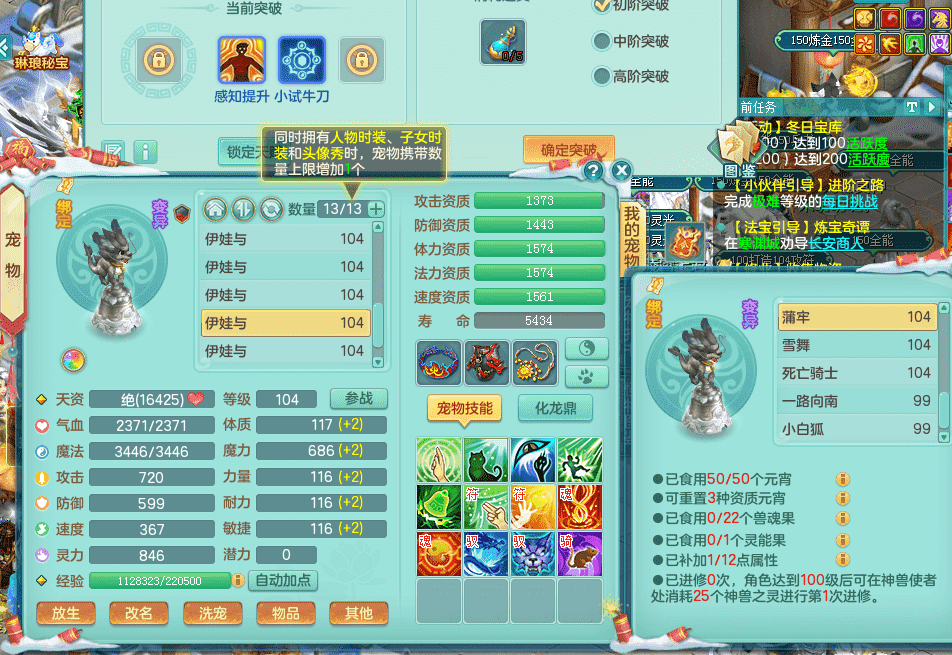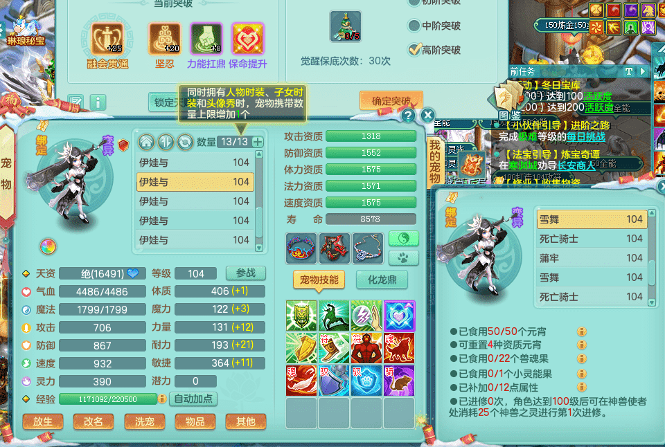 yc9412阳春白雪 99女魔王 3.0基础化龙鼎(42攻击,168气血) 白色大老虎坐骑 染色皮肤精灵 1内神锤子 1觉醒 15+满果子 有几只炼妖宠物 装备兼顾辅助 宠物齐全 154美观庭院 113海洋豪宅