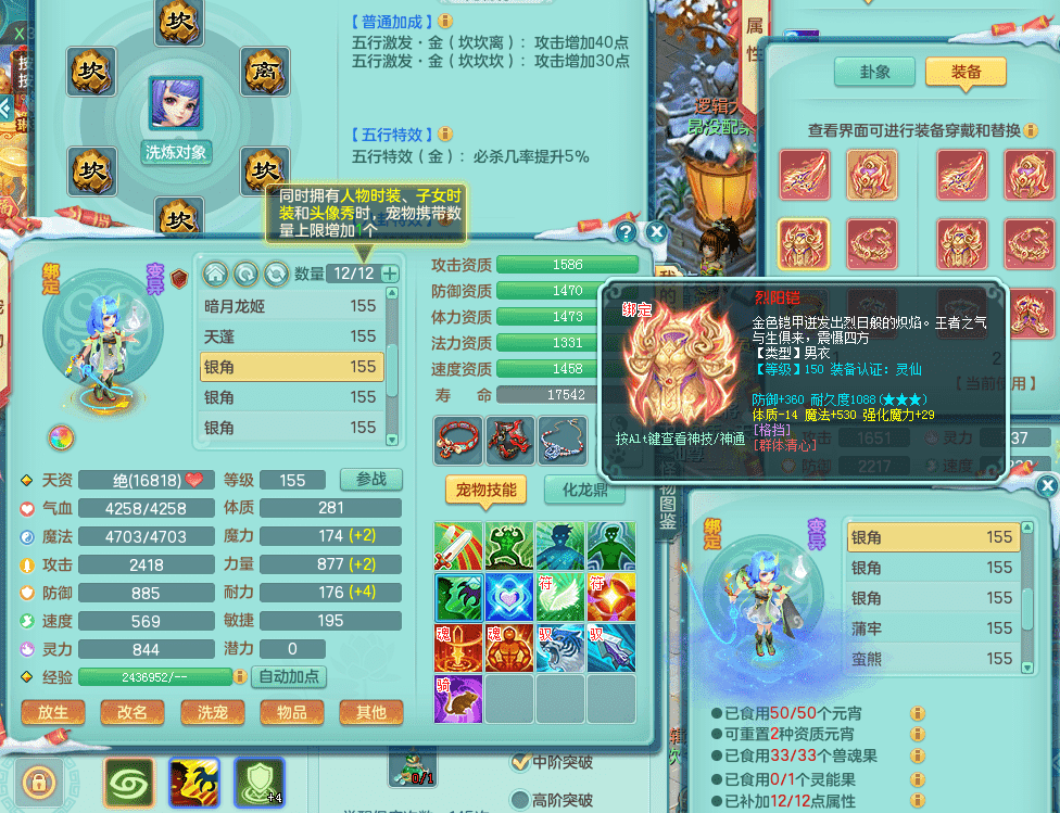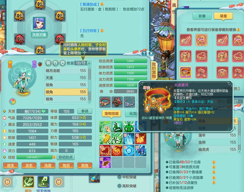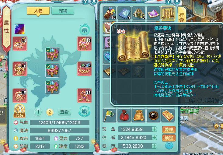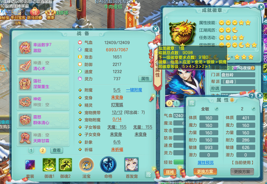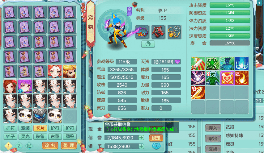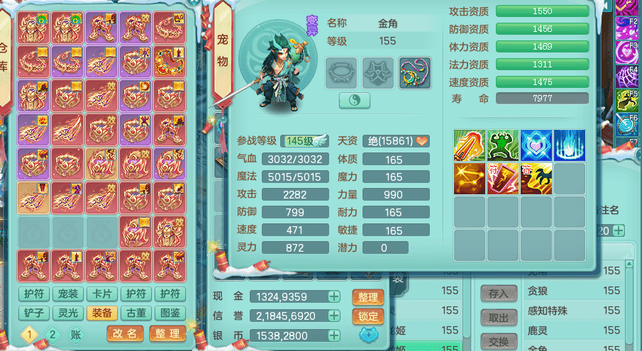 tx9417天下无双 159男盘丝 精灵舞 5.5化龙鼎 特殊风卷兽决 一千五百万神武币 数字激励头 强壮慈航衣服 震怒群体清心腰带 辅助装备不错,还有多件特技可切换 3镜花2龙姬 宠物齐全 综合4个满果子