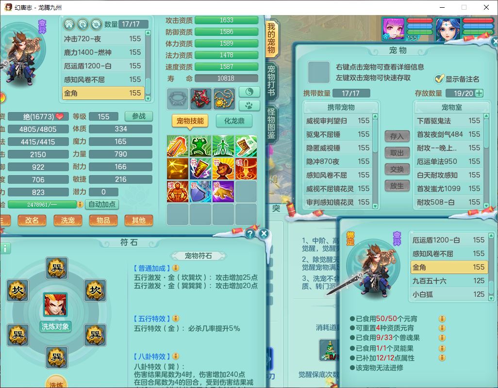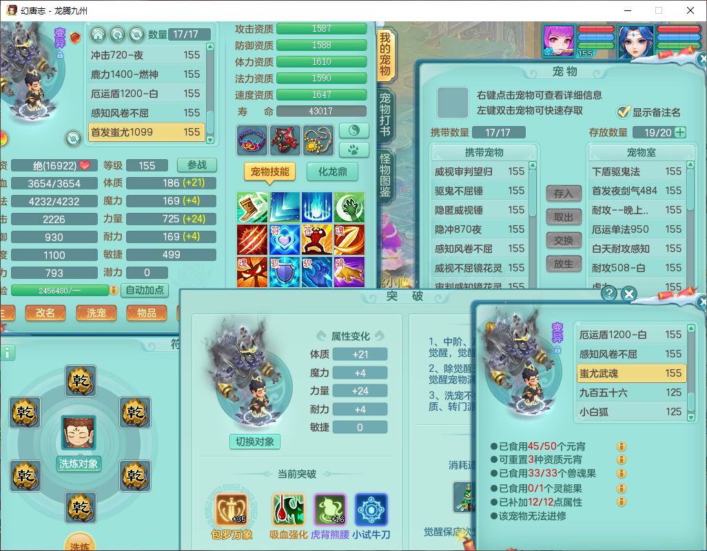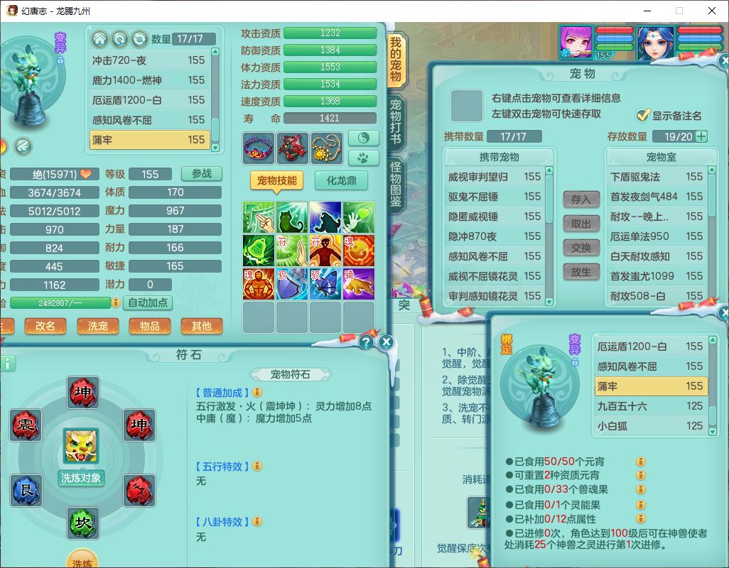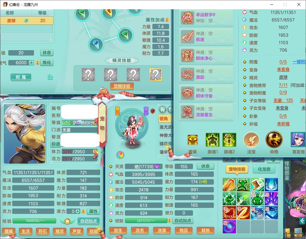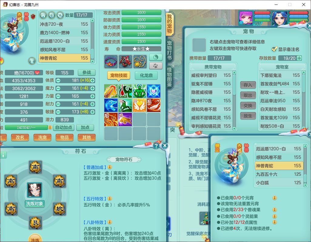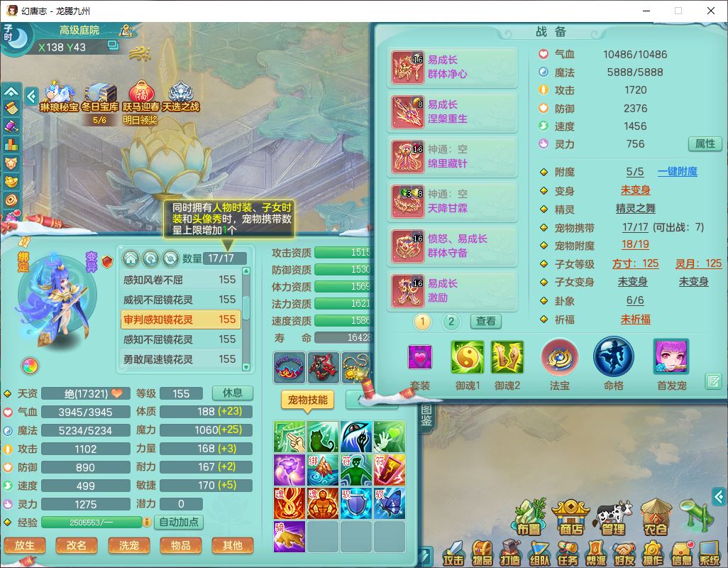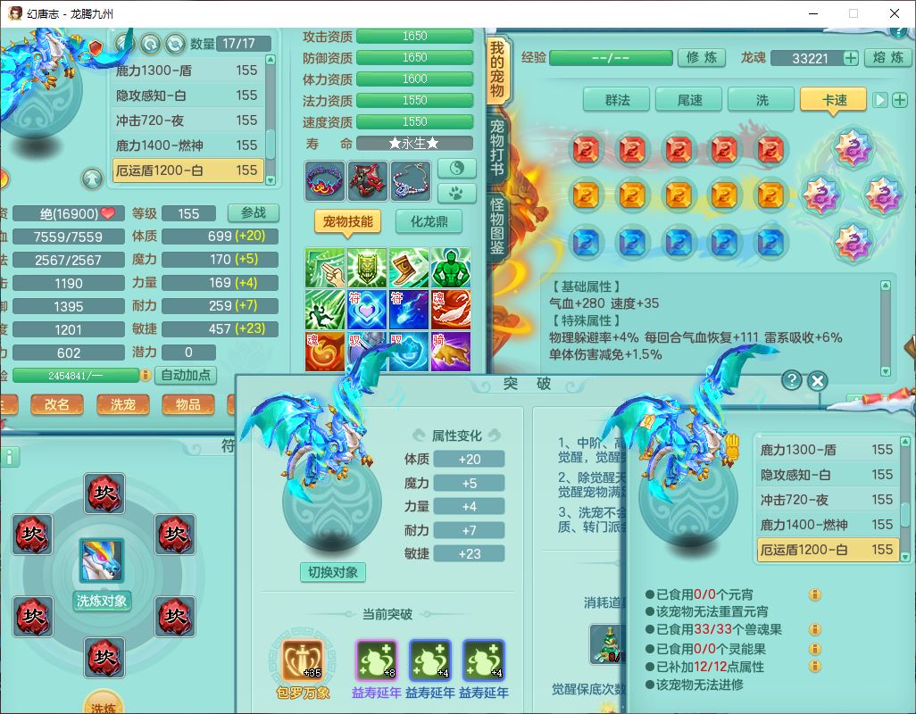 lt9469龙腾九州159女五庄【潜龙+暴龙逍客+西瓜冰】精灵舞、悟、歌,3龙(换)3内(1青蛇)5六技能镜花(1胚子)4特殊(风卷、雷利、烈焰,琴音兽决),16觉醒9宠皮14六字5五字10四字(1洗练珠)综合27只满果子,11红装备,Y晶清帽子,Y慈航武器,愤怒Y群体守备腰带,Y激励鞋子,一套七红输出装,Y止戈武器,Y驭兽鞋子,有法系装,法缭水清鞋子,鼎6.0+70+280,冰晶庭院233房屋173,永久外观、精灵皮肤,615W神武币,4双人坐骑(1飞行),带两个150奶粉