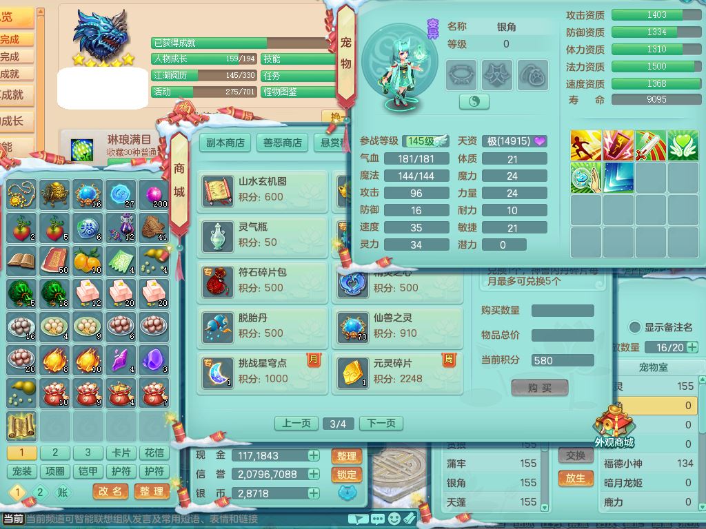 fy9466风云再起159男龙宫【暴龙猎手+火焰之力】精灵歌,1内丹青蛇5特殊(噬风/枪出/祈雨/堕天/荒古兽决)4镜花灵,11只满果子6觉醒1个纯6字,全身单加12红,五雷头,击退止戈武器,强壮Y衣服,满灵Y药香烽火项链,愤怒双红腰带,迅捷Y鞋,鼎5.0+70+280,57天月卡,永久外观精灵皮肤,20仙兽灵16内丹碎片,2颗天马之心,2只双人坐骑,带159魔王精灵歌,1特殊(翻江)2镜花灵1觉醒2个纯6字,全身单加,265Y玉清项链,五雷武器,鼎4.5,2套符石