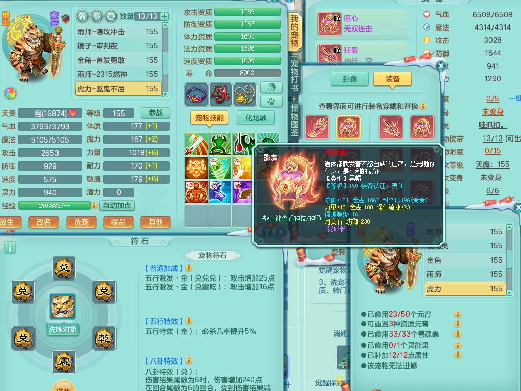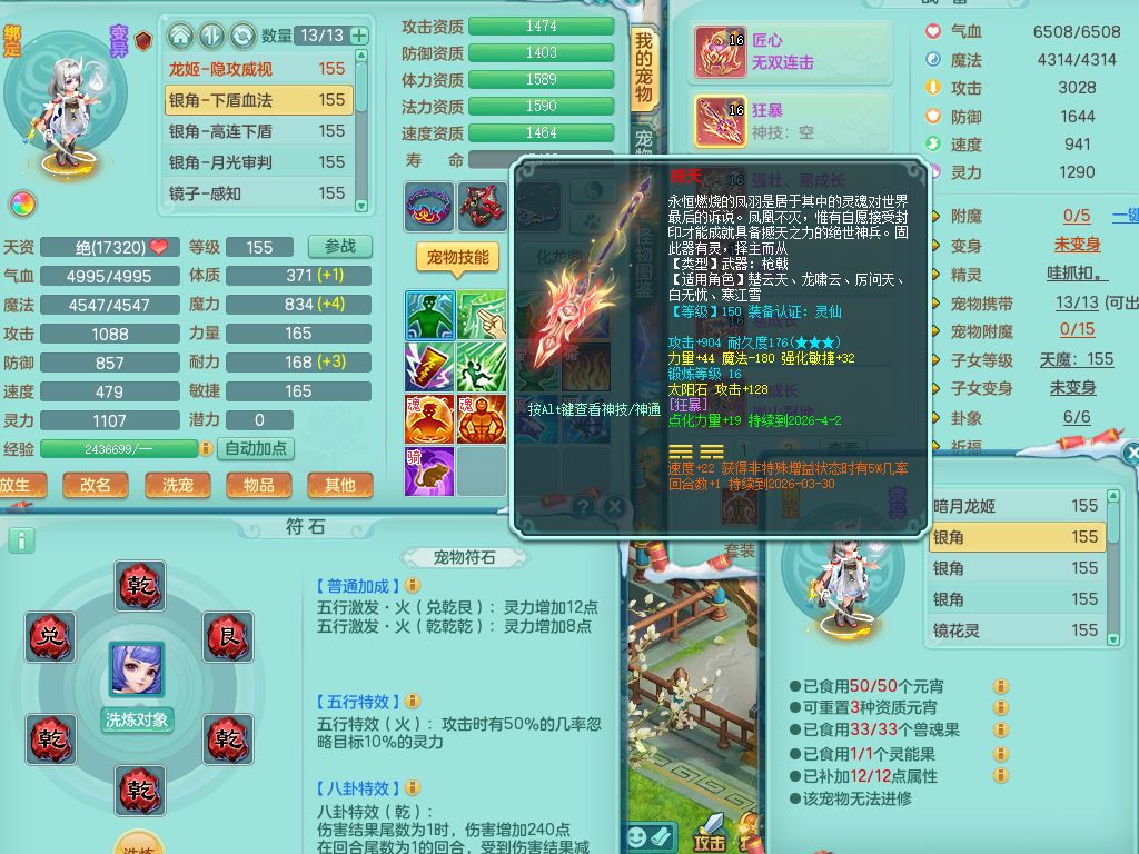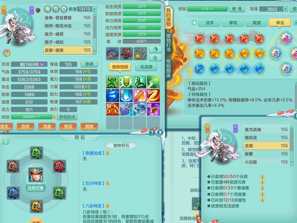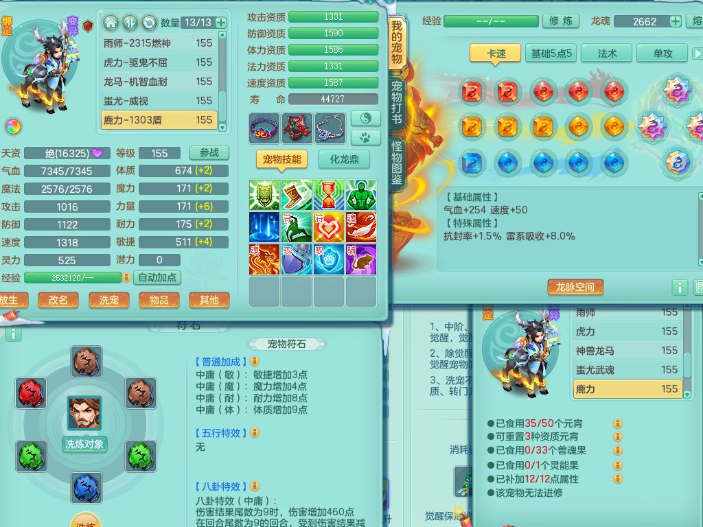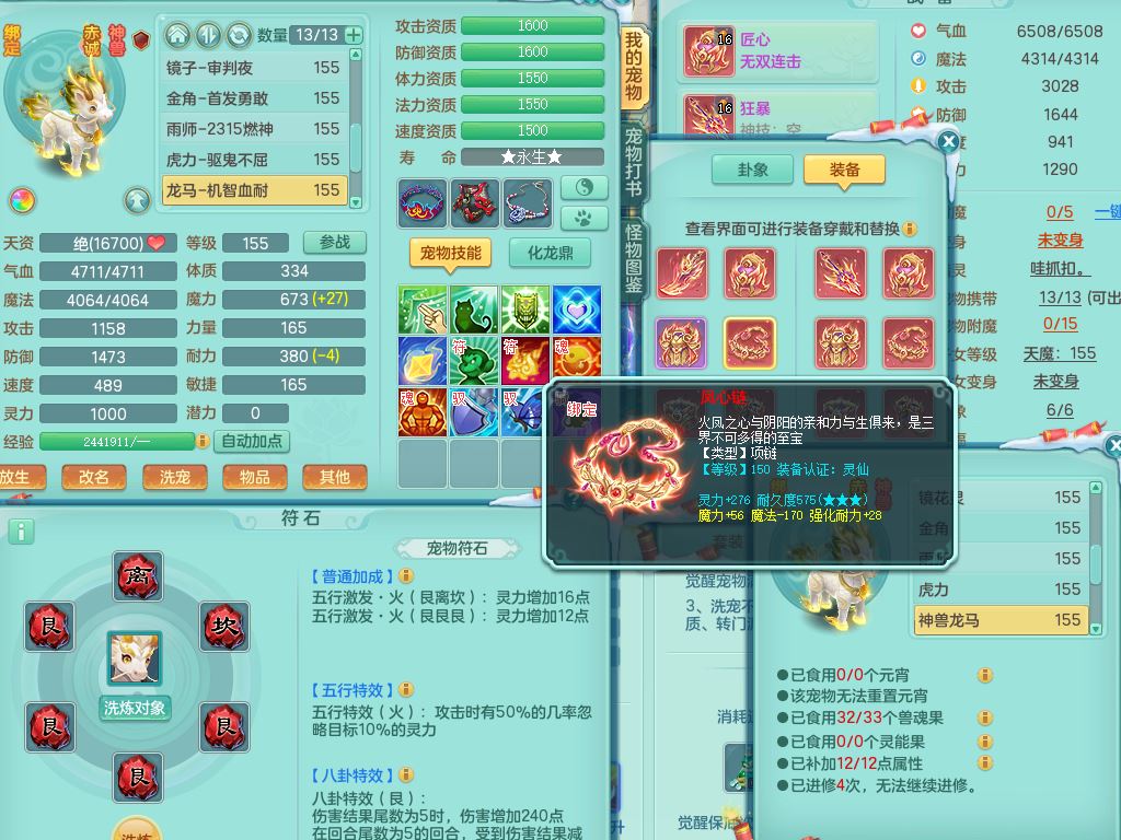 jn9506今年勇159男万兽精灵舞,2套星穹,1内丹龙马3特殊(月光/藕断/翻江兽决)1皮(幻灵果)3镜花灵1龙姬,12只满果子4觉醒,全身单加10红,904狂暴武器,匠心破血头,强壮Y衣服,神佑迟滞项链,Y崩山鞋,鼎5.5+70,2套符石,永久外观精灵皮肤,5坐骑(3只双人)带150奶粉龙宫
