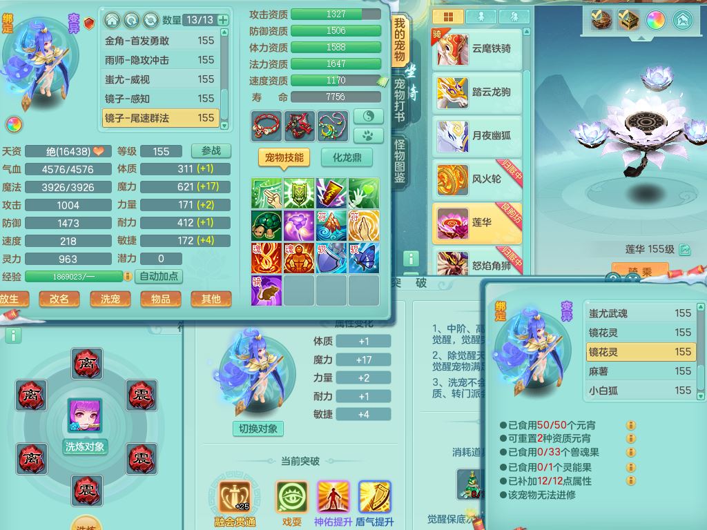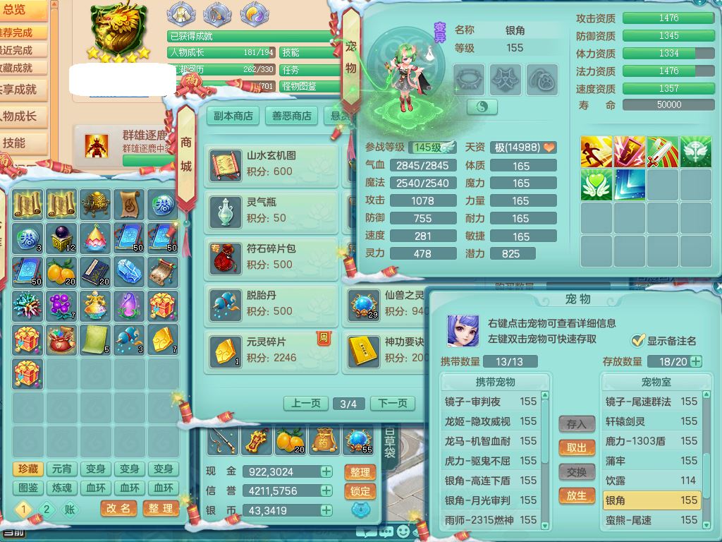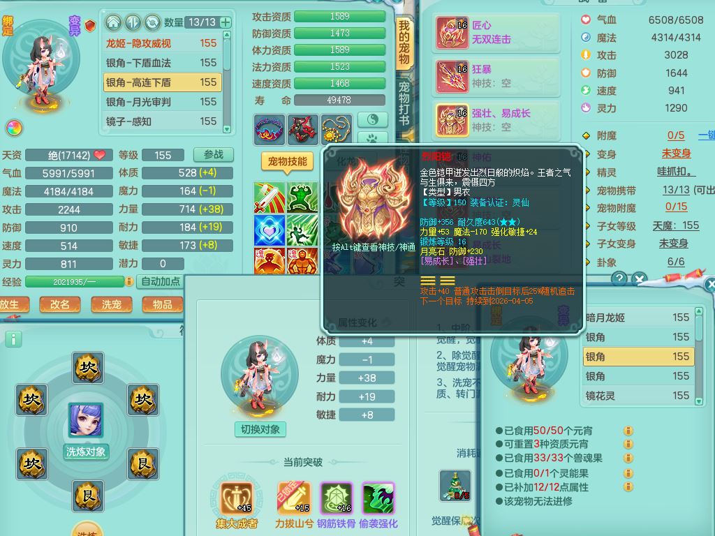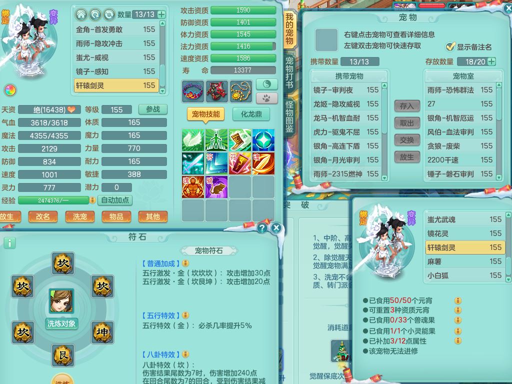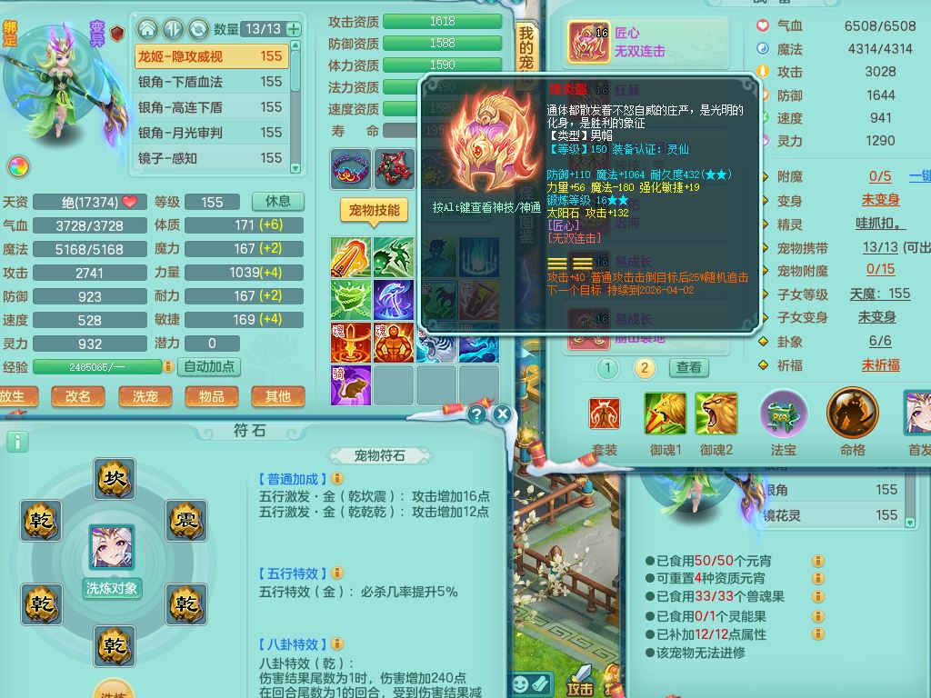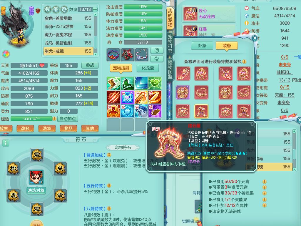 jn9506今年勇159男万兽精灵舞,2套星穹,1内丹龙马3特殊(月光/藕断/翻江兽决)1皮(幻灵果)3镜花灵1龙姬,12只满果子4觉醒,全身单加10红,904狂暴武器,匠心破血头,强壮Y衣服,神佑迟滞项链,Y崩山鞋,鼎5.5+70,2套符石,永久外观精灵皮肤,5坐骑(3只双人)带150奶粉龙宫