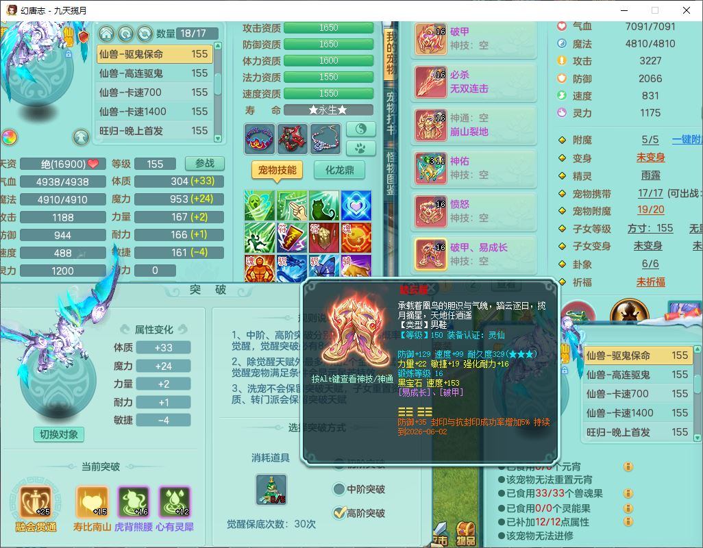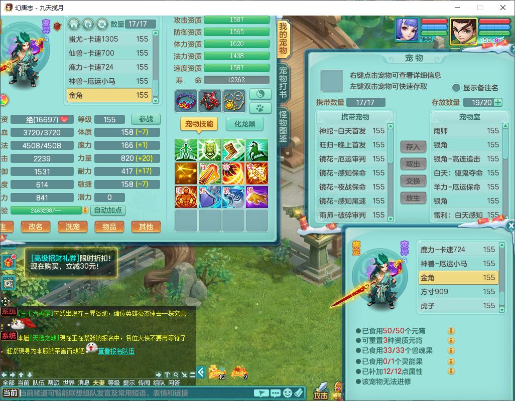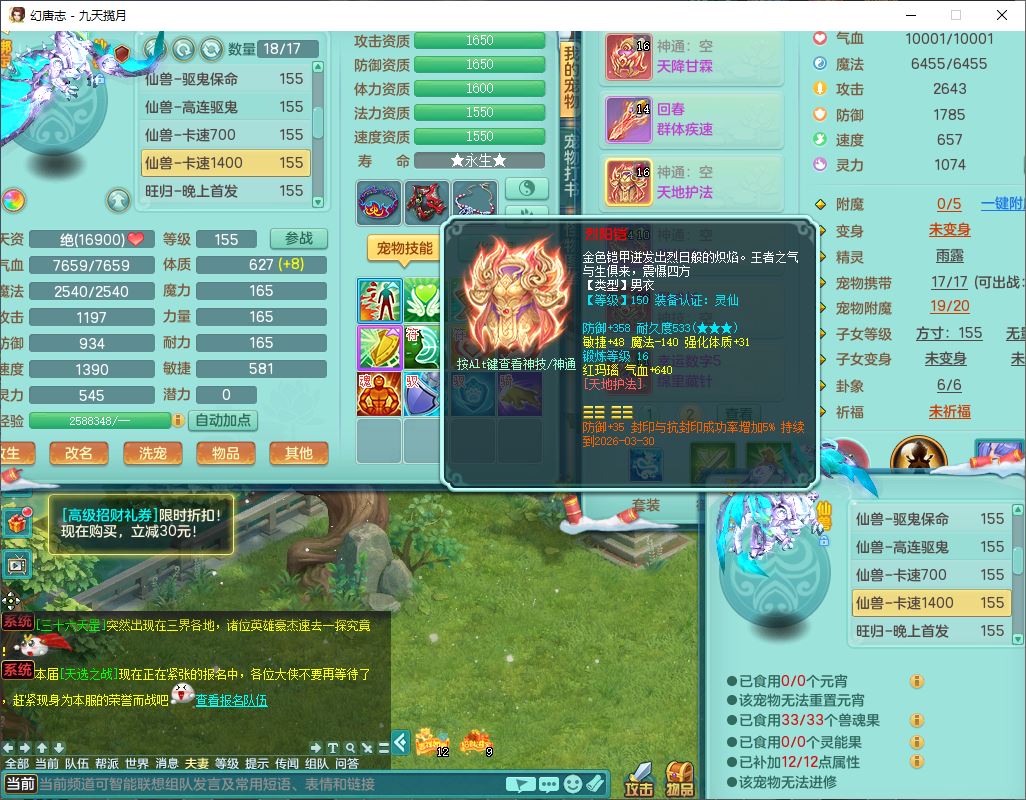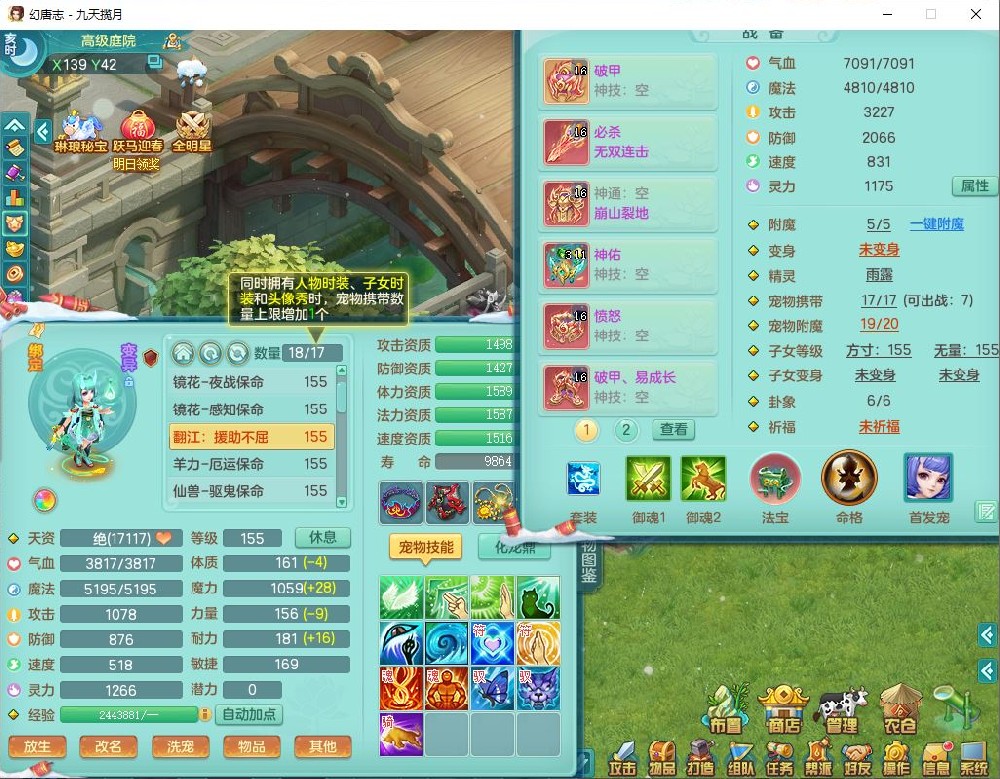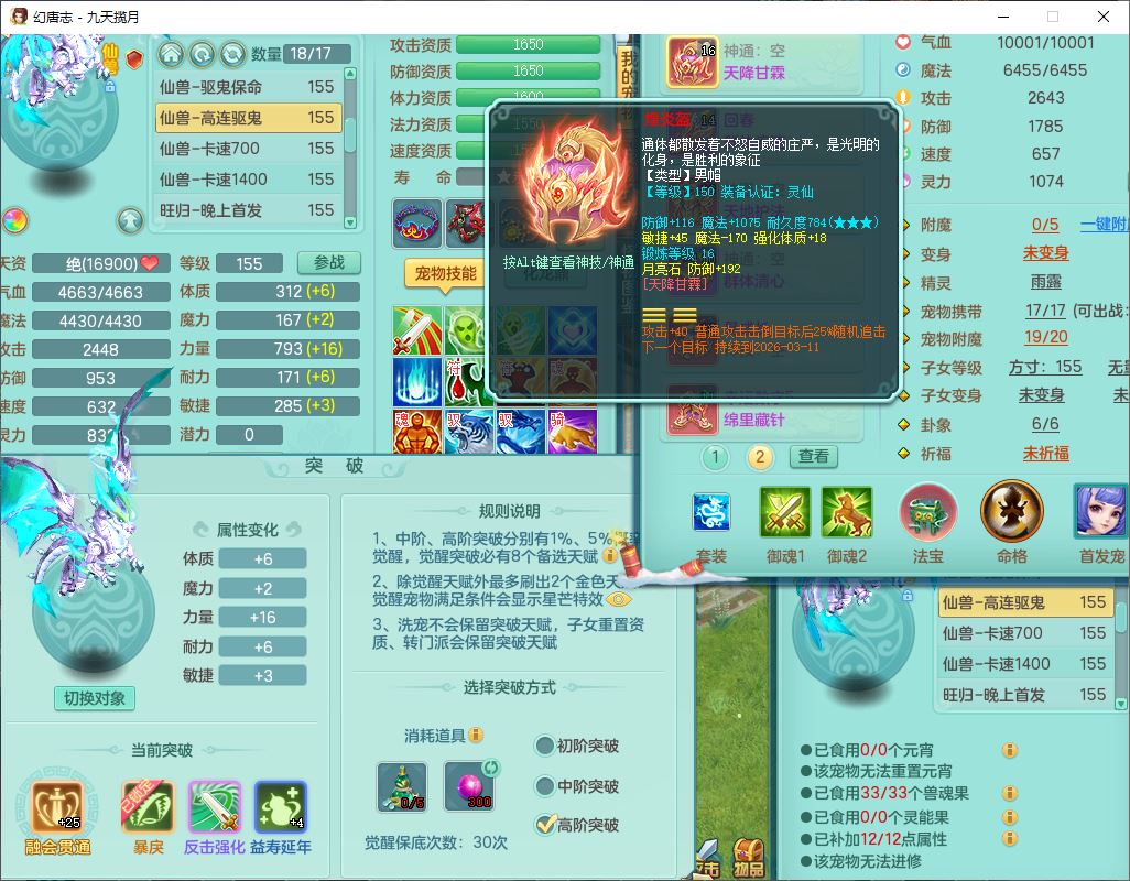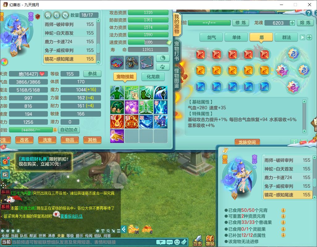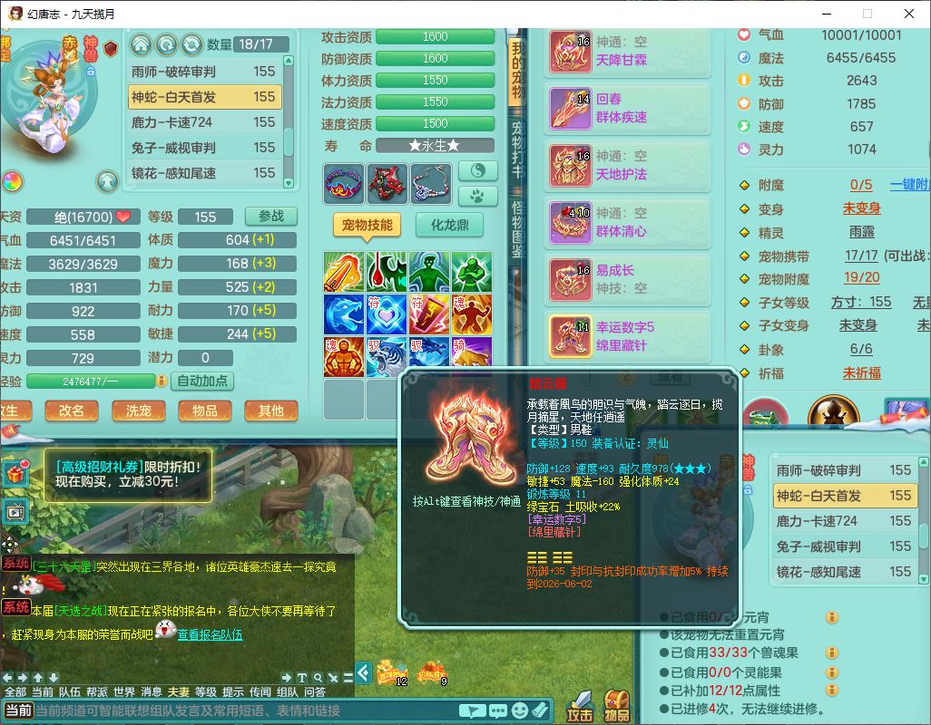 jt9560九天揽月159男天策【准潜龙号,差1只宝宝1条主符石+西瓜冰】精灵歌,5龙2内(1青蛇1龙马)4镜花9特殊(祈雨、翻江、破碎、夺命*2、剑胆、舍身、守护,墨守兽决)1龙姬胚子,7觉醒9以上六字27只满果子,17格子,8红星辰之拥双破甲装备,破甲帽子,必杀破血武器,崩山衣服,破甲Y鞋子,一套8红辅助装,回春群体疾速武器,幸运笑里鞋子,鼎5.0+70+280,法爆10.0,2套符石,20天月卡,111W神武币,18个内丹碎片,1绝版千机石,1双人坐骑