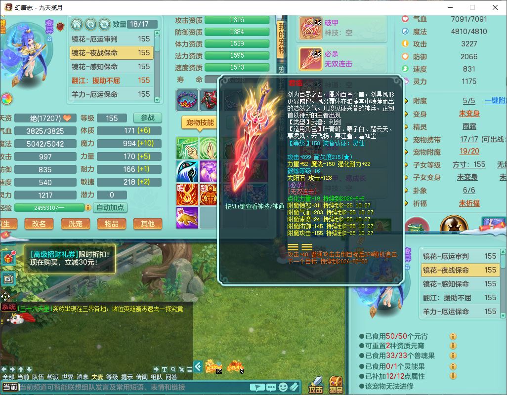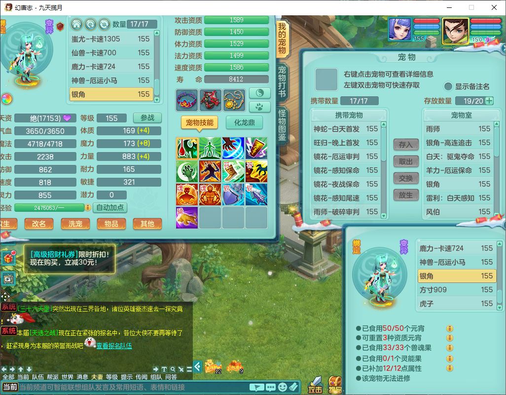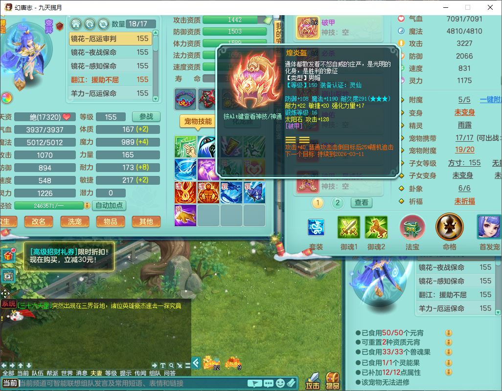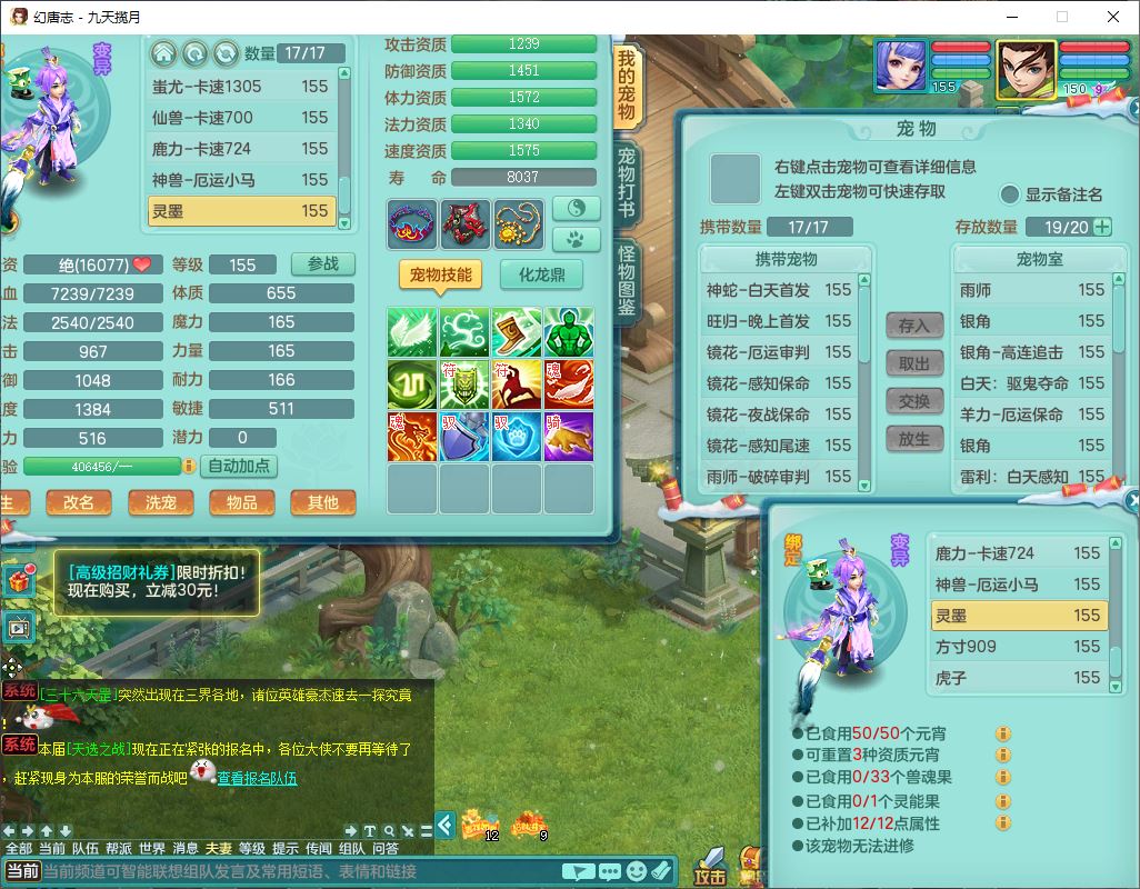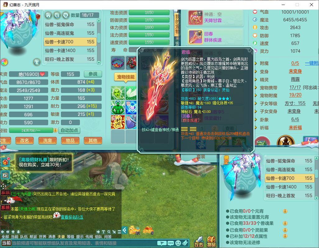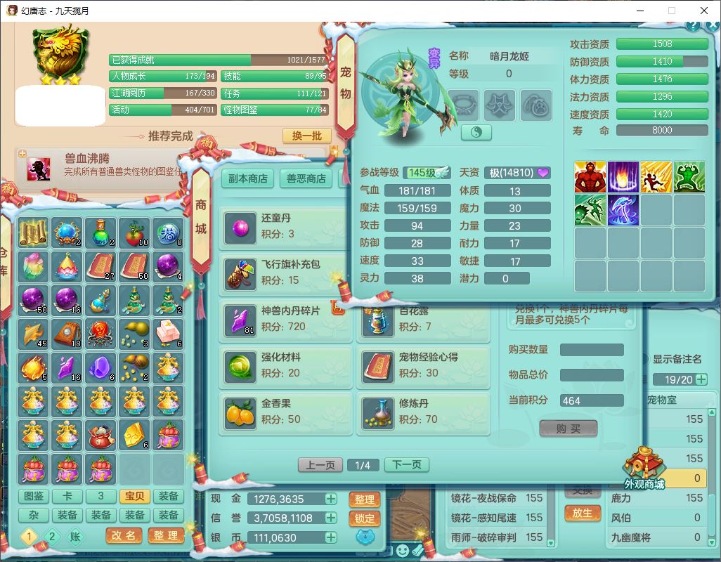 jt9560九天揽月159男天策【准潜龙号,差1只宝宝1条主符石+西瓜冰】精灵歌,5龙2内(1青蛇1龙马)4镜花9特殊(祈雨、翻江、破碎、夺命*2、剑胆、舍身、守护,墨守兽决)1龙姬胚子,7觉醒9以上六字27只满果子,17格子,8红星辰之拥双破甲装备,破甲帽子,必杀破血武器,崩山衣服,破甲Y鞋子,一套8红辅助装,回春群体疾速武器,幸运笑里鞋子,鼎5.0+70+280,法爆10.0,2套符石,20天月卡,111W神武币,18个内丹碎片,1绝版千机石,1双人坐骑