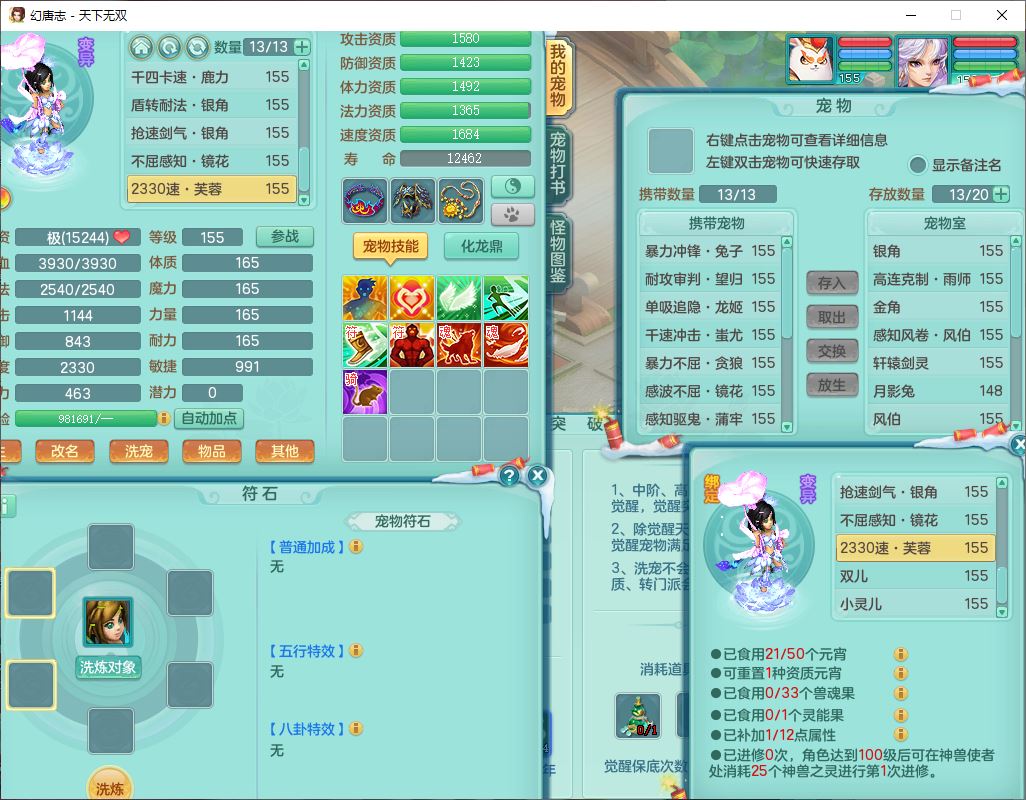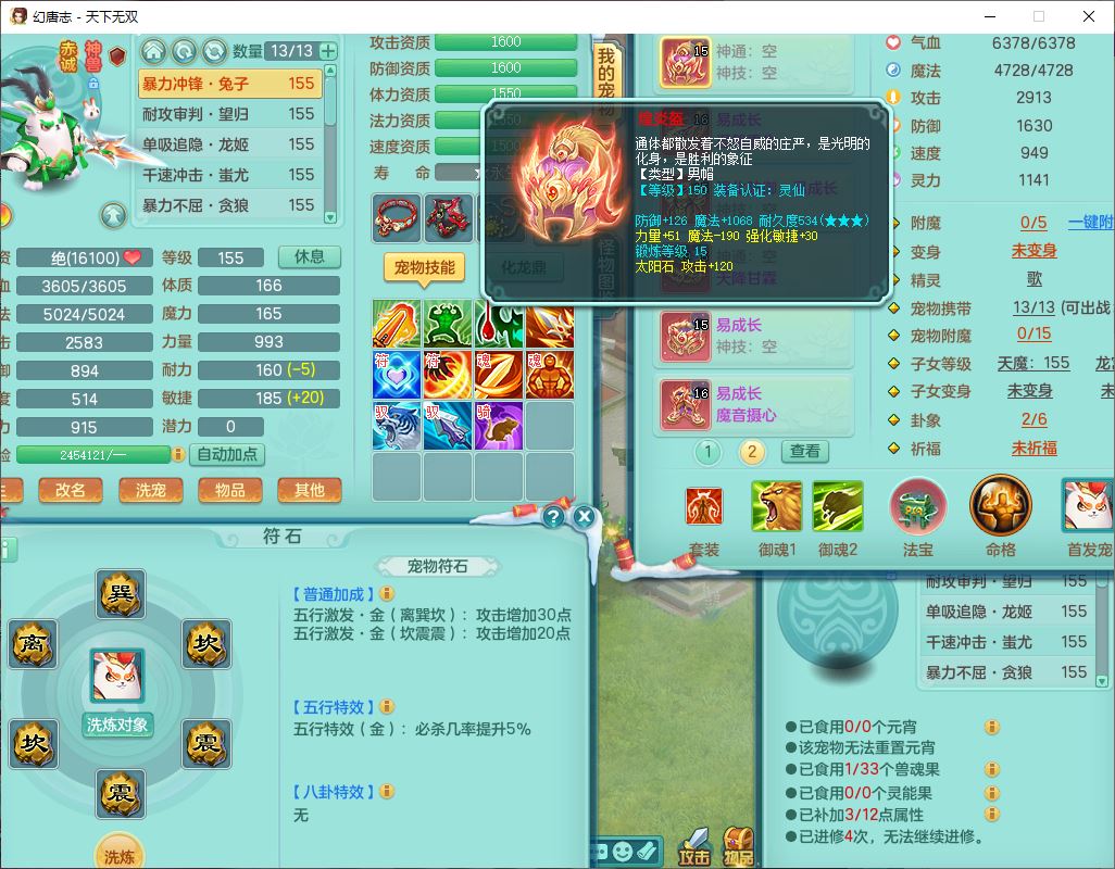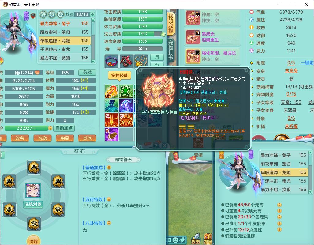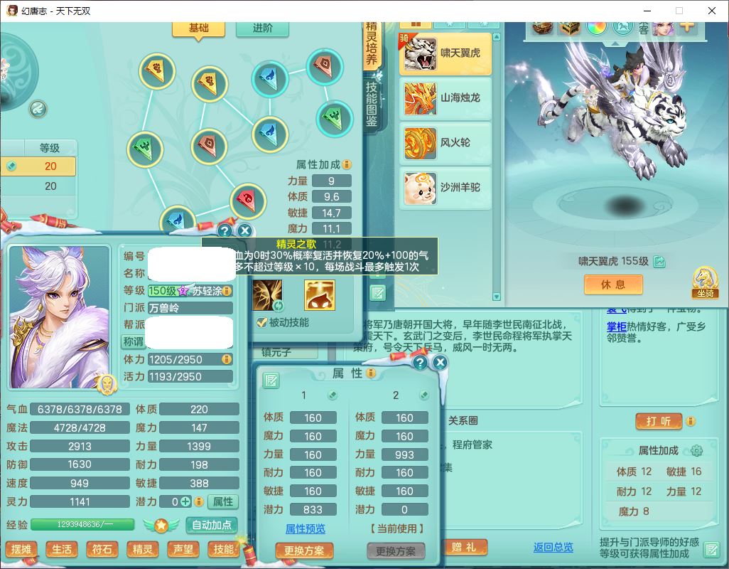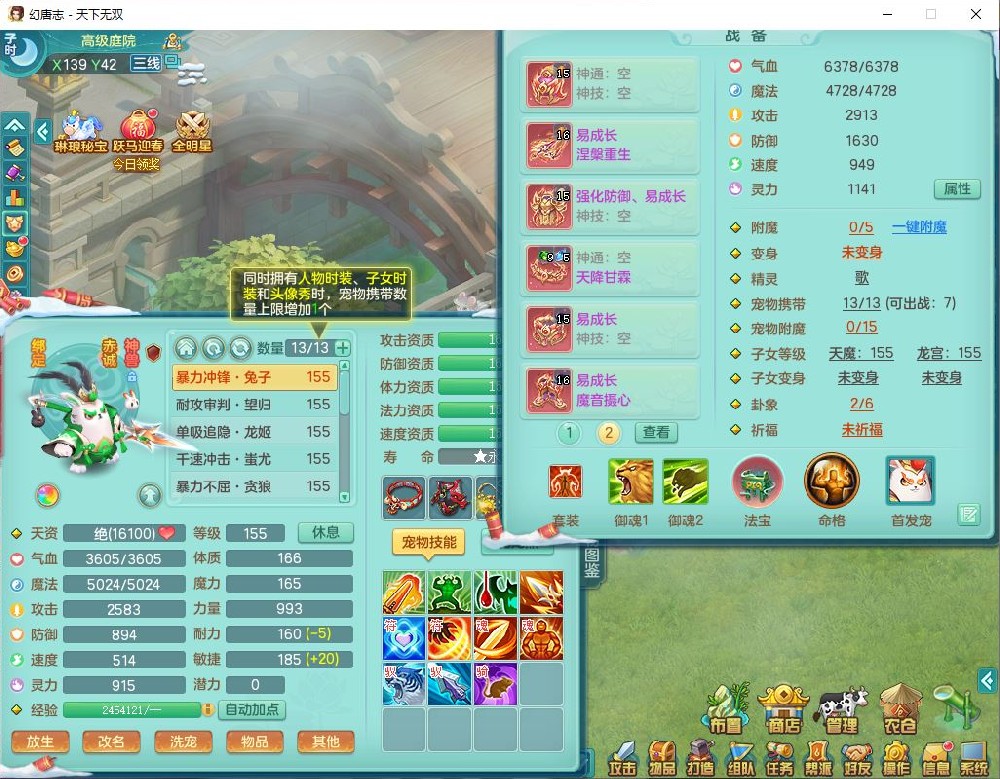 tx9572天下无双159男万兽精灵歌,1神兽(无内)1望归1龙姬2镜花,2觉醒1六字1五字,8红装备,Y慈航武器,强化防御Y衣服,Y魔音鞋子,鼎4.5,庭院156,永久头饰、背饰、精灵皮肤,122w神武币,12个仙兽灵,33个内丹碎片,3坐骑(1双人飞行)