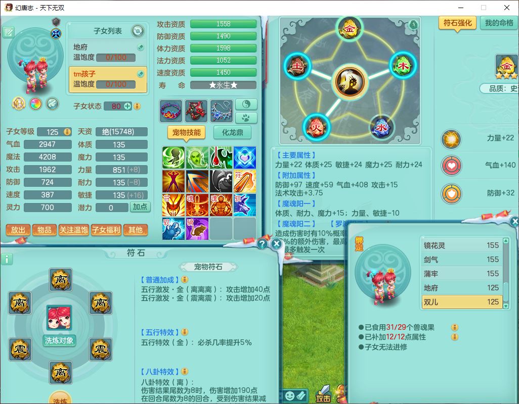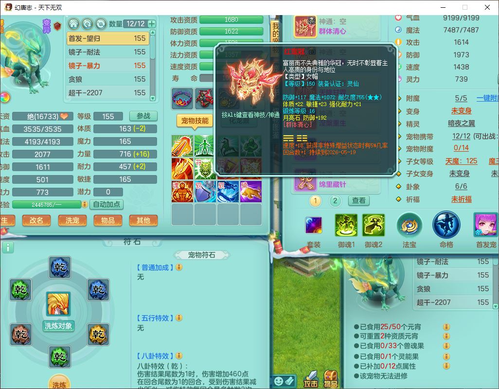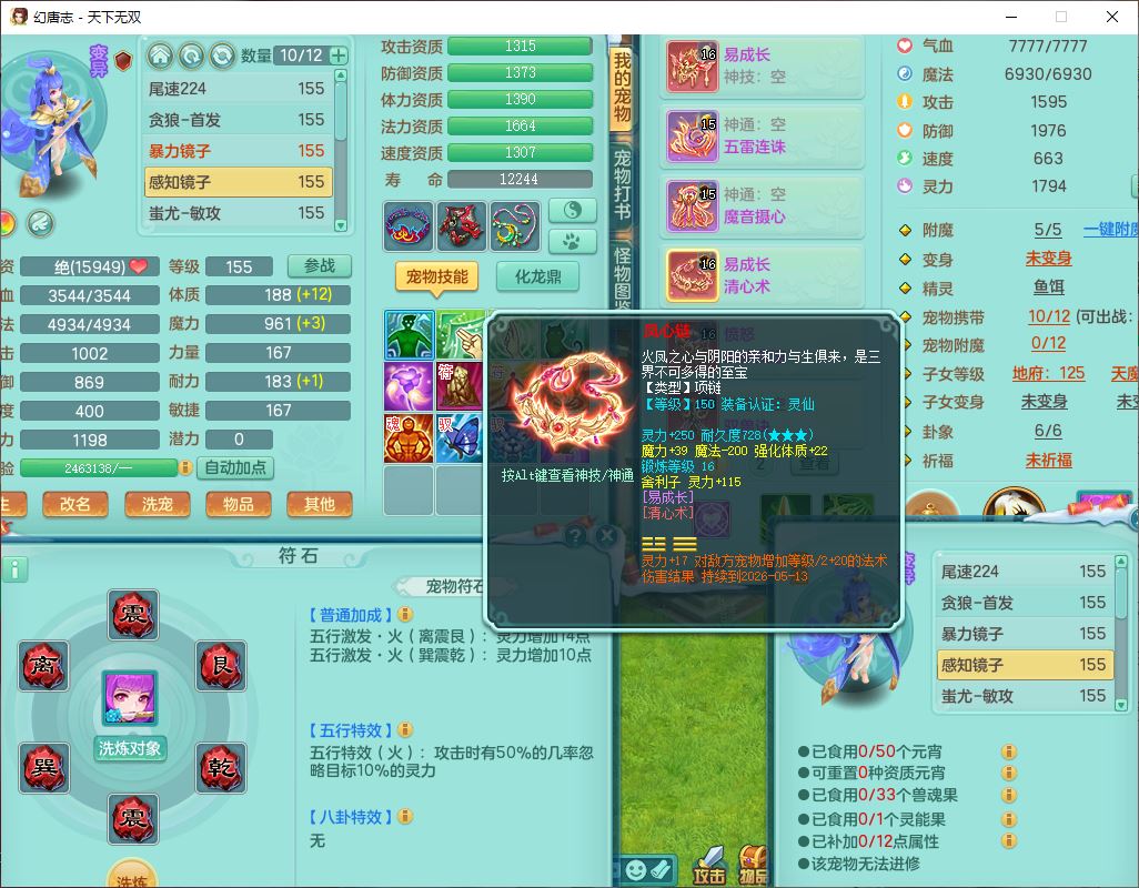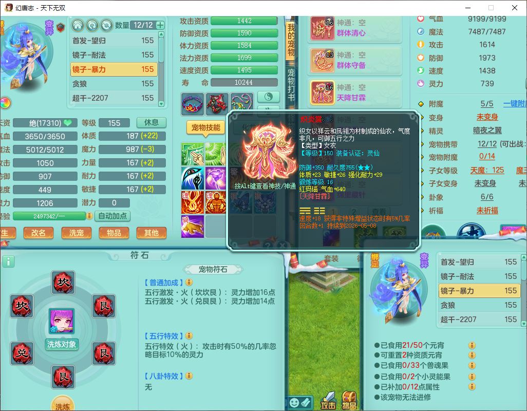 tx9592天下无双双开号159女盘丝精灵舞,1望归2镜花1鹿力1金炉,宝宝种类齐全,3五字6四字,愤怒五特装备齐全,鼎4.5;带159女鬼谷精灵歌,2镜花1蒲牢,8红装备,五雷武器,Y水清项链,愤怒群体疾速,鼎5.5,庭院152环境
