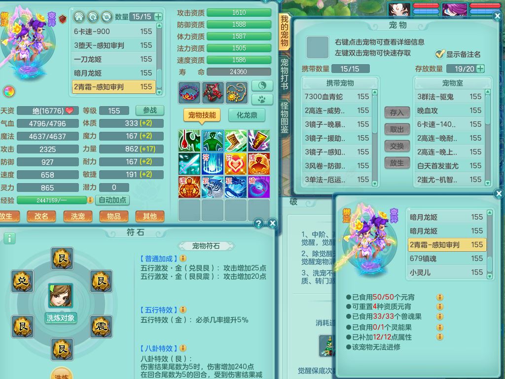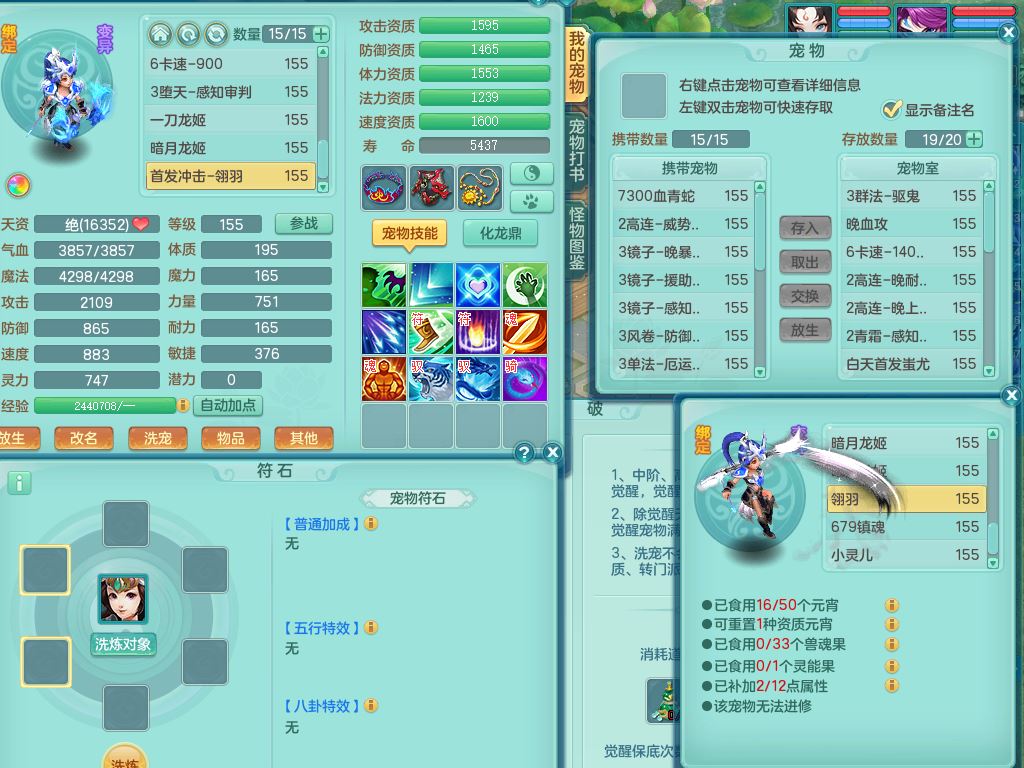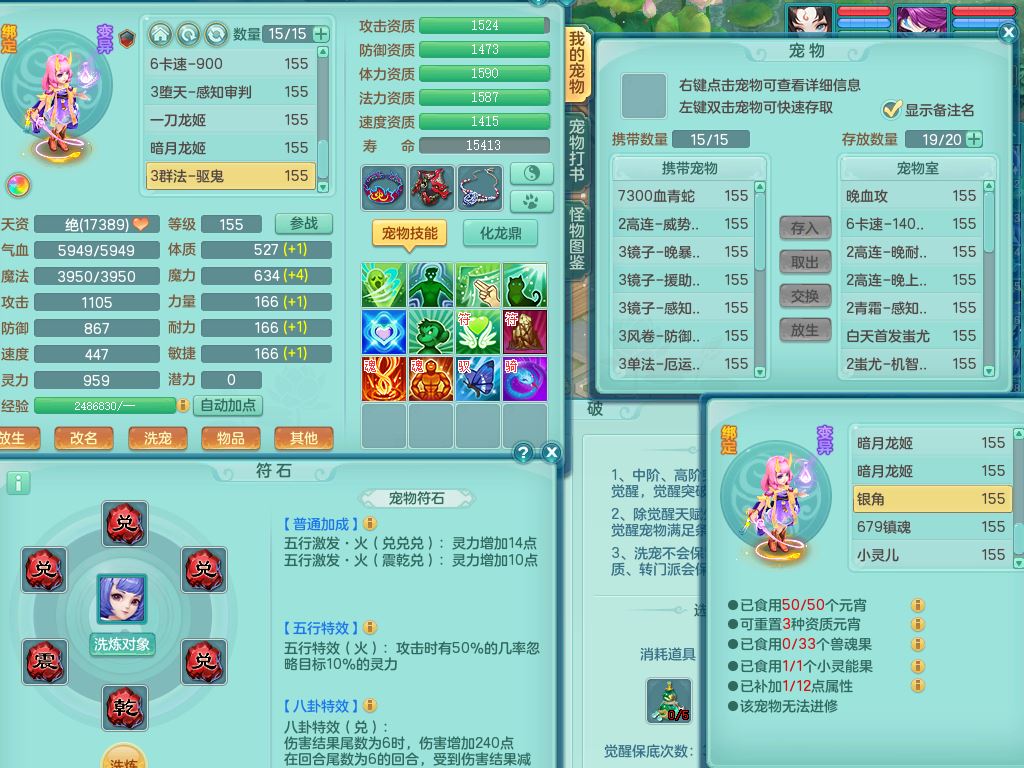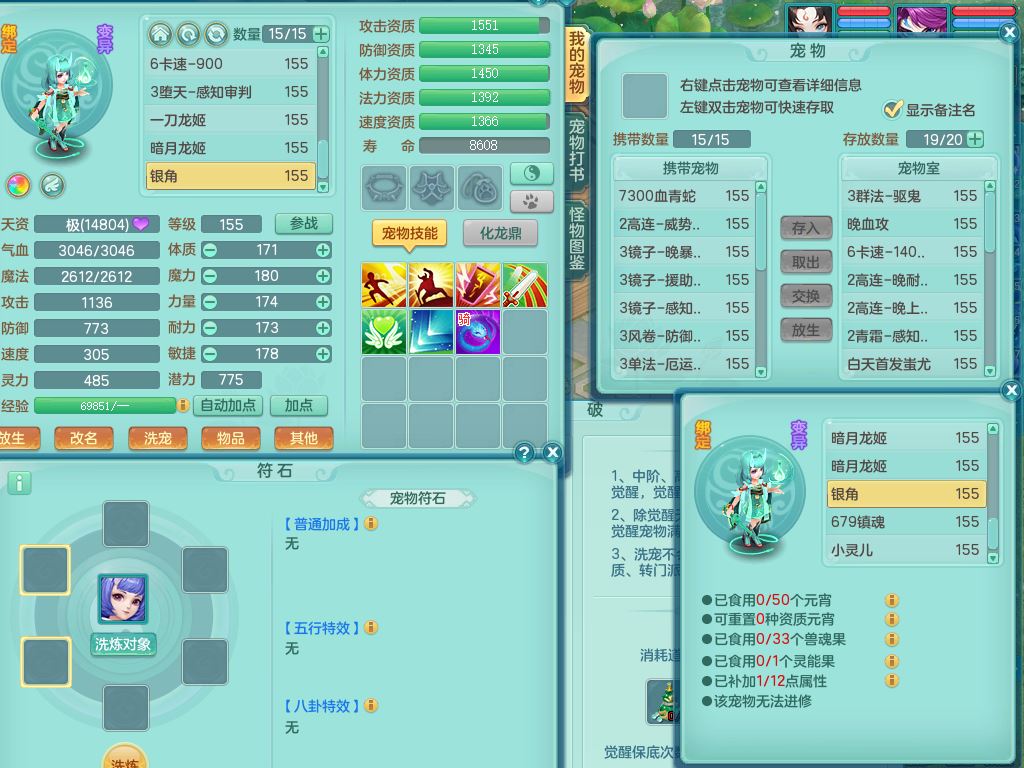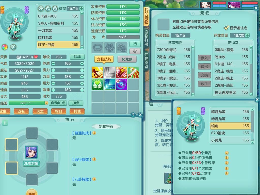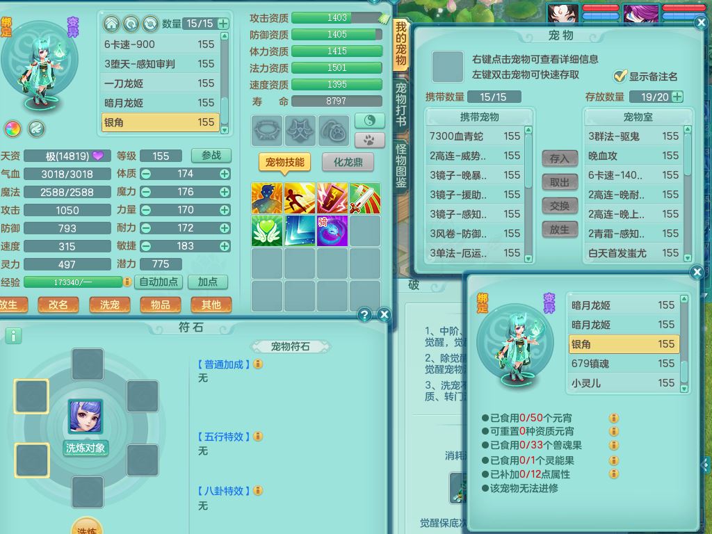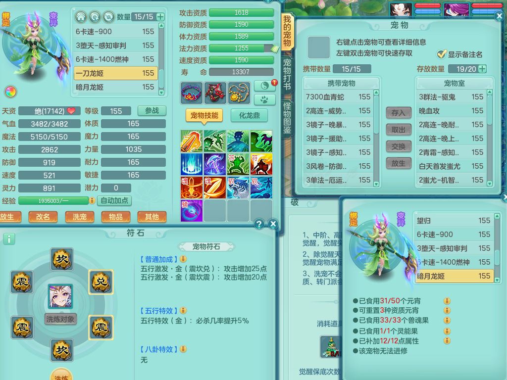 jt9655九天揽月159男灵月【潜龙号+暴龙逍客+西瓜冰】精灵舞,1龙(换)2内(1青蛇)2皮,3特殊(堕天/兽决月光/流星)3镜花灵2龙姬,16只满果子9觉醒7个纯6字,9红愤怒6特,躲避止戈衣服,法爆四海武器,愤怒守备腰带,鼎5.0+70+280,166天月卡,庭院151房屋152,3004金币,38内丹碎片,宠排在榜,2只双人坐骑,带150小号狮驼