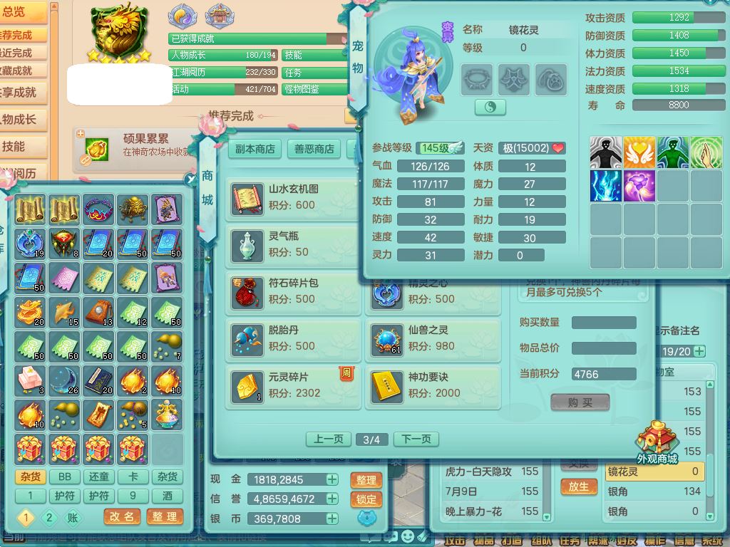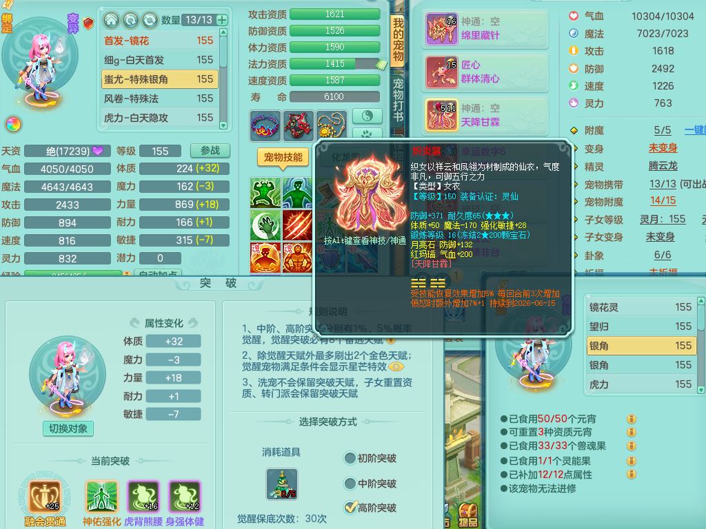 jt9669九天揽月159女地府精灵舞,满级共鸣,1内丹神,3特殊(荒古/风卷/灵傀兽决)2镜花灵,综合13只满果子6觉醒,9红愤怒5特,匠心玉清武器,幸运罗汉项链,Y明镜鞋,鼎5.0,永久外观,369W神武币,双人坐骑,带159天策