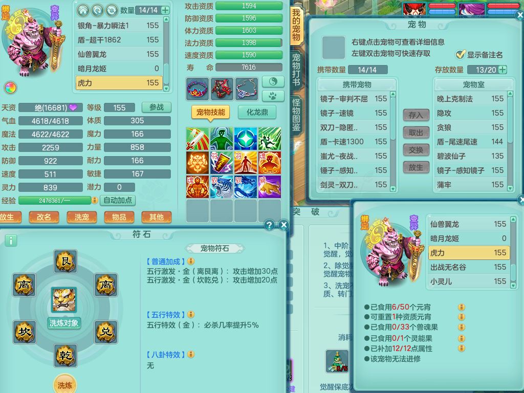tx9702天下无双159男万兽【潜龙号】精灵歌,1龙(换,无内)1内2特殊(青霜/藕断)2镜花灵,9只满果子7觉醒7个纯6字,9红,918狂暴双红武器,单加Y头,坚毅罗汉项链,Y野兽腰带,鼎5.5+70+280,70天月卡,永久头饰,29内丹碎片,双人坐骑