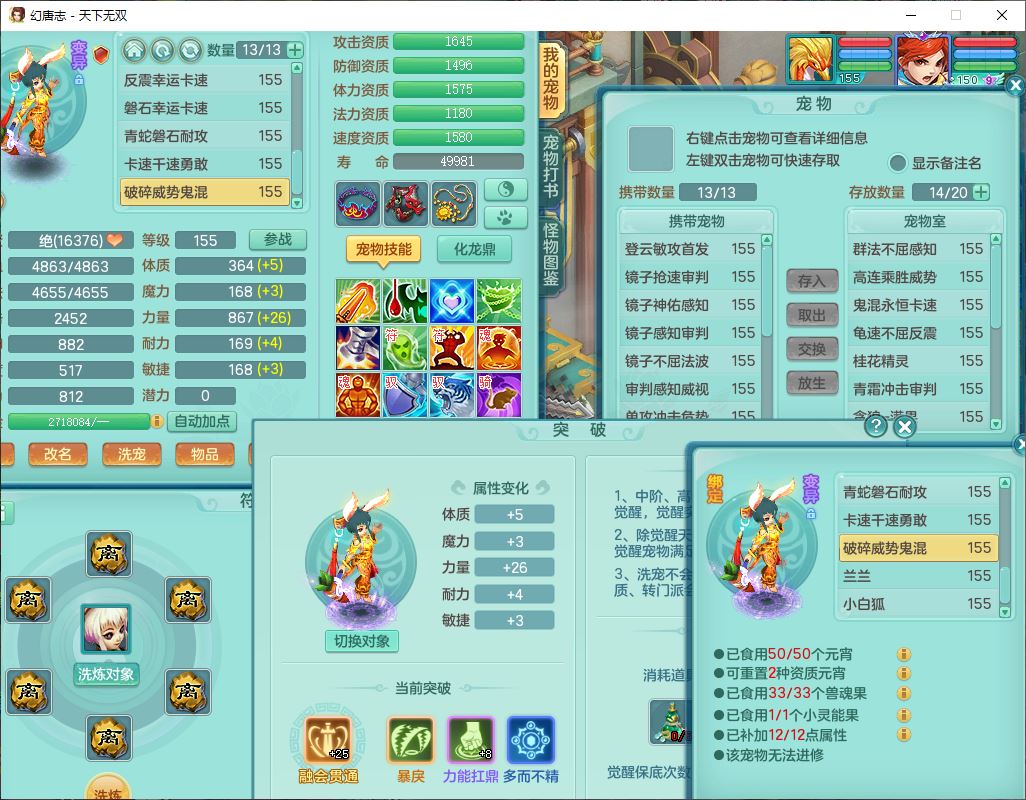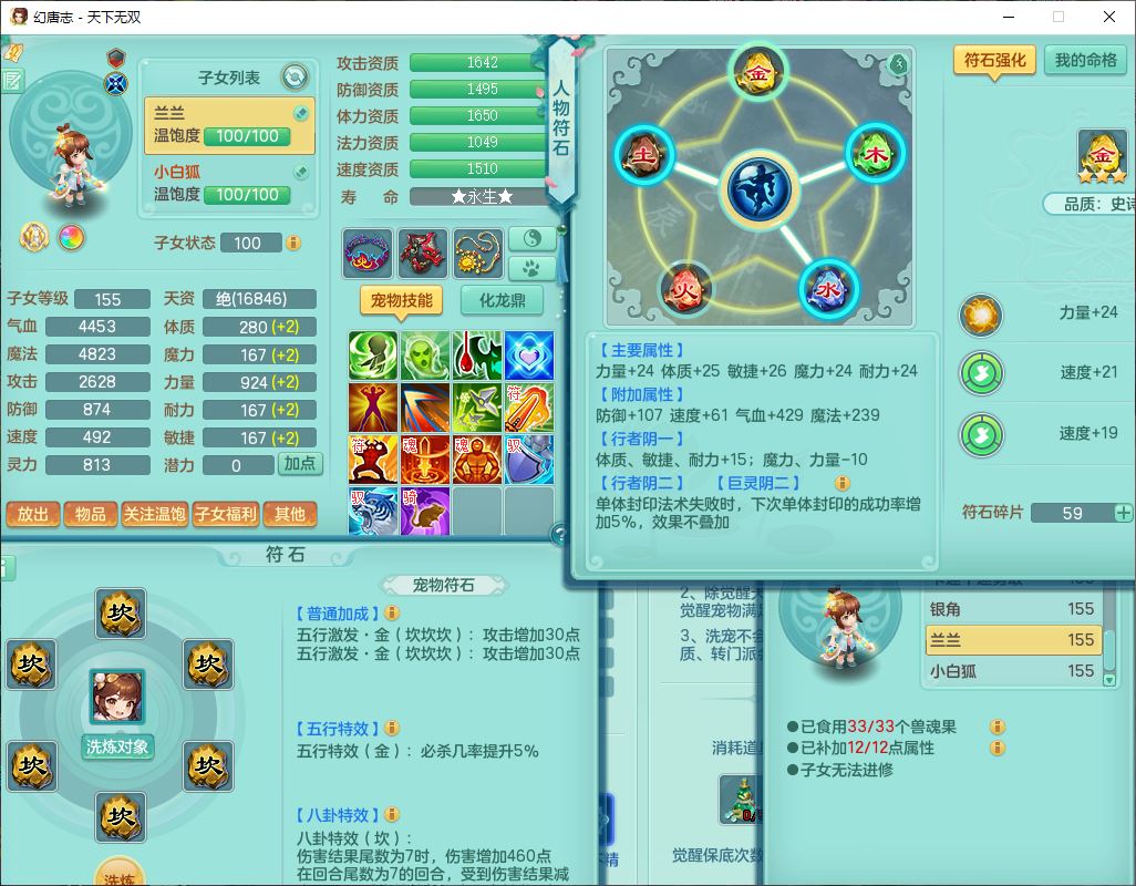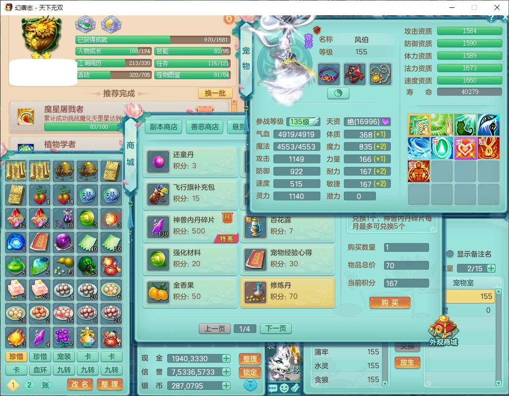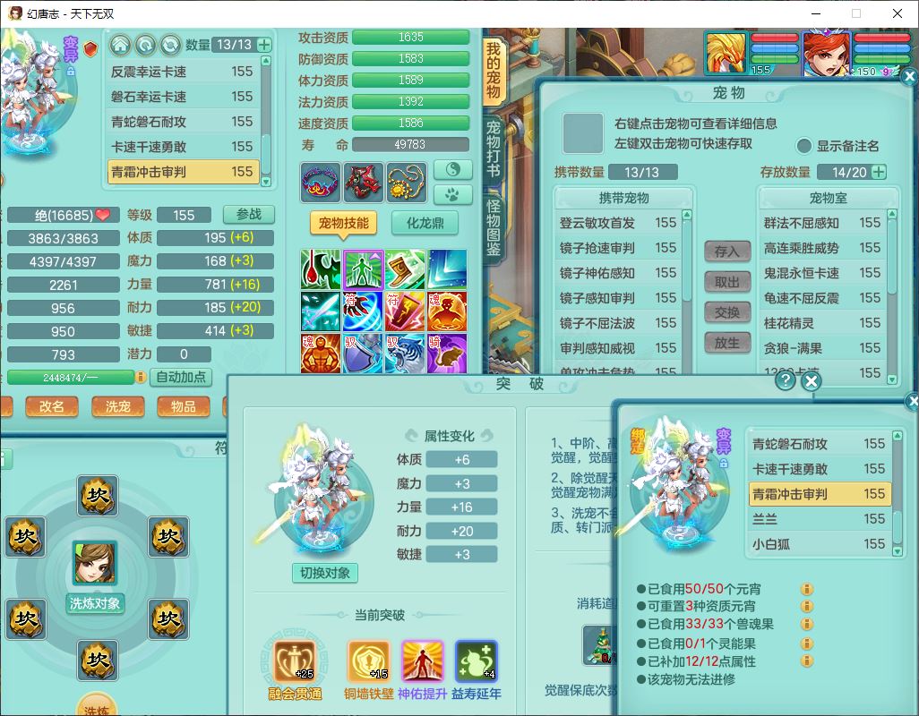 tx9724天下无双159男方寸【马上发财+暴龙洪荒+火焰之力+西瓜冰+潜龙过半】精灵舞,1青蛇(无内)1望归4镜花,7觉醒15六字1五字2四字18只满果子,10红装备,封印精通心神帽子,愤怒Y乱刃腰带,Y笑里鞋子,鼎5.5+70,133天月卡,庭院187房屋161,永久外观、精灵皮肤,11个仙兽灵,42个内丹碎片,1双人飞行坐骑,带159女天宫精灵怒,10红装备,318W神武币;159女万兽3镜花8红装备,287W神武币,1特殊兽决虎虎