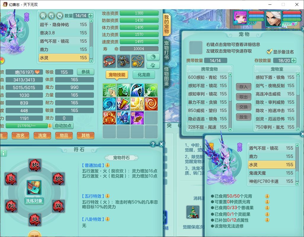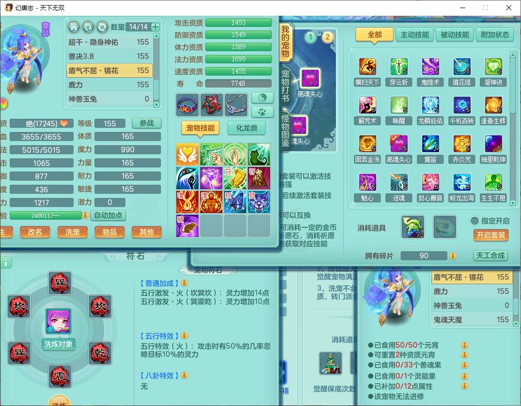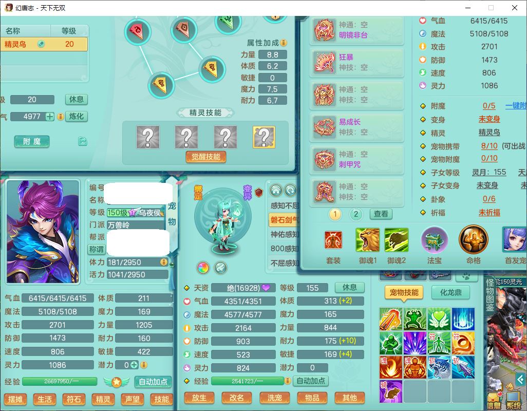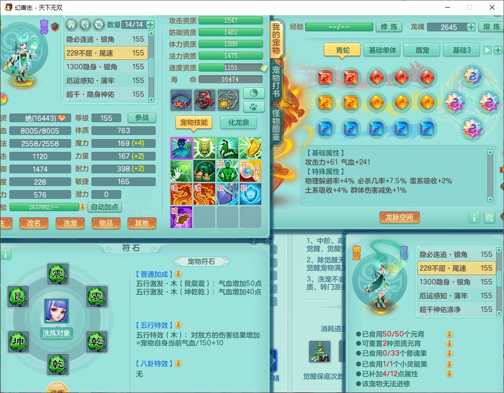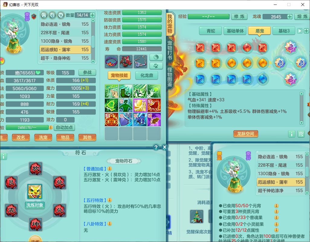 tx9736天下无双159男方寸精灵舞,带360W银币可转无量,还有套法爆法装备,仙龙5成就 1龙(换、无内)2神兽1内丹青蛇3镜花(1胚子)1望归,3觉醒2六字2五字7四字11只满果子,9红装备,Y罗汉帽子,神佑四海项链,迅捷激励鞋子,鼎5.0,2套符石,128天月卡,冰晶庭院166房屋164,永久头饰、精灵皮肤,34个内丹碎片,1双人坐骑,带150万兽奶粉