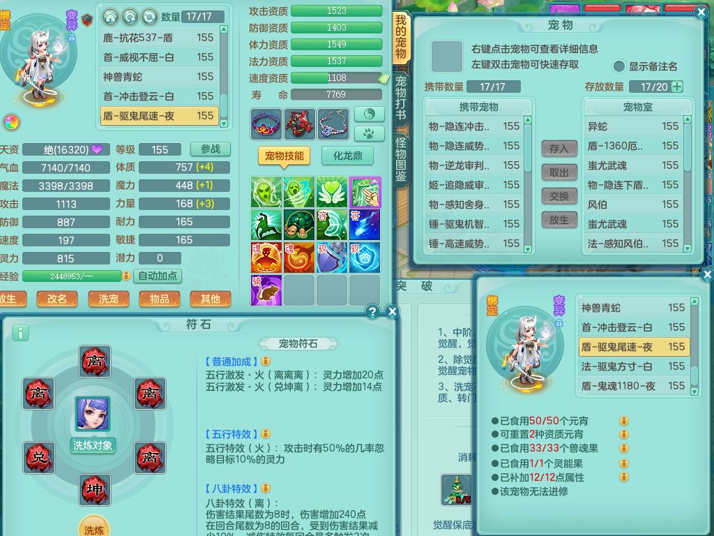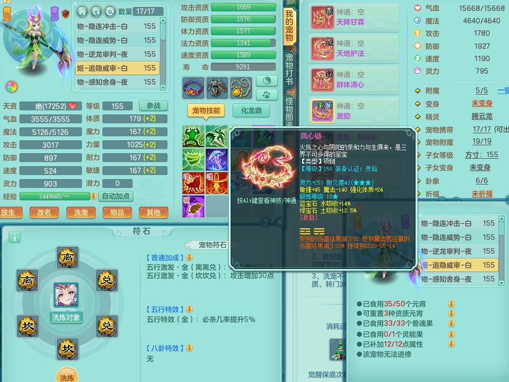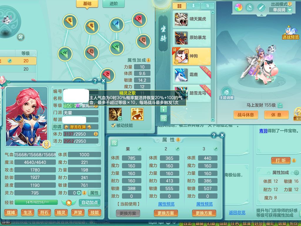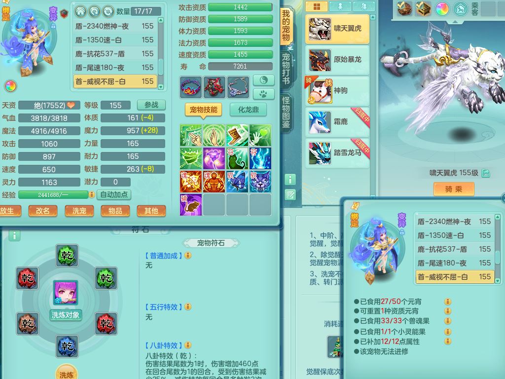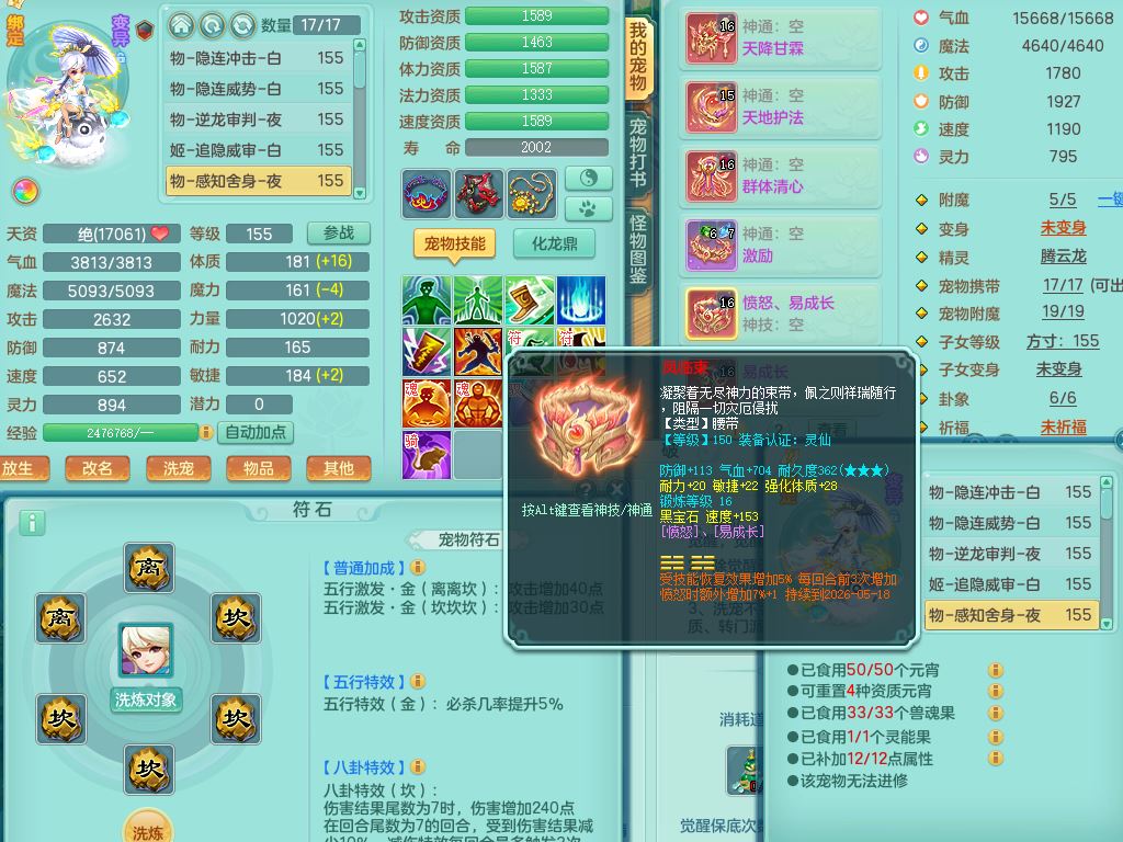 tx9752天下无双159女佛门【潜龙号+神驹马上发财+暴龙洪荒+火焰之力】精灵歌,1龙(换)3内(1青蛇)2破境1皮,4特殊(逆龙/舍身/登云/夺命兽诀)4镜花灵1龙姬,17格子21只满果子10觉醒8个纯6字,8红愤怒5特,愤怒Y腰带,单加Y止戈鞋,鼎6.0+70+280,2套符石,20天月卡,永久外观精灵皮肤,56内丹碎片,78果子,宠排在榜,3坐骑(2只双人)
