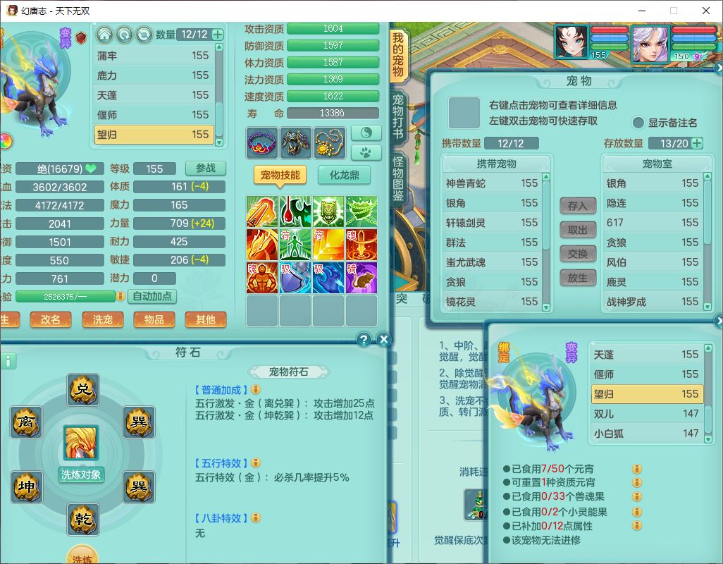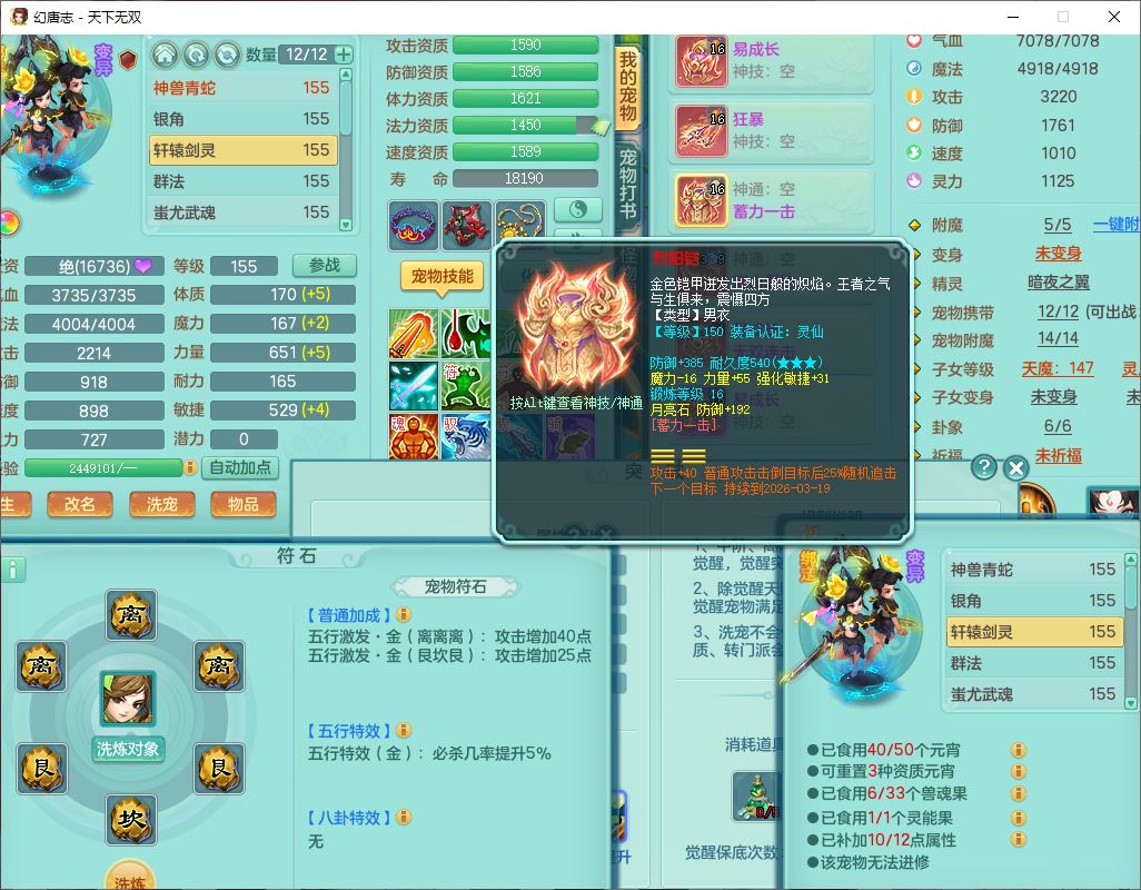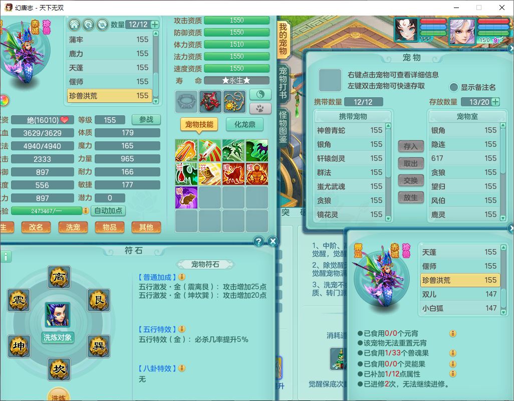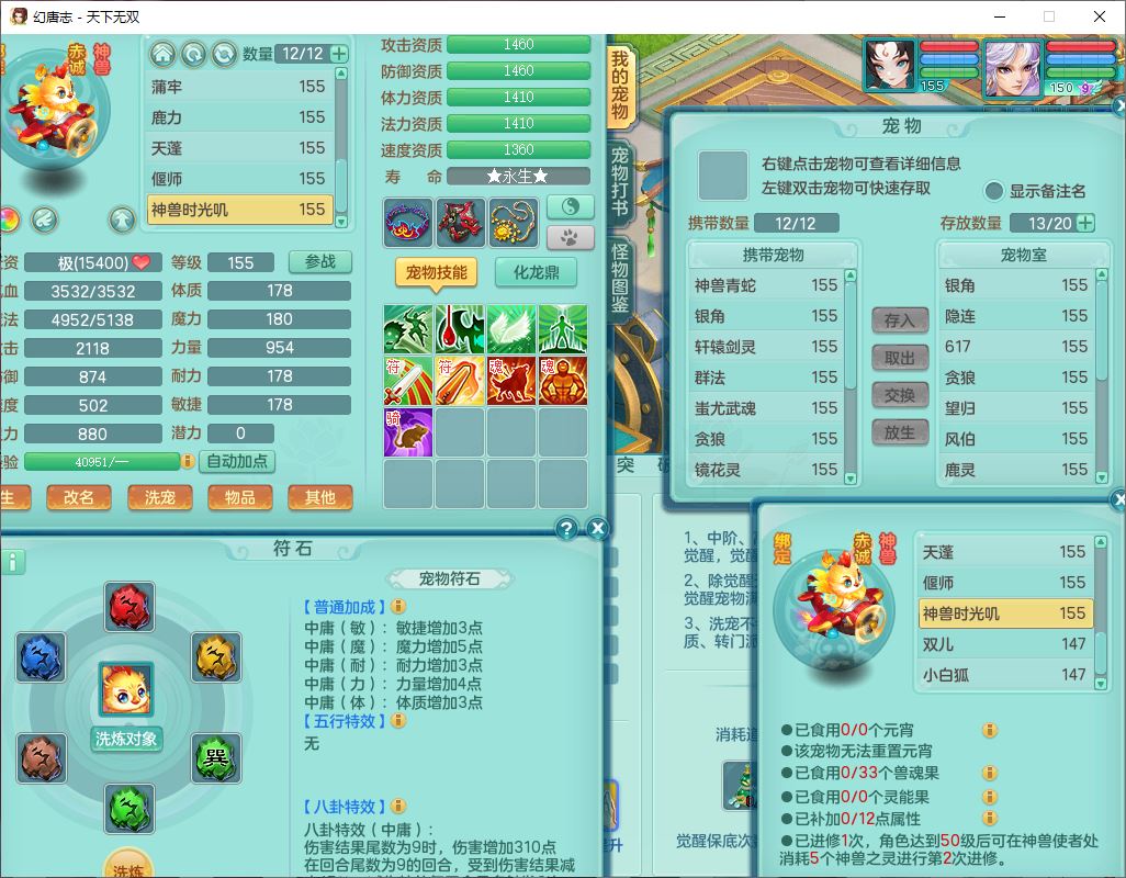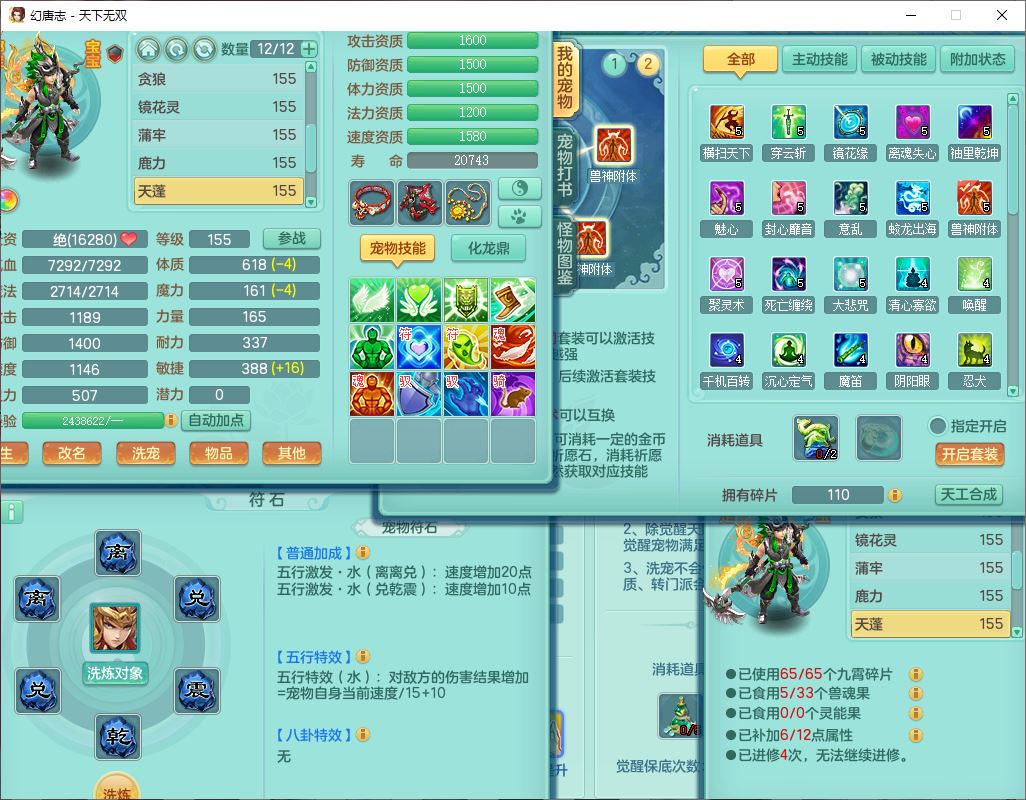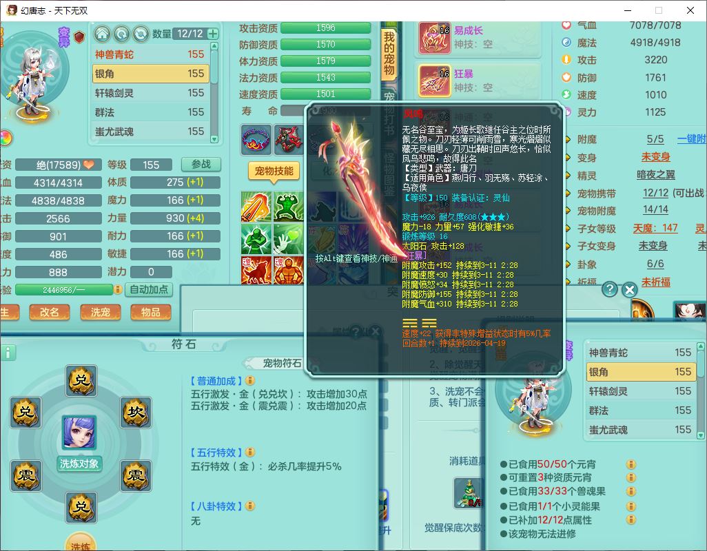tx9761天下无双159男万兽精灵歌,1内丹青蛇1神兽(无内)1望归1镜花,4觉醒,7红全单加装备,926狂暴武器,崩山项链,Y破血腰带,鼎5.0,永久背饰,20个仙兽灵,2476金币,1飞行坐骑