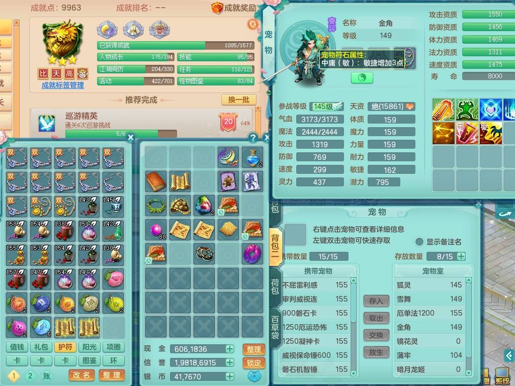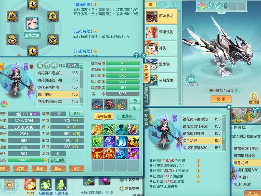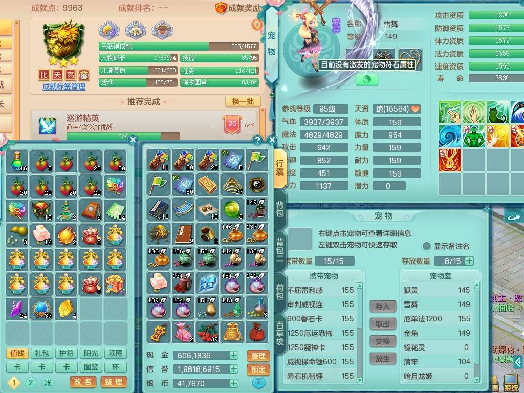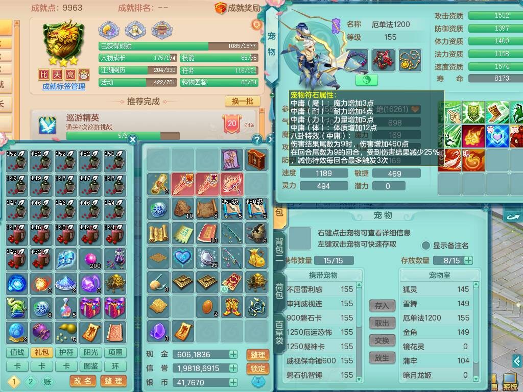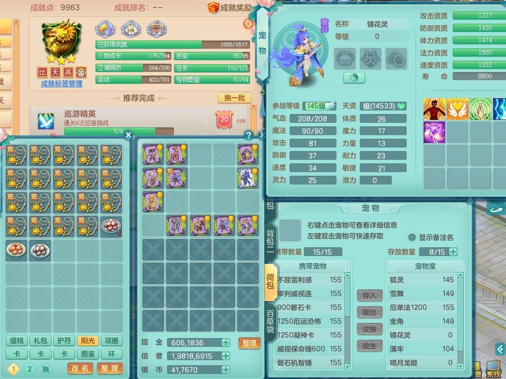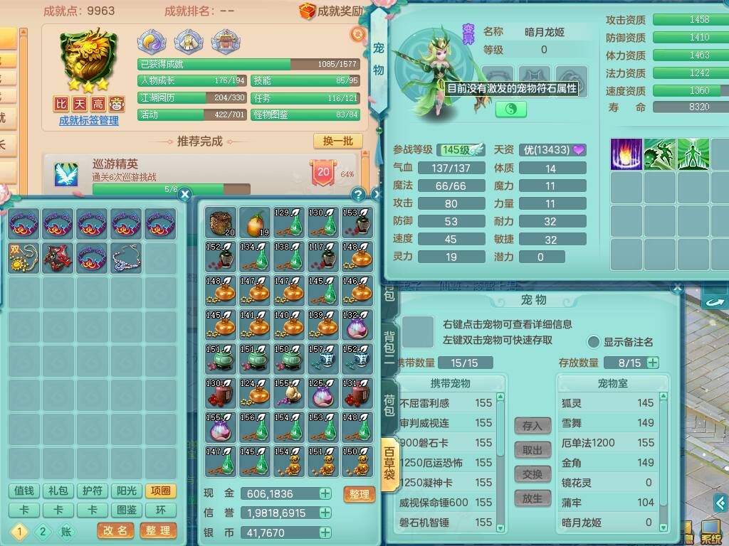 zn9762周年相伴156男天宫精灵舞,5龙2内胆神,3只觉醒,极品7位靓号AAAAABB,5宠皮,3只六技能镜花灵,1只六技能龙姬,崩山单加57衣服,幸运5破甲鞋,三红幸运7匠心四海项链,4.5基础鼎+70攻,10个纯六字,17只满果子,仓库还有120个果子,宠排在榜,修炼在榜,2只双人坐骑,暴龙泰坦+洪荒+逍客+神驹心想事成+红红火火+火焰之力武器+西瓜冰武器,仓库24神兽内胆碎片,冰晶庭院,39仙兽蛋,带153天月卡