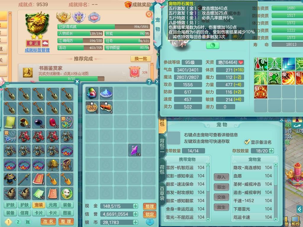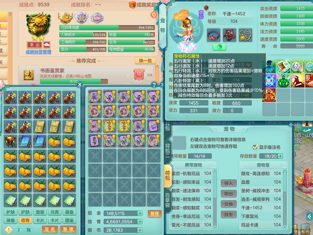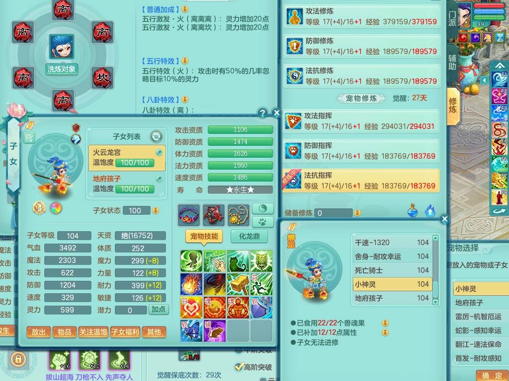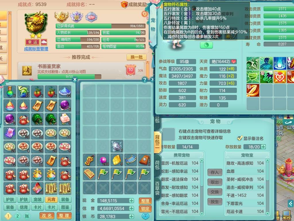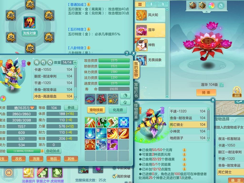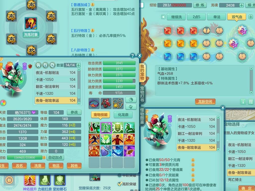 hh9772花好月圆99男龙宫,1龙1内胆神,【9只觉醒,已潜龙】,2宠皮,法爆易成长单加32武器,五雷单加31头,双法缭,法缭单加34衣服,法缭单加30鞋子,160易成长慈航项链,物理553易成长单加34武器,破甲单加32鞋子,破甲罗汉鞋子,迅捷破血单加34鞋子,2.5基础鼎+42攻+168血,9个纯六字,2个五字,20只满果子,仓库还有22个果子,34神兽内胆碎片,宠排在榜,神驹马到成功+火焰之力武器皮肤,带96天月卡