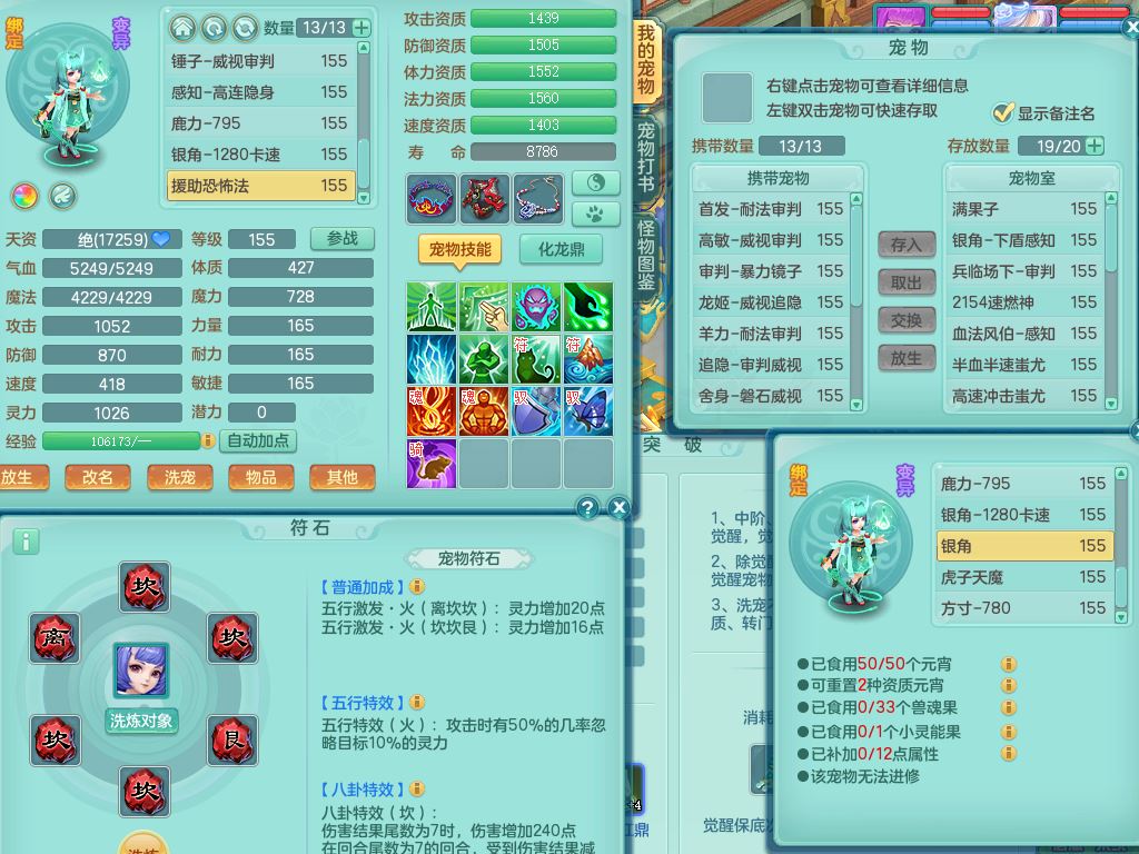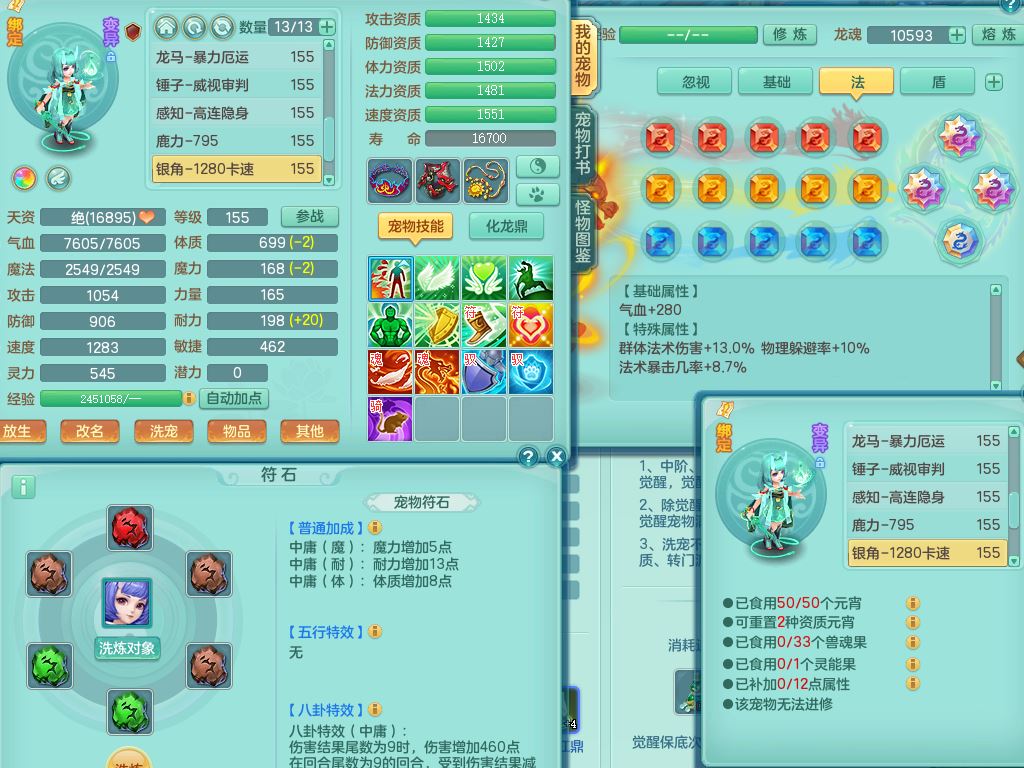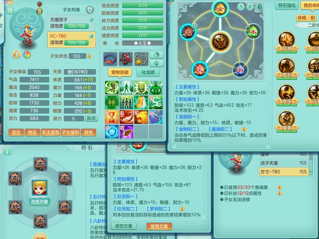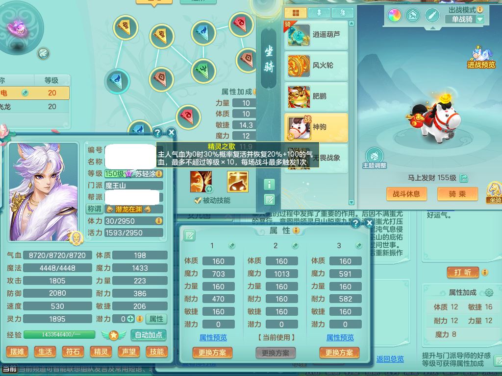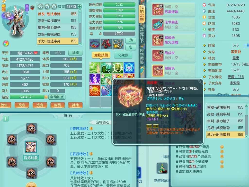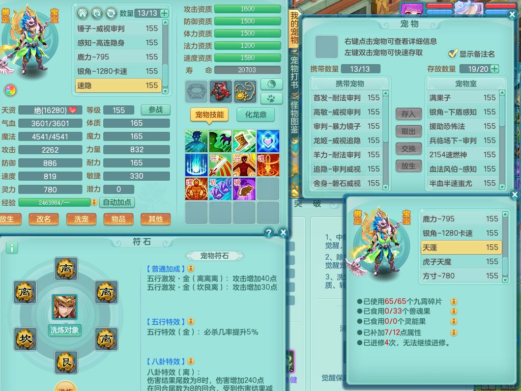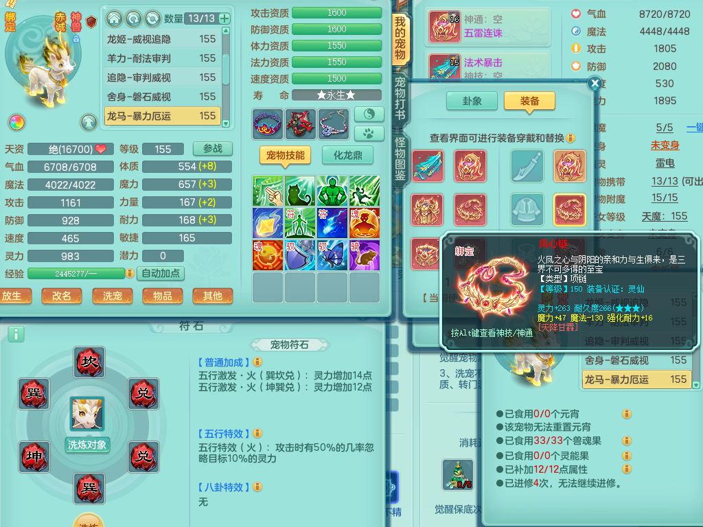qf9784清风明月159男魔王【潜龙号+神驹马上发财+火焰之力】精灵歌,1内丹龙马1特殊(舍身)3镜花灵,综合17只满果子7觉醒9个纯6字,全身单加,五雷头,Y烽火衣服,268Y项链,鼎5.5+70+280,2套符石,183天月卡,永久外观精灵皮肤,40仙兽灵,2坐骑(1只双人)