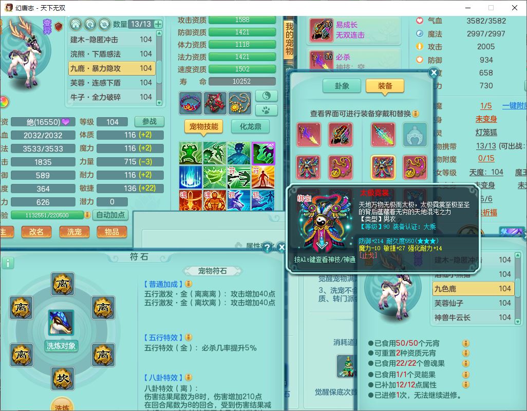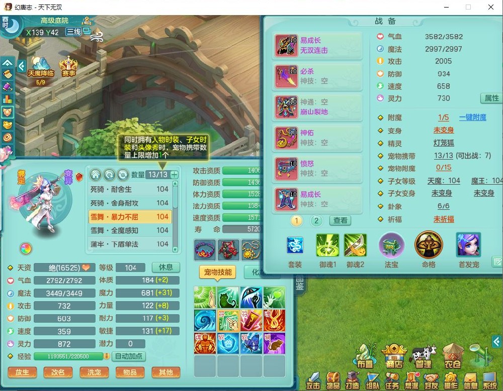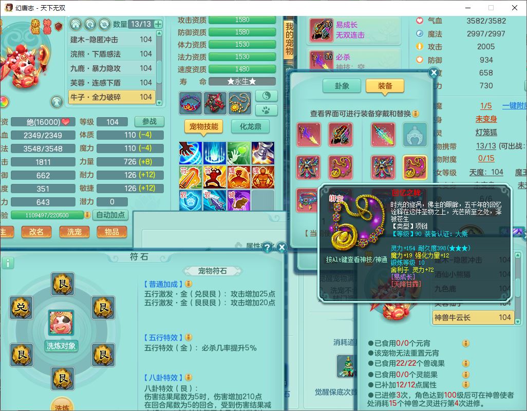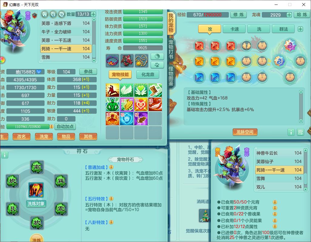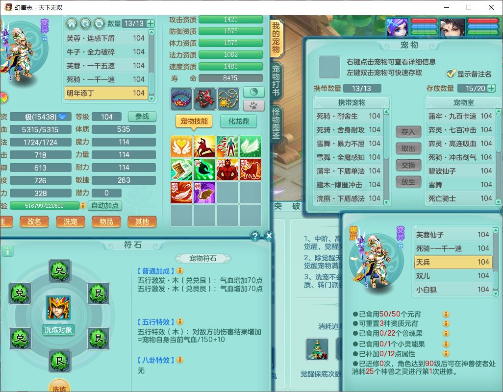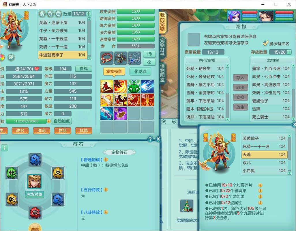 tx9799天下无双99男天宫【潜龙过半】全力精灵,1神兽1(无内)1建木2翻2舍身,5觉醒1六字4五字7四字综合13只满果子,7红装备,Y破血帽子,必杀武器,崩山衣服,一套辅助装,必杀群体激励武器,Y四海项链,鼎2.5+42+168,2套符石,32天月卡,永久头饰,24个仙兽灵,38个内丹碎片,仓库多存货,1双人坐骑,带双重