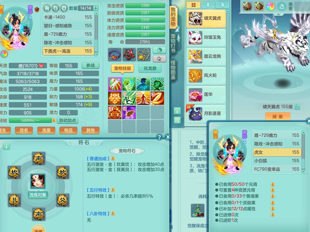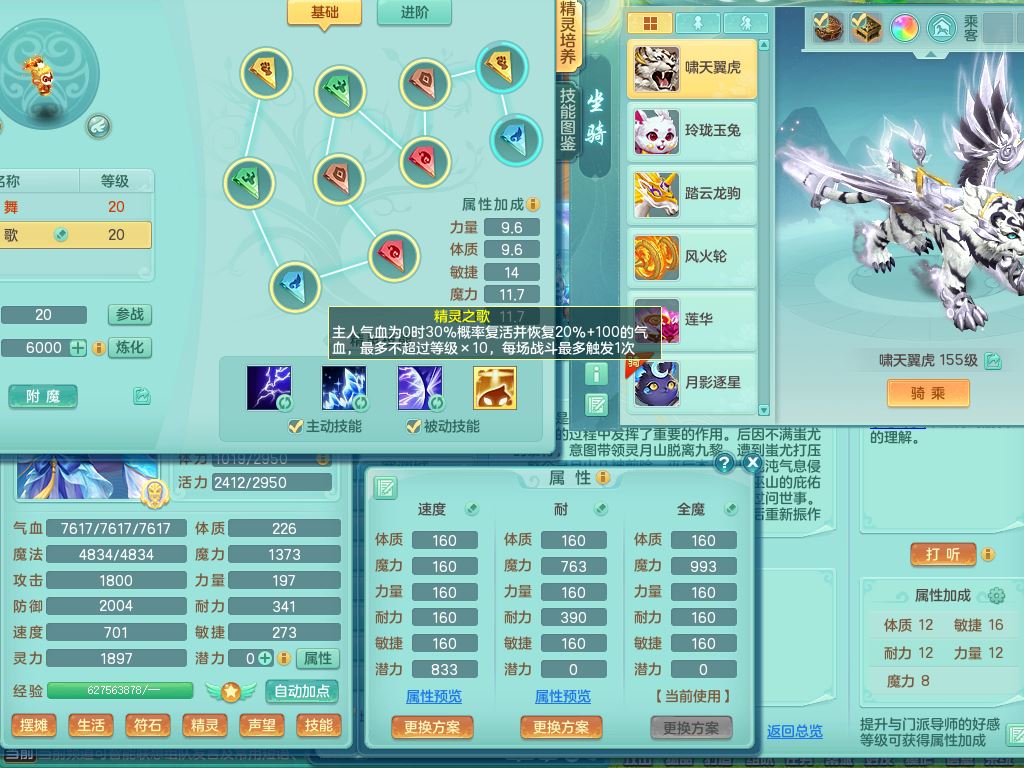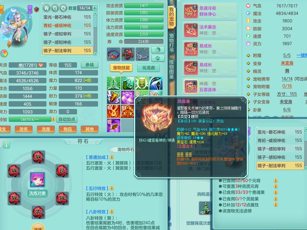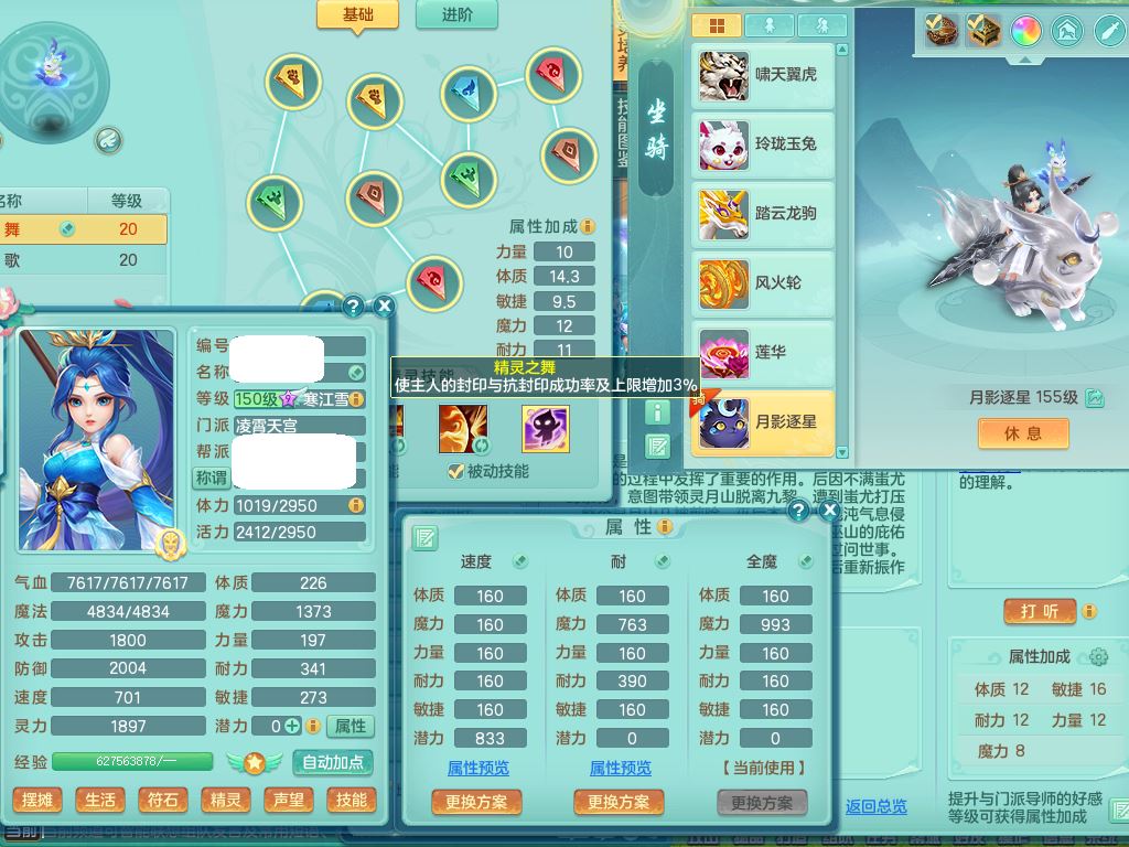 jt9809九天揽月159女天宫精灵歌+舞,4字靓号,6龙(换,无内)4内1破境,3特殊(雷光/兽决破碎/墨守)3镜花灵2龙姬,18只满果子5觉醒4个纯6字,单加急速晶清头,单加要衣服,274Y项链,五雷腰带,单加法缭鞋,鼎5.5+70+280,2套符石,104天月卡,永久外观精灵皮肤,宠排在榜,5坐骑(3只双人)