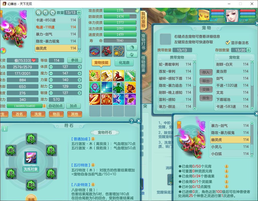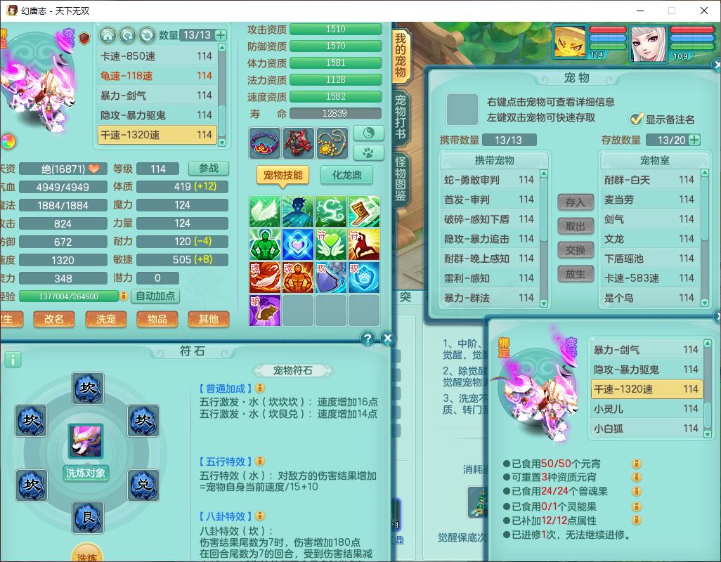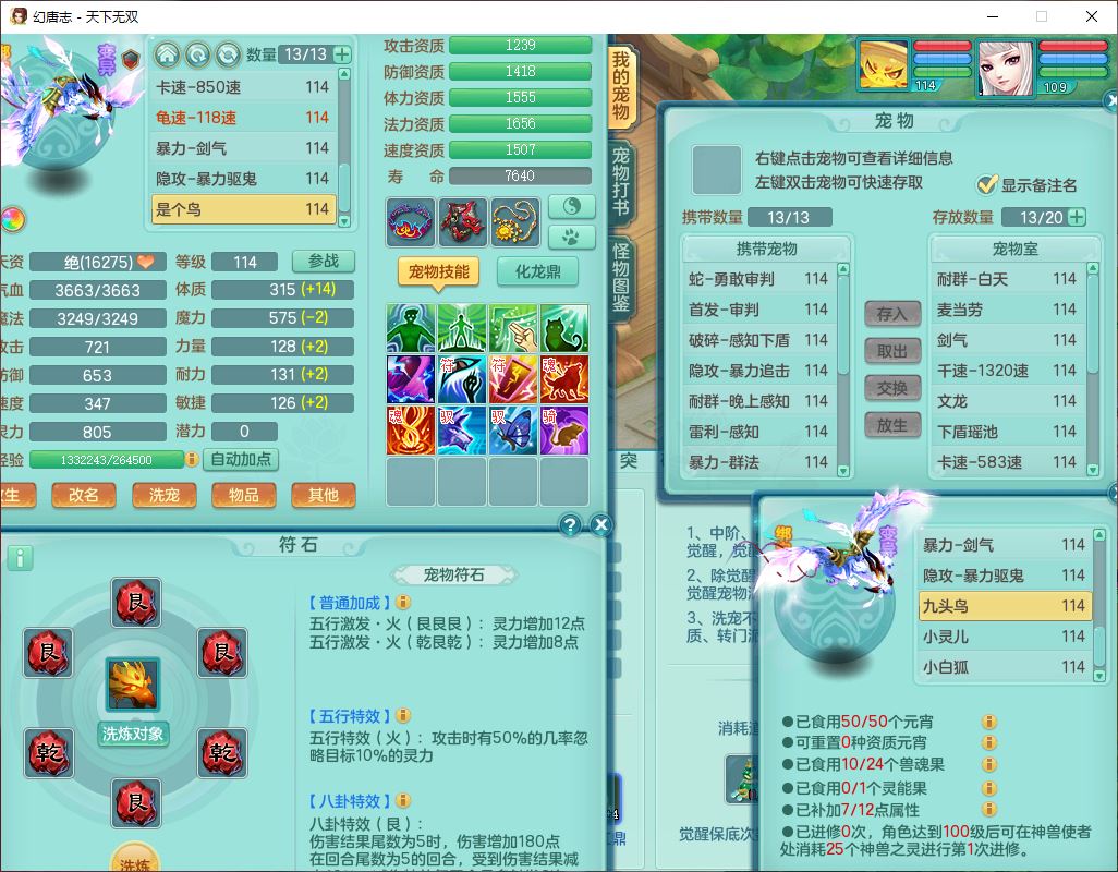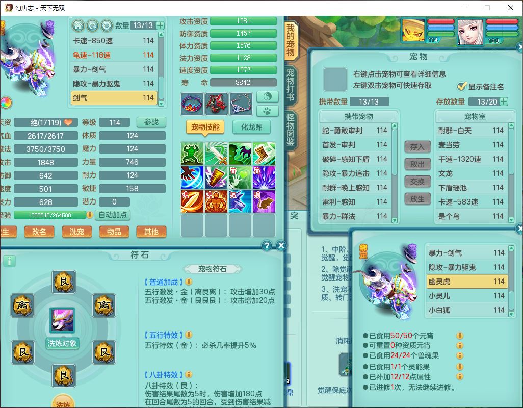 tx9810天下无双109女魔王【潜龙号】精灵歌,2内(1青蛇)1建木2雷利1六技能翻江妖鬼1金炉,7觉醒7六字2五字10四字20只满果子,7红双法缭装备,五雷帽子,法缭衣服、鞋子,Y真元项链,幸运止戈衣服,鼎2.5+42+168,2套符石,房屋155,永久外观、精灵皮肤,67个仙兽灵,1双人飞行坐骑,带两150奶粉