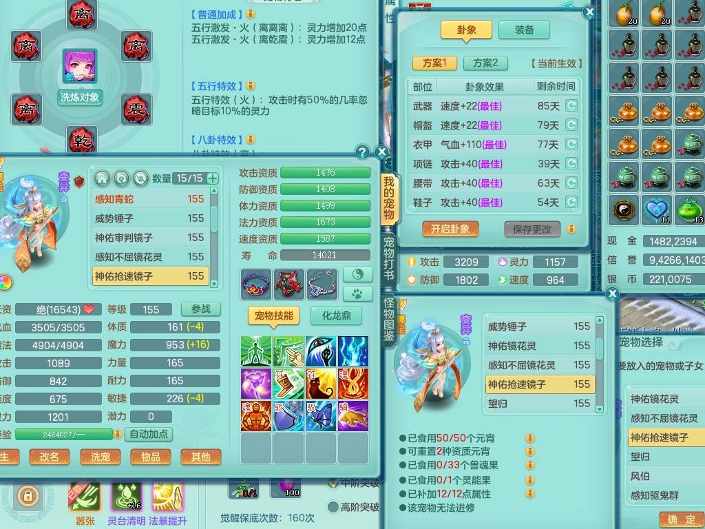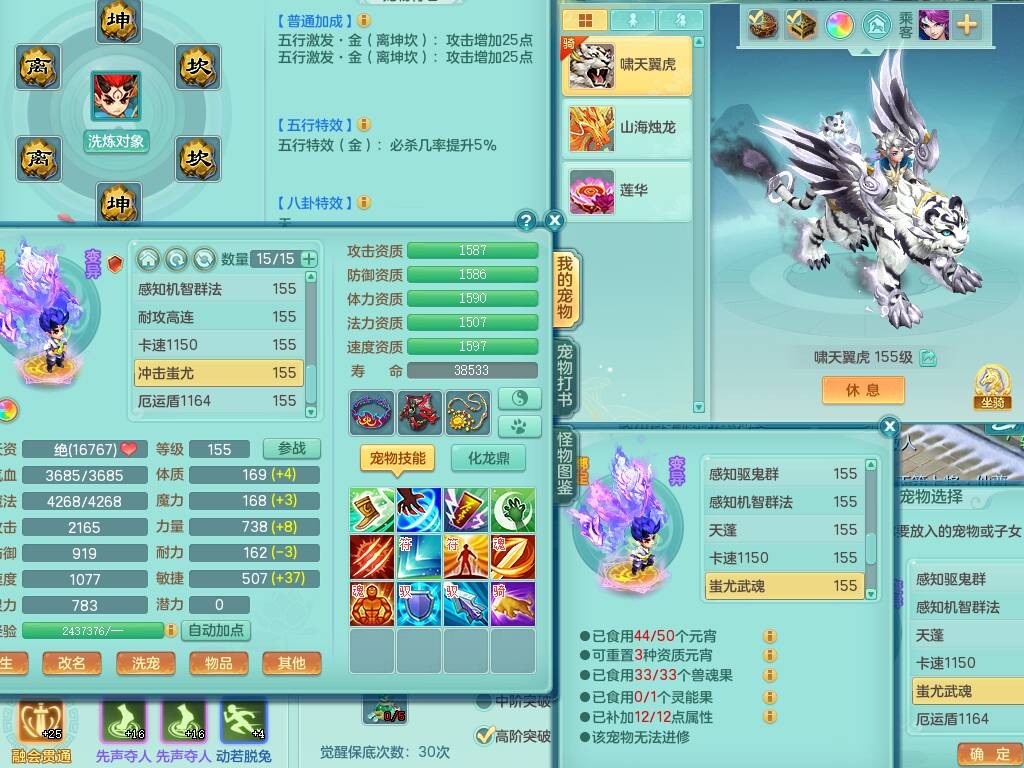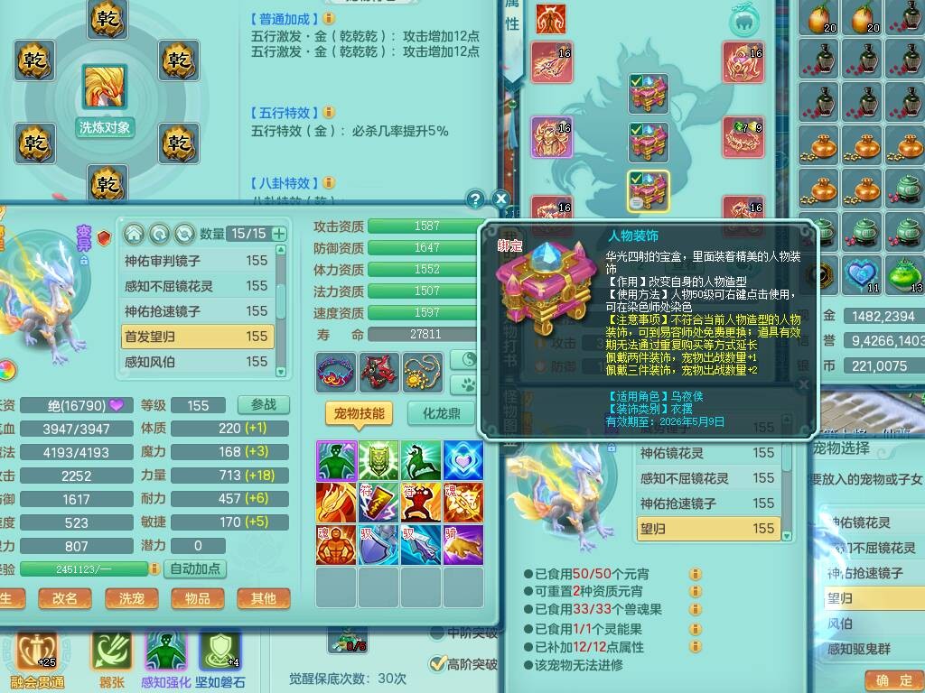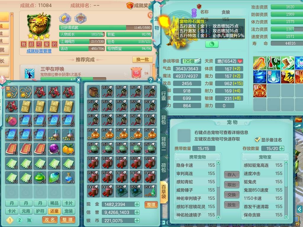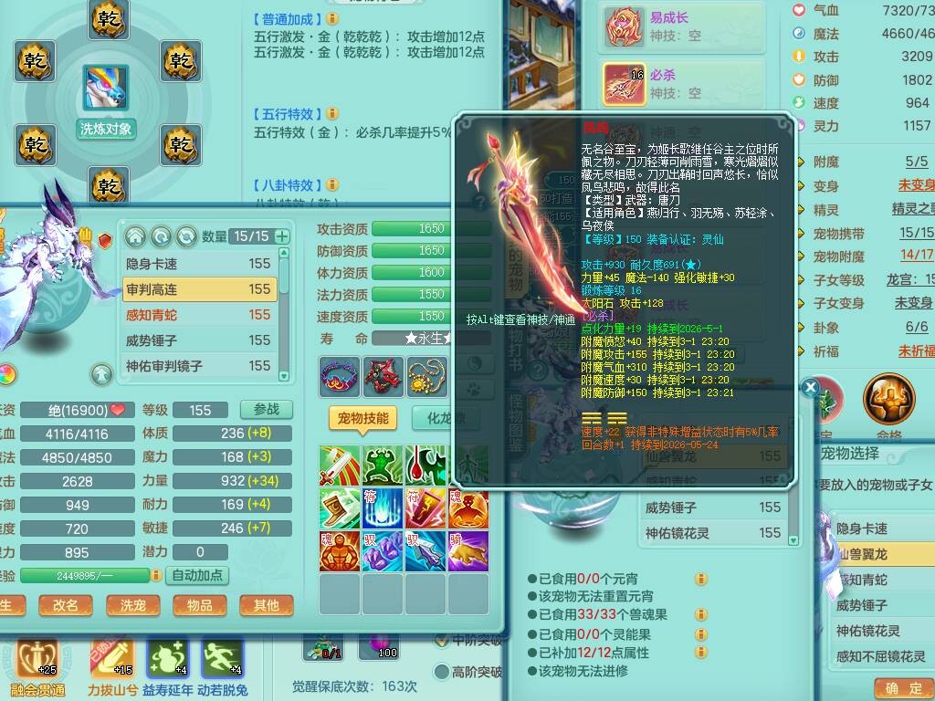 fh9838风华绝代159男万兽精灵舞,2龙(1龙无内),1内胆神,7只觉醒(潜龙条件化龙鼎差5个厚土龙纹,符石差2个附加属性,宠物6只满足),4特殊(雷厉,以战,号角,锤子),2只6技能镜花灵,930单加必杀武器,崩山单加衣服,5.5基础鼎+70攻,差1240积分14个格子,7个纯六字,15只满果子,宠排在榜,带二百多万银币,2只坐骑
