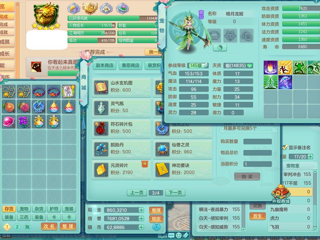 tx9847天下无双159男天魔【潜龙号+暴龙泰坦+西瓜冰】精灵舞,1龙(换,无内)1内丹龙马3皮,5镜花灵,1特殊(青霜)22只满果子11觉醒,神装12红星辰之拥,愤怒6特,封印水清头,封锁晶清武器,Y强壮野兽衣服,愤怒四海腰带,Y守备鞋,法系星辰之拥,法爆守备武器,法缭守护鞋,物理Y狂暴武器,Y崩山鞋,鼎5.5+70+280,196天月卡,庭院152,永久外观精灵皮肤,带头像券,宠排在榜,3只双人坐骑