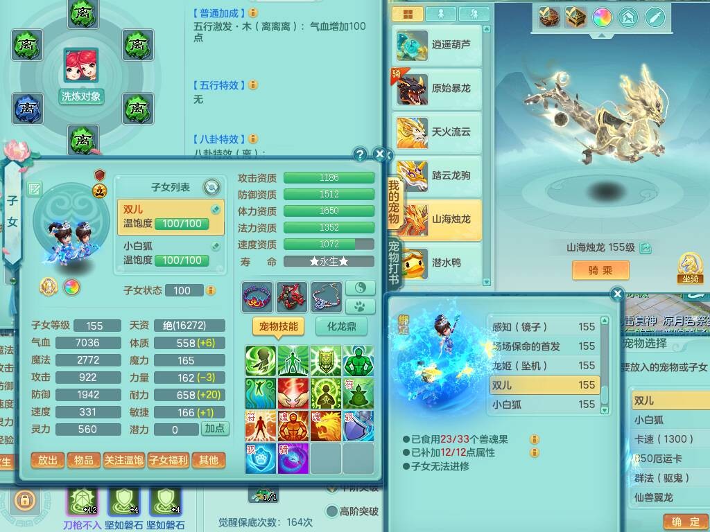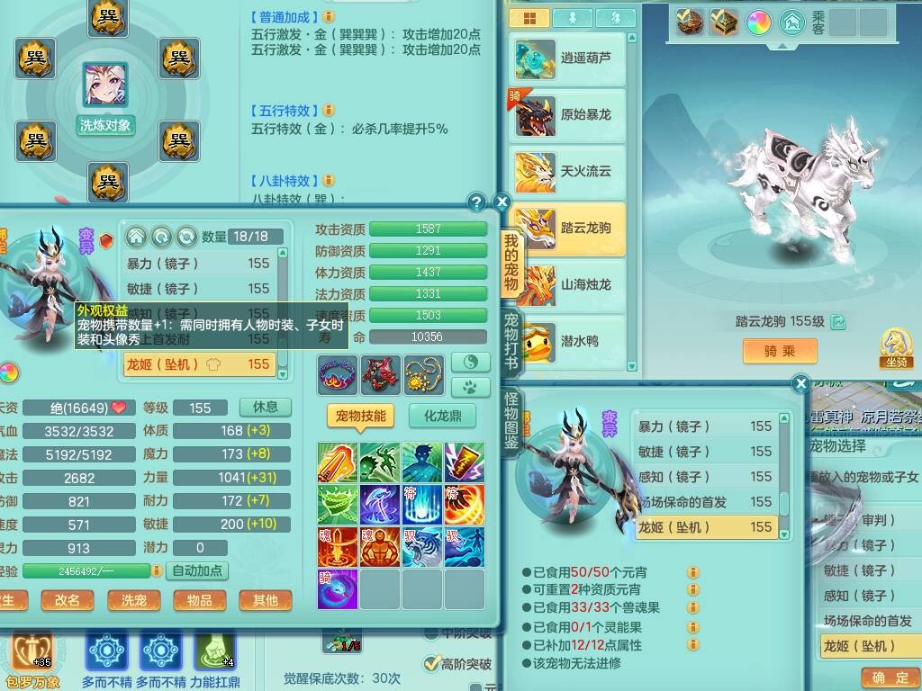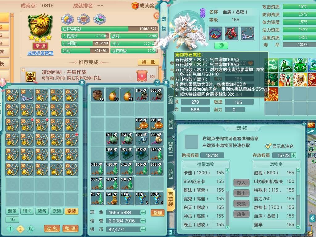 rj9865任剑逍遥159男天策精灵歌,9内胆龙,3内胆神+1神兽内丹,11只觉醒(准潜龙,只差4个主要属性),6宠皮+1幻灵果,8位靓号,3只6技能镜花灵,1只6技能龙姬,崩山单加55头,神佑法术反制单加55链子,易成长单加50腰带,5.5基础鼎+70攻,280血,物理躲避10%,15个格子,28个纯六字,4个5字,25只满果子,家里仓库BB还有6只满果子,宠排在榜,6只坐骑+西瓜冰武器+火焰之力,月卡还有179天。带2个159奶粉